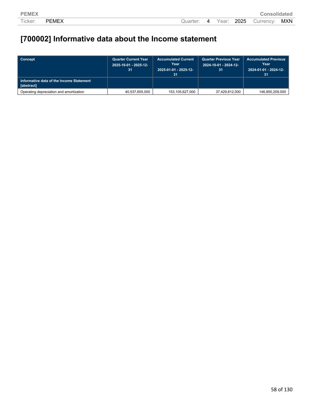 PEMEX Consolidated Ticker: PEMEX Quarter: 4 Year: 2025 Currency: MXN 58 of 130 [700002] Informative data about the Income statement Concept Quarter Current Year 2025-10-01 - 2025-12- 31 Accumulated Current Year 2025-01-01 - 2025-12- 31 Quarter Previous Year 2024-10-01 - 2024-12- 31 Accumulated Previous Year 2024-01-01 - 2024-12- 31 Informative data of the Income Statement [abstract] Operating depreciation and amortization 40,537,655,000 153,105,627,000 37,429,812,000 146,850,209,000