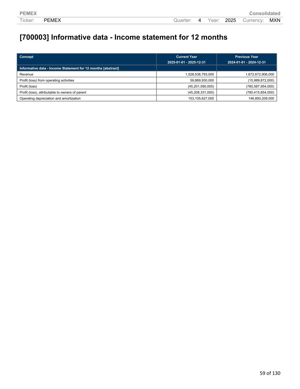 PEMEX Consolidated Ticker: PEMEX Quarter: 4 Year: 2025 Currency: MXN 59 of 130 [700003] Informative data - Income statement for 12 months Concept Current Year 2025-01-01 - 2025-12-31 Previous Year 2024-01-01 - 2024-12-31 Informative data - Income Statement for 12 months [abstract] Revenue 1,528,538,793,000 1,672,672,906,000 Profit (loss) from operating activities 59,869,930,000 (15,989,872,000) Profit (loss) (45,201,590,000) (780,587,954,000) Profit (loss), attributable to owners of parent (45,208,331,000) (780,415,854,000) Operating depreciation and amortization 153,105,627,000 146,850,209,000