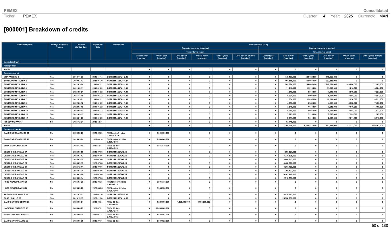 PEMEX Consolidated Ticker: PEMEX Quarter: 4 Year: 2025 Currency: MXN 60 of 130 [800001] Breakdown of credits Denomination [axis] Domestic currency [member] Foreign currency [member] Time interval [axis] Time interval [axis] Institution [axis] Foreign institution (yes/no) Contract signing date Expiration date Interest rate Current year [member] Until 1 year [member] Until 2 years [member] Until 3 years [member] Until 4 years [member] Until 5 years or more [member] Current year [member] Until 1 year [member] Until 2 years [member] Until 3 years [member] Until 4 years [member] Until 5 years or more [member] Banks [abstract] Foreign trade TOTAL 0 0 0 0 0 0 0 0 0 0 0 0 Banks - secured BNP PARIBAS 1 Yes 2018-11-30 2028-11-14 SOFR 6M 2.96% + 2.03 0 0 0 0 0 0 0 449,168,000 449,168,000 449,168,000 0 0 SUMITOMO MITSUI BA 2 Yes 2019-07-17 2028-01-29 SOFR 6M 3.28% + 1.27 0 0 0 0 0 0 0 464,666,000 464,666,000 232,333,000 0 0 SUMITOMO MITSUI BA 3 Yes 2021-02-04 2031-01-22 SOFR 6M 4.22% + 1.81 0 0 0 0 0 0 0 249,684,000 249,684,000 249,684,000 249,684,000 372,187,000 SUMITOMO MITSUI BA 4 Yes 2021-08-11 2031-01-22 SOFR 6M 4.22% + 1.81 0 0 0 0 0 0 0 11,216,000 11,216,000 11,216,000 11,216,000 16,824,000 SUMITOMO MITSUI BA 5 Yes 2021-09-21 2031-01-22 SOFR 6M 4.22% + 1.81 0 0 0 0 0 0 0 4,818,000 4,818,000 4,818,000 4,818,000 7,227,000 SUMITOMO MITSUI BA 6 Yes 2021-11-16 2031-01-22 SOFR 6M 4.22% + 1.81 0 0 0 0 0 0 0 5,994,000 5,994,000 5,994,000 5,994,000 8,991,000 SUMITOMO MITSUI BA 7 Yes 2022-03-01 2031-01-22 SOFR 6M 4.22% + 1.81 0 0 0 0 0 0 0 12,034,000 12,034,000 12,034,000 12,034,000 18,051,000 SUMITOMO MITSUI BA 8 Yes 2022-05-12 2031-01-22 SOFR 6M 4.22% + 1.81 0 0 0 0 0 0 0 4,958,000 4,958,000 4,958,000 4,958,000 7,438,000 SUMITOMO MITSUI BA 9 Yes 2022-07-18 2031-01-22 SOFR 6M 4.22% + 1.81 0 0 0 0 0 0 0 7,646,000 7,646,000 7,646,000 7,646,000 11,469,000 SUMITOMO MITSUI BA 10 Yes 2022-08-11 2031-01-22 SOFR 6M 4.22% + 1.81 0 0 0 0 0 0 0 5,051,000 5,051,000 5,051,000 5,051,000 7,577,000 SUMITOMO MITSUI BA 11 Yes 2022-09-15 2031-01-22 SOFR 6M 4.22% + 1.81 0 0 0 0 0 0 0 7,725,000 7,725,000 7,725,000 7,725,000 11,587,000 SUMITOMO MITSUI BA 12 Yes 2023-01-20 2031-01-22 SOFR 6M 4.22% + 1.81 0 0 0 0 0 0 0 2,611,000 2,611,000 2,611,000 2,611,000 3,916,000 INT DEV NO PAG 13 No 2025-12-31 2025-12-31 0 0 0 0 0 0 0 83,745,000 0 0 0 0 TOTAL 0 0 0 0 0 0 0 1,309,316,000 1,225,571,000 993,238,000 311,737,000 465,267,000 Commercial banks BANCO MERCANTIL DE 14 No 2025-02-20 2026-02-20 TIIE fondeo 91 días 7.54% + 3.70 0 2,000,000,000 0 0 0 0 0 0 0 0 0 0 BANCO MERCANTIL DE 15 No 2025-03-24 2026-03-18 TIIE fondeo 182 días 7.92%+3.70 0 2,500,000,000 0 0 0 0 0 0 0 0 0 0 BBVA BANCOMER SA 16 No 2024-12-19 2026-12-17 TIIE a 28 días 7.52%+2.25 0 2,861,139,000 0 0 0 0 0 0 0 0 0 0 DEUTSCHE BANK AG 17 Yes 2024-07-05 2026-07-06 SOFR 1M 3.82%+2.15 0 0 0 0 0 0 0 1,895,877,000 0 0 0 0 DEUTSCHE BANK AG 18 Yes 2024-07-17 2026-07-06 SOFR 1M 3.82%+2.15 0 0 0 0 0 0 0 3,335,575,000 0 0 0 0 DEUTSCHE BANK AG 19 Yes 2024-07-30 2026-07-06 SOFR 1M 3.82%+2.15 0 0 0 0 0 0 0 3,680,713,000 0 0 0 0 DEUTSCHE BANK AG 20 Yes 2024-09-13 2026-07-06 SOFR 1M 3.82%+2.15 0 0 0 0 0 0 0 4,468,760,000 0 0 0 0 DEUTSCHE BANK AG 21 Yes 2024-12-11 2026-07-06 SOFR 1M 3.82%+2.15 0 0 0 0 0 0 0 3,267,409,000 0 0 0 0 DEUTSCHE BANK AG 22 Yes 2025-01-24 2026-07-06 SOFR 1M 3.82%+2.15 0 0 0 0 0 0 0 7,365,123,000 0 0 0 0 DEUTSCHE BANK AG 23 Yes 2025-02-06 2026-07-06 SOFR 1M 3.82%+2.15 0 0 0 0 0 0 0 6,567,922,000 0 0 0 0 DEUTSCHE BANK AG 24 Yes 2025-02-14 2026-07-06 SOFR 1M 3.82%+2.15 0 0 0 0 0 0 0 2,518,936,000 0 0 0 0 HSBC MEXICO SA INS 25 No 2025-03-26 2026-03-25 TIIE fondeo 182 días 7.93%+3.75 0 2,986,338,000 0 0 0 0 0 0 0 0 0 0 HSBC MEXICO SA INS 26 No 2025-03-26 2026-03-25 TIIE fondeo 182 días 9.72%+2.00 0 2,986,338,000 0 0 0 0 0 0 0 0 0 0 THE BANK OF NOVA S 27 Yes 2021-07-21 2026-01-16 SOFR 3M 3.86% + 4.54 0 0 0 0 0 0 0 13,474,373,000 0 0 0 0 GLAS USA LLC 28 Yes 2019-12-13 2026-11-30 SOFR 1M 2.70% + 4.85 0 0 0 0 0 0 0 26,950,050,000 0 0 0 0 BANCO NAC DE OBRAS 29 No 2023-05-24 2028-05-24 TIIE a 28 días 7.56%+3.50 0 1,520,000,000 1,520,000,000 13,680,000,000 0 0 0 0 0 0 0 0 NACIONAL FINANCIER 30 No 2024-06-25 2026-07-31 TIIE a 28 días 7.78%+2.70 0 10,600,608,000 0 0 0 0 0 0 0 0 0 0 BANCO NAC DE OBRAS 31 No 2024-06-25 2026-07-31 TIIE a 28 días 7.78%+2.70 0 4,838,497,000 0 0 0 0 0 0 0 0 0 0 BANCO NACIONAL DE 32 No 2024-06-25 2026-07-31 TIIE a 28 días 0 5,669,522,000 0 0 0 0 0 0 0 0 0 0