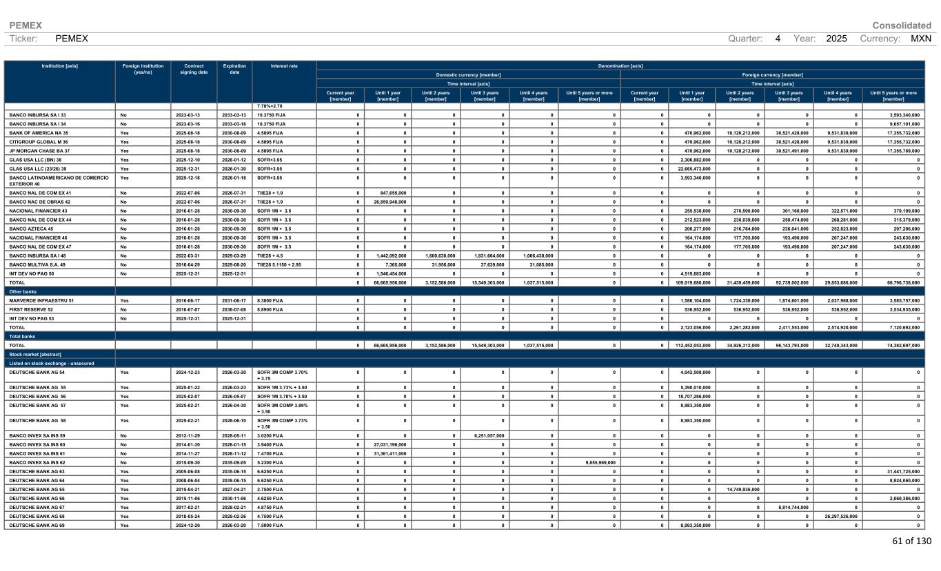 PEMEX Consolidated Ticker: PEMEX Quarter: 4 Year: 2025 Currency: MXN 61 of 130 Denomination [axis] Domestic currency [member] Foreign currency [member] Time interval [axis] Time interval [axis] Institution [axis] Foreign institution (yes/no) Contract signing date Expiration date Interest rate Current year [member] Until 1 year [member] Until 2 years [member] Until 3 years [member] Until 4 years [member] Until 5 years or more [member] Current year [member] Until 1 year [member] Until 2 years [member] Until 3 years [member] Until 4 years [member] Until 5 years or more [member] 7.78%+2.70 BANCO INBURSA SA I 33 No 2023-03-13 2033-03-13 10.3750 FIJA 0 0 0 0 0 0 0 0 0 0 0 3,593,340,000 BANCO INBURSA SA I 34 No 2023-03-16 2033-03-16 10.3750 FIJA 0 0 0 0 0 0 0 0 0 0 0 9,657,101,000 BANK OF AMERICA NA 35 Yes 2025-08-18 2030-08-09 4.5895 FIJA 0 0 0 0 0 0 0 470,962,000 10,120,212,000 30,521,428,000 9,531,839,000 17,355,732,000 CITIGROUP GLOBAL M 36 Yes 2025-08-18 2030-08-09 4.5895 FIJA 0 0 0 0 0 0 0 470,962,000 10,120,212,000 30,521,428,000 9,531,839,000 17,355,732,000 JP MORGAN CHASE BA 37 Yes 2025-08-18 2030-08-09 4.5895 FIJA 0 0 0 0 0 0 0 470,962,000 10,120,212,000 30,521,491,000 9,531,839,000 17,355,789,000 GLAS USA LLC (BN) 38 Yes 2025-12-10 2026-01-12 SOFR+3.95 0 0 0 0 0 0 0 2,306,882,000 0 0 0 0 GLAS USA LLC (23/26) 39 Yes 2025-12-31 2026-01-30 SOFR+3.95 0 0 0 0 0 0 0 22,665,473,000 0 0 0 0 BANCO LATINOAMERICANO DE COMERCIO EXTERIOR 40 Yes 2025-12-18 2026-01-18 SOFR+3.95 0 0 0 0 0 0 0 3,593,340,000 0 0 0 0 BANCO NAL DE COM EX 41 No 2022-07-06 2026-07-31 TIIE28 + 1.9 0 847,655,000 0 0 0 0 0 0 0 0 0 0 BANCO NAC DE OBRAS 42 No 2022-07-06 2026-07-31 TIIE28 + 1.9 0 26,859,948,000 0 0 0 0 0 0 0 0 0 0 NACIONAL FINANCIER 43 No 2016-01-28 2030-09-30 SOFR 1M + 3.5 0 0 0 0 0 0 0 255,530,000 276,590,000 301,160,000 322,571,000 379,199,000 BANCO NAL DE COM EX 44 No 2016-01-28 2030-09-30 SOFR 1M + 3.5 0 0 0 0 0 0 0 212,523,000 230,039,000 250,474,000 268,281,000 315,379,000 BANCO AZTECA 45 No 2016-01-28 2030-09-30 SOFR 1M + 3.5 0 0 0 0 0 0 0 200,277,000 216,784,000 236,041,000 252,823,000 297,206,000 NACIONAL FINANCIER 46 No 2016-01-28 2030-09-30 SOFR 1M + 3.5 0 0 0 0 0 0 0 164,174,000 177,705,000 193,490,000 207,247,000 243,630,000 BANCO NAL DE COM EX 47 No 2016-01-28 2030-09-30 SOFR 1M + 3.5 0 0 0 0 0 0 0 164,174,000 177,705,000 193,490,000 207,247,000 243,630,000 BANCO INBURSA SA I 48 No 2022-03-31 2029-03-29 TIIE28 + 4.5 0 1,442,092,000 1,600,630,000 1,831,664,000 1,006,430,000 0 0 0 0 0 0 0 BANCO MULTIVA S.A. 49 No 2016-04-29 2029-08-20 TIIE28 5.1150 + 2.95 0 7,365,000 31,956,000 37,639,000 31,085,000 0 0 0 0 0 0 0 INT DEV NO PAG 50 No 2025-12-31 2025-12-31 0 1,546,454,000 0 0 0 0 0 4,519,683,000 0 0 0 0 TOTAL 0 66,665,956,000 3,152,586,000 15,549,303,000 1,037,515,000 0 0 109,019,680,000 31,439,459,000 92,739,002,000 29,853,686,000 66,796,738,000 Other banks MARVERDE INFRAESTRU 51 Yes 2016-06-17 2031-06-17 8.3800 FIJA 0 0 0 0 0 0 0 1,586,104,000 1,724,330,000 1,874,601,000 2,037,968,000 3,585,757,000 FIRST RESERVE 52 No 2016-07-07 2036-07-08 8.8900 FIJA 0 0 0 0 0 0 0 536,952,000 536,952,000 536,952,000 536,952,000 3,534,935,000 INT DEV NO PAG 53 No 2025-12-31 2025-12-31 0 0 0 0 0 0 0 0 0 0 0 0 TOTAL 0 0 0 0 0 0 0 2,123,056,000 2,261,282,000 2,411,553,000 2,574,920,000 7,120,692,000 Total banks TOTAL 0 66,665,956,000 3,152,586,000 15,549,303,000 1,037,515,000 0 0 112,452,052,000 34,926,312,000 96,143,793,000 32,740,343,000 74,382,697,000 Stock market [abstract] Listed on stock exchange - unsecured DEUTSCHE BANK AG 54 Yes 2024-12-23 2026-03-20 SOFR 3M COMP 3.70% + 3.75 0 0 0 0 0 0 0 4,042,508,000 0 0 0 0 DEUTSCHE BANK AG 55 Yes 2025-01-22 2026-03-23 SOFR 1M 3.73% + 3.50 0 0 0 0 0 0 0 5,390,010,000 0 0 0 0 DEUTSCHE BANK AG 56 Yes 2025-02-07 2026-05-07 SOFR 1M 3.78% + 3.50 0 0 0 0 0 0 0 18,707,286,000 0 0 0 0 DEUTSCHE BANK AG 57 Yes 2025-02-21 2026-04-30 SOFR 3M COMP 3.89% + 3.50 0 0 0 0 0 0 0 8,983,350,000 0 0 0 0 DEUTSCHE BANK AG 58 Yes 2025-02-21 2026-06-10 SOFR 3M COMP 3.73% + 3.50 0 0 0 0 0 0 0 8,983,350,000 0 0 0 0 BANCO INVEX SA INS 59 No 2012-11-29 2028-05-11 3.0200 FIJA 0 0 0 6,251,057,000 0 0 0 0 0 0 0 0 BANCO INVEX SA INS 60 No 2014-01-30 2026-01-15 3.9400 FIJA 0 27,031,196,000 0 0 0 0 0 0 0 0 0 0 BANCO INVEX SA INS 61 No 2014-11-27 2026-11-12 7.4700 FIJA 0 31,361,411,000 0 0 0 0 0 0 0 0 0 0 BANCO INVEX SA INS 62 No 2015-09-30 2035-09-05 5.2300 FIJA 0 0 0 0 0 9,855,969,000 0 0 0 0 0 0 DEUTSCHE BANK AG 63 Yes 2005-06-08 2035-06-15 6.6250 FIJA 0 0 0 0 0 0 0 0 0 0 0 31,441,725,000 DEUTSCHE BANK AG 64 Yes 2008-06-04 2038-06-15 6.6250 FIJA 0 0 0 0 0 0 0 0 0 0 0 8,924,060,000 DEUTSCHE BANK AG 65 Yes 2015-04-21 2027-04-21 2.7500 FIJA 0 0 0 0 0 0 0 0 14,749,936,000 0 0 0 DEUTSCHE BANK AG 66 Yes 2015-11-06 2030-11-06 4.6250 FIJA 0 0 0 0 0 0 0 0 0 0 0 2,060,386,000 DEUTSCHE BANK AG 67 Yes 2017-02-21 2028-02-21 4.8750 FIJA 0 0 0 0 0 0 0 0 0 8,814,744,000 0 0 DEUTSCHE BANK AG 68 Yes 2018-05-24 2029-02-26 4.7500 FIJA 0 0 0 0 0 0 0 0 0 0 26,297,526,000 0 DEUTSCHE BANK AG 69 Yes 2024-12-20 2026-03-20 7.5000 FIJA 0 0 0 0 0 0 0 8,983,350,000 0 0 0 0