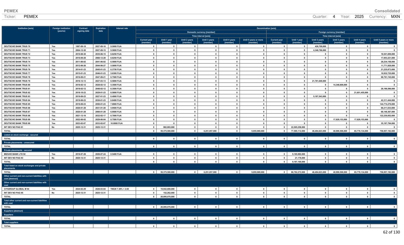 PEMEX Consolidated Ticker: PEMEX Quarter: 4 Year: 2025 Currency: MXN 62 of 130 Denomination [axis] Domestic currency [member] Foreign currency [member] Time interval [axis] Time interval [axis] Institution [axis] Foreign institution (yes/no) Contract signing date Expiration date Interest rate Current year [member] Until 1 year [member] Until 2 years [member] Until 3 years [member] Until 4 years [member] Until 5 years or more [member] Current year [member] Until 1 year [member] Until 2 years [member] Until 3 years [member] Until 4 years [member] Until 5 years or more [member] DEUTSCHE BANK TRUS 70 Yes 1997-09-18 2027-09-16 9.5000 FIJA 0 0 0 0 0 0 0 0 426,709,000 0 0 0 DEUTSCHE BANK TRUS 71 Yes 2004-12-30 2027-09-15 9.5000 FIJA 0 0 0 0 0 0 0 0 4,348,786,000 0 0 0 DEUTSCHE BANK TRUS 72 Yes 2010-08-30 2035-06-15 6.6250 FIJA 0 0 0 0 0 0 0 0 0 0 0 18,541,009,000 DEUTSCHE BANK TRUS 73 Yes 2010-09-28 2060-12-28 6.6250 FIJA 0 0 0 0 0 0 0 0 0 0 0 17,953,221,000 DEUTSCHE BANK TRUS 74 Yes 2011-06-02 2041-06-02 6.5000 FIJA 0 0 0 0 0 0 0 0 0 0 0 28,234,158,000 DEUTSCHE BANK TRUS 75 Yes 2012-06-26 2044-06-27 5.5000 FIJA 0 0 0 0 0 0 0 0 0 0 0 11,771,928,000 DEUTSCHE BANK TRUS 76 Yes 2014-01-23 2045-01-23 6.3750 FIJA 0 0 0 0 0 0 0 0 0 0 0 21,235,873,000 DEUTSCHE BANK TRUS 77 Yes 2015-01-23 2046-01-23 5.6300 FIJA 0 0 0 0 0 0 0 0 0 0 0 10,932,725,000 DEUTSCHE BANK TRUS 78 Yes 2016-09-21 2047-09-21 6.7500 FIJA 0 0 0 0 0 0 0 0 0 0 0 98,791,745,000 DEUTSCHE BANK TRUS 79 Yes 2016-12-13 2027-03-13 6.5000 FIJA 0 0 0 0 0 0 0 0 21,781,649,000 0 0 0 DEUTSCHE BANK TRUS 80 Yes 2018-02-12 2028-02-12 5.3500 FIJA 0 0 0 0 0 0 0 0 0 14,346,609,000 0 0 DEUTSCHE BANK TRUS 81 Yes 2018-02-12 2048-02-12 6.3500 FIJA 0 0 0 0 0 0 0 0 0 0 0 28,196,596,000 DEUTSCHE BANK TRUS 82 Yes 2018-10-23 2029-01-23 6.5000 FIJA 0 0 0 0 0 0 0 0 0 0 21,651,455,000 0 DEUTSCHE BANK TRUS 83 Yes 2019-09-23 2027-01-23 6.4900 FIJA 0 0 0 0 0 0 0 0 5,187,543,000 0 0 0 DEUTSCHE BANK TRUS 84 Yes 2019-09-23 2030-01-23 6.8400 FIJA 0 0 0 0 0 0 0 0 0 0 0 42,311,444,000 DEUTSCHE BANK TRUS 85 Yes 2019-09-23 2050-01-23 7.6900 FIJA 0 0 0 0 0 0 0 0 0 0 0 144,774,276,000 DEUTSCHE BANK TRUS 86 Yes 2020-01-28 2031-01-28 5.9500 FIJA 0 0 0 0 0 0 0 0 0 0 0 68,211,033,000 DEUTSCHE BANK TRUS 87 Yes 2020-01-28 2060-01-28 6.9500 FIJA 0 0 0 0 0 0 0 0 0 0 0 68,148,367,000 DEUTSCHE BANK TRUS 88 Yes 2021-12-16 2032-02-17 6.7000 FIJA 0 0 0 0 0 0 0 0 0 0 0 122,230,852,000 DEUTSCHE BANK TRUS 89 Yes 2022-06-02 2029-06-04 8.7500 FIJA 0 0 0 0 0 0 0 0 0 17,829,153,000 17,829,153,000 0 DEUTSCHE BANK TRUS 90 Yes 2023-02-07 2033-02-07 10.0000 FIJA 0 0 0 0 0 0 0 0 0 0 0 35,197,794,000 INT DEV NO PAG 91 No 2025-12-31 2025-12-31 0 982,893,000 0 0 0 0 0 22,505,258,000 0 0 0 0 TOTAL 0 59,375,500,000 0 6,251,057,000 0 9,855,969,000 0 77,595,112,000 46,494,623,000 40,990,506,000 65,778,134,000 758,957,192,000 Listed on stock exchange - secured TOTAL 0 0 0 0 0 0 0 0 0 0 0 0 Private placements - unsecured TOTAL 0 0 0 0 0 0 0 0 0 0 0 0 Private placements - secured MIZUHO BANK LTD 92 Yes 2016-07-26 2026-07-24 0.5400 FIJA 0 0 0 0 0 0 0 9,165,982,000 0 0 0 0 INT DEV NO PAG 93 No 2025-12-31 2025-12-31 0 0 0 0 0 0 0 21,178,000 0 0 0 0 TOTAL 0 0 0 0 0 0 0 9,187,160,000 0 0 0 0 Total listed on stock exchanges and private placements TOTAL 0 59,375,500,000 0 6,251,057,000 0 9,855,969,000 0 86,782,272,000 46,494,623,000 40,990,506,000 65,778,134,000 758,957,192,000 Other current and non-current liabilities with cost [abstract] Other current and non-current liabilities with cost CITIGROUP GLOBAL M 94 Yes 2024-02-29 2026-03-04 TIIE28 7.38% + 2.65 0 19,942,808,000 0 0 0 0 0 0 0 0 0 0 INT DEV NO PAG 95 No 2025-12-31 2025-12-31 0 152,262,000 0 0 0 0 0 0 0 0 0 0 TOTAL 0 20,095,070,000 0 0 0 0 0 0 0 0 0 0 Total other current and non-current liabilities with cost TOTAL 0 20,095,070,000 0 0 0 0 0 0 0 0 0 0 Suppliers [abstract] Suppliers TOTAL 0 0 0 0 0 0 0 0 0 0 0 0 Total suppliers TOTAL 0 0 0 0 0 0 0 0 0 0 0 0