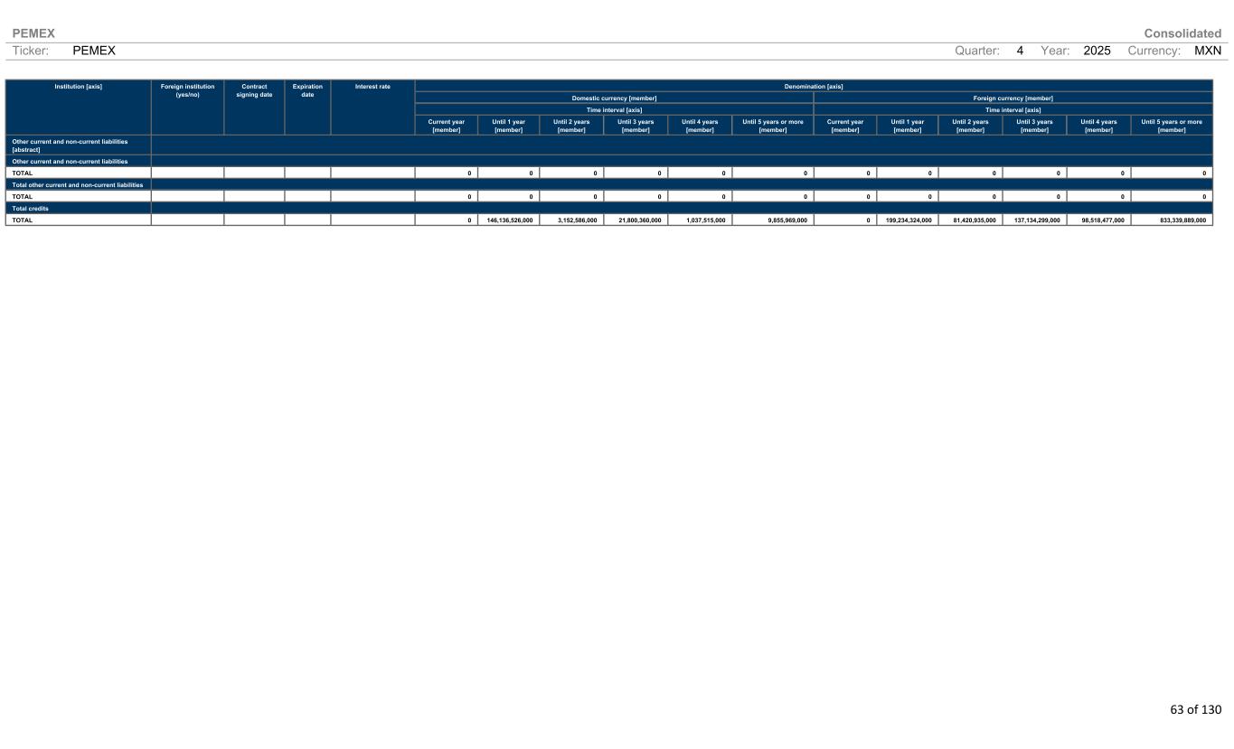 PEMEX Consolidated Ticker: PEMEX Quarter: 4 Year: 2025 Currency: MXN 63 of 130 Denomination [axis] Domestic currency [member] Foreign currency [member] Time interval [axis] Time interval [axis] Institution [axis] Foreign institution (yes/no) Contract signing date Expiration date Interest rate Current year [member] Until 1 year [member] Until 2 years [member] Until 3 years [member] Until 4 years [member] Until 5 years or more [member] Current year [member] Until 1 year [member] Until 2 years [member] Until 3 years [member] Until 4 years [member] Until 5 years or more [member] Other current and non-current liabilities [abstract] Other current and non-current liabilities TOTAL 0 0 0 0 0 0 0 0 0 0 0 0 Total other current and non-current liabilities TOTAL 0 0 0 0 0 0 0 0 0 0 0 0 Total credits TOTAL 0 146,136,526,000 3,152,586,000 21,800,360,000 1,037,515,000 9,855,969,000 0 199,234,324,000 81,420,935,000 137,134,299,000 98,518,477,000 833,339,889,000