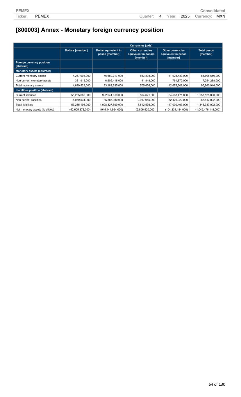 PEMEX Consolidated Ticker: PEMEX Quarter: 4 Year: 2025 Currency: MXN 64 of 130 [800003] Annex - Monetary foreign currency position Currencies [axis] Dollars [member] Dollar equivalent in pesos [member] Other currencies equivalent in dollars [member] Other currencies equivalent in pesos [member] Total pesos [member] Foreign currency position [abstract] Monetary assets [abstract] Current monetary assets 4,267,908,000 76,680,217,000 663,808,000 11,926,439,000 88,606,656,000 Non-current monetary assets 361,915,000 6,502,418,000 41,848,000 751,870,000 7,254,288,000 Total monetary assets 4,629,823,000 83,182,635,000 705,656,000 12,678,309,000 95,860,944,000 Liabilities position [abstract] Current liabilities 55,265,665,000 992,941,619,000 3,594,621,000 64,583,471,000 1,057,525,090,000 Non-current liabilities 1,969,531,000 35,385,980,000 2,917,955,000 52,426,022,000 87,812,002,000 Total liabilities 57,235,196,000 1,028,327,599,000 6,512,576,000 117,009,493,000 1,145,337,092,000 Net monetary assets (liabilities) (52,605,373,000) (945,144,964,000) (5,806,920,000) (104,331,184,000) (1,049,476,148,000)