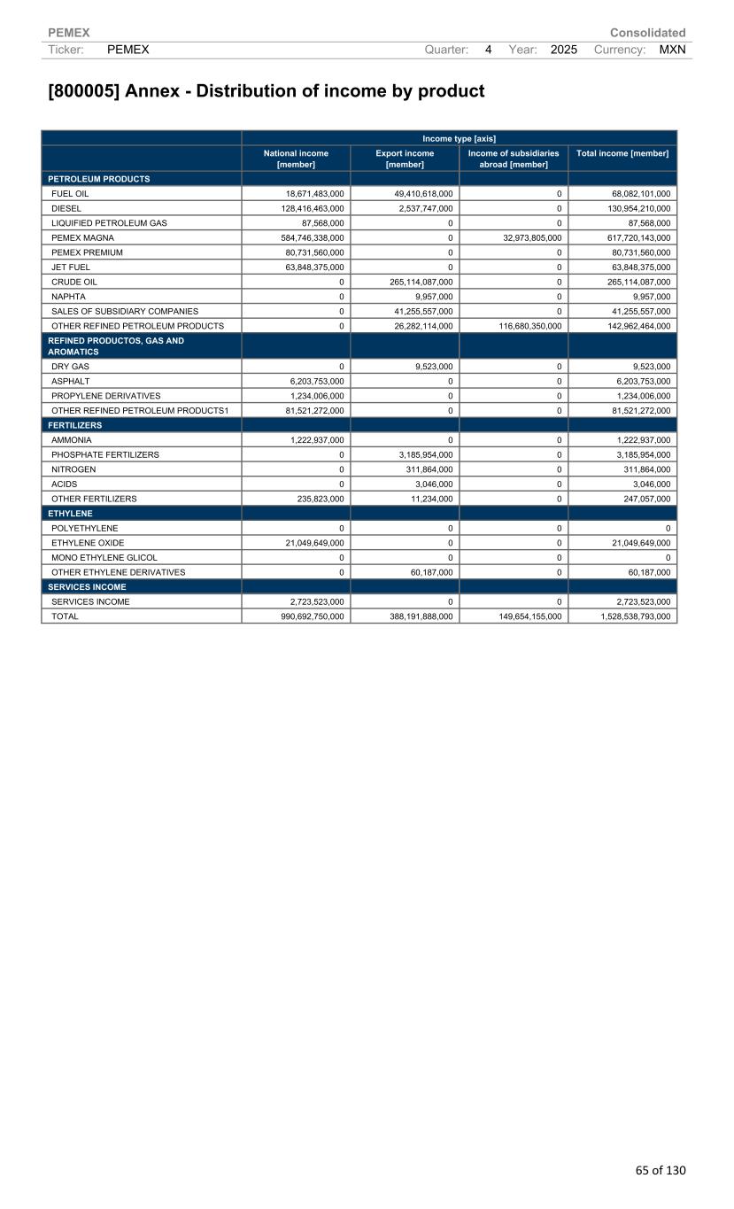 PEMEX Consolidated Ticker: PEMEX Quarter: 4 Year: 2025 Currency: MXN 65 of 130 [800005] Annex - Distribution of income by product Income type [axis] National income [member] Export income [member] Income of subsidiaries abroad [member] Total income [member] PETROLEUM PRODUCTS FUEL OIL 18,671,483,000 49,410,618,000 0 68,082,101,000 DIESEL 128,416,463,000 2,537,747,000 0 130,954,210,000 LIQUIFIED PETROLEUM GAS 87,568,000 0 0 87,568,000 PEMEX MAGNA 584,746,338,000 0 32,973,805,000 617,720,143,000 PEMEX PREMIUM 80,731,560,000 0 0 80,731,560,000 JET FUEL 63,848,375,000 0 0 63,848,375,000 CRUDE OIL 0 265,114,087,000 0 265,114,087,000 NAPHTA 0 9,957,000 0 9,957,000 SALES OF SUBSIDIARY COMPANIES 0 41,255,557,000 0 41,255,557,000 OTHER REFINED PETROLEUM PRODUCTS 0 26,282,114,000 116,680,350,000 142,962,464,000 REFINED PRODUCTOS, GAS AND AROMATICS DRY GAS 0 9,523,000 0 9,523,000 ASPHALT 6,203,753,000 0 0 6,203,753,000 PROPYLENE DERIVATIVES 1,234,006,000 0 0 1,234,006,000 OTHER REFINED PETROLEUM PRODUCTS1 81,521,272,000 0 0 81,521,272,000 FERTILIZERS AMMONIA 1,222,937,000 0 0 1,222,937,000 PHOSPHATE FERTILIZERS 0 3,185,954,000 0 3,185,954,000 NITROGEN 0 311,864,000 0 311,864,000 ACIDS 0 3,046,000 0 3,046,000 OTHER FERTILIZERS 235,823,000 11,234,000 0 247,057,000 ETHYLENE POLYETHYLENE 0 0 0 0 ETHYLENE OXIDE 21,049,649,000 0 0 21,049,649,000 MONO ETHYLENE GLICOL 0 0 0 0 OTHER ETHYLENE DERIVATIVES 0 60,187,000 0 60,187,000 SERVICES INCOME SERVICES INCOME 2,723,523,000 0 0 2,723,523,000 TOTAL 990,692,750,000 388,191,888,000 149,654,155,000 1,528,538,793,000