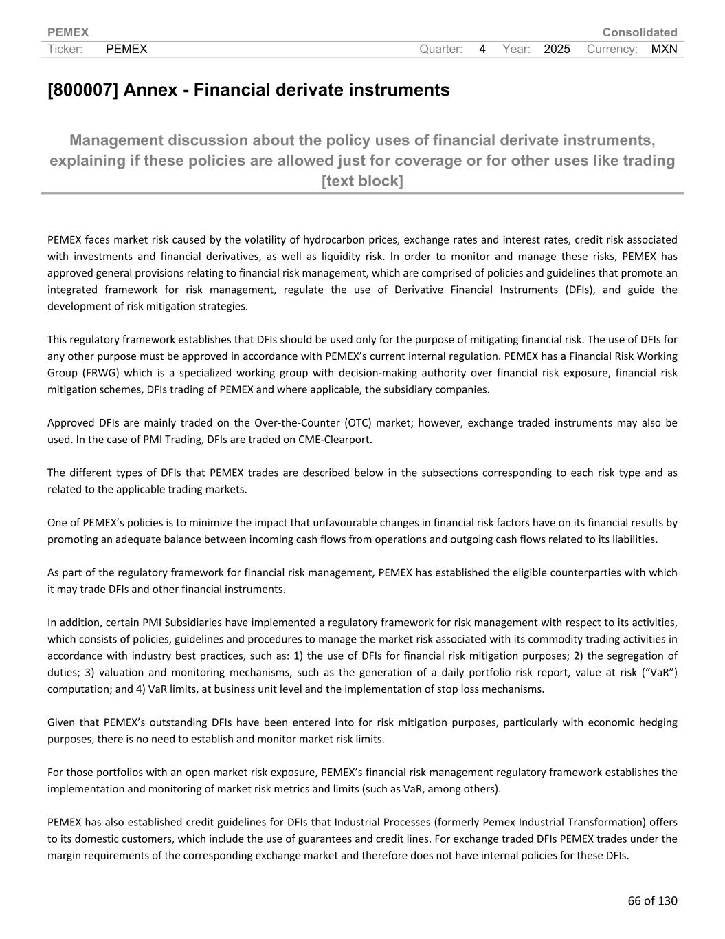 PEMEX Consolidated Ticker: PEMEX Quarter: 4 Year: 2025 Currency: MXN 66 of 130 [800007] Annex - Financial derivate instruments Management discussion about the policy uses of financial derivate instruments, explaining if these policies are allowed just for coverage or for other uses like trading [text block] PEMEX faces market risk caused by the volatility of hydrocarbon prices, exchange rates and interest rates, credit risk associated with investments and financial derivatives, as well as liquidity risk. In order to monitor and manage these risks, PEMEX has approved general provisions relating to financial risk management, which are comprised of policies and guidelines that promote an integrated framework for risk management, regulate the use of Derivative Financial Instruments (DFIs), and guide the development of risk mitigation strategies. This regulatory framework establishes that DFIs should be used only for the purpose of mitigating financial risk. The use of DFIs for any other purpose must be approved in accordance with PEMEX’s current internal regulation. PEMEX has a Financial Risk Working Group (FRWG) which is a specialized working group with decision-making authority over financial risk exposure, financial risk mitigation schemes, DFIs trading of PEMEX and where applicable, the subsidiary companies. Approved DFIs are mainly traded on the Over-the-Counter (OTC) market; however, exchange traded instruments may also be used. In the case of PMI Trading, DFIs are traded on CME-Clearport. The different types of DFIs that PEMEX trades are described below in the subsections corresponding to each risk type and as related to the applicable trading markets. One of PEMEX’s policies is to minimize the impact that unfavourable changes in financial risk factors have on its financial results by promoting an adequate balance between incoming cash flows from operations and outgoing cash flows related to its liabilities. As part of the regulatory framework for financial risk management, PEMEX has established the eligible counterparties with which it may trade DFIs and other financial instruments. In addition, certain PMI Subsidiaries have implemented a regulatory framework for risk management with respect to its activities, which consists of policies, guidelines and procedures to manage the market risk associated with its commodity trading activities in accordance with industry best practices, such as: 1) the use of DFIs for financial risk mitigation purposes; 2) the segregation of duties; 3) valuation and monitoring mechanisms, such as the generation of a daily portfolio risk report, value at risk (“VaR”) computation; and 4) VaR limits, at business unit level and the implementation of stop loss mechanisms. Given that PEMEX’s outstanding DFIs have been entered into for risk mitigation purposes, particularly with economic hedging purposes, there is no need to establish and monitor market risk limits. For those portfolios with an open market risk exposure, PEMEX’s financial risk management regulatory framework establishes the implementation and monitoring of market risk metrics and limits (such as VaR, among others). PEMEX has also established credit guidelines for DFIs that Industrial Processes (formerly Pemex Industrial Transformation) offers to its domestic customers, which include the use of guarantees and credit lines. For exchange traded DFIs PEMEX trades under the margin requirements of the corresponding exchange market and therefore does not have internal policies for these DFIs.