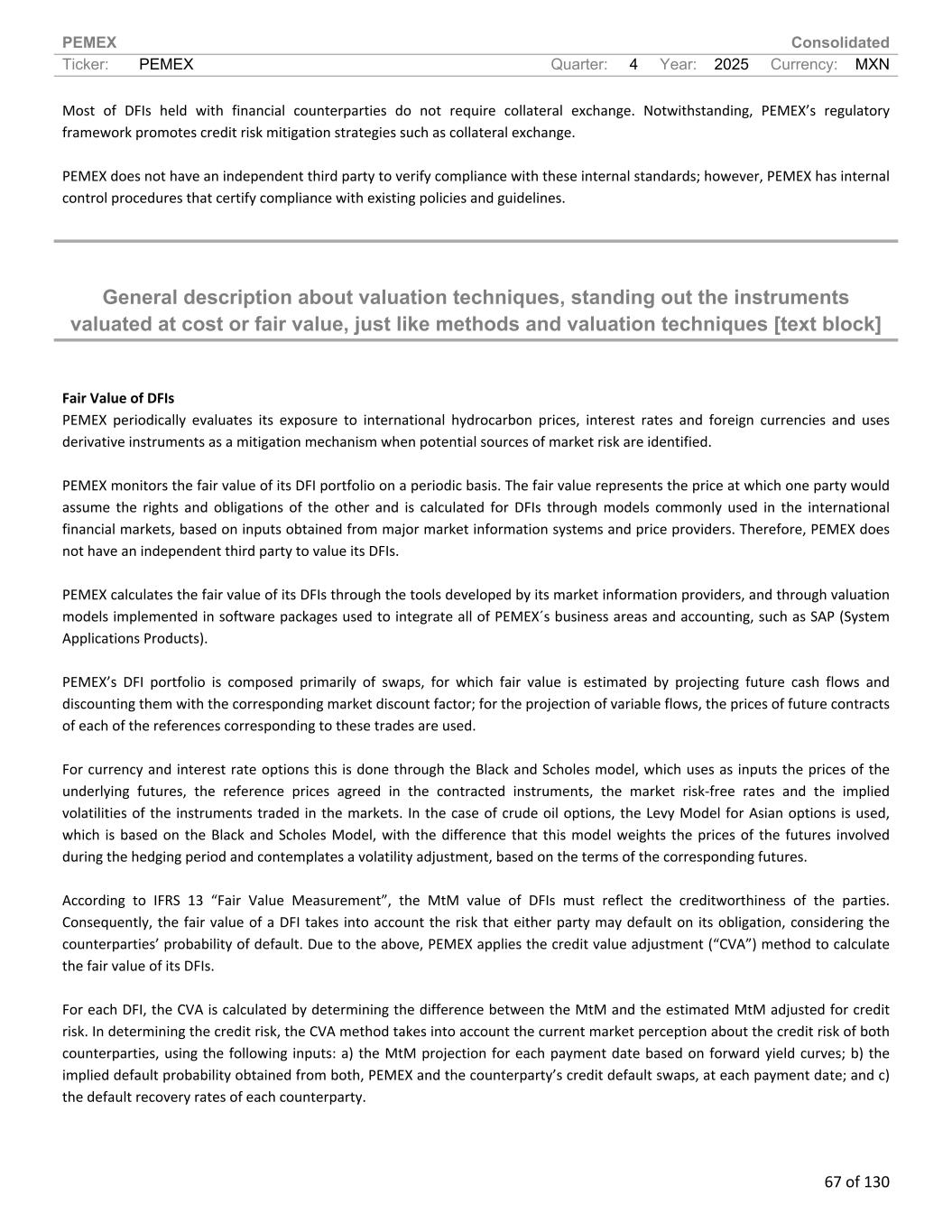 PEMEX Consolidated Ticker: PEMEX Quarter: 4 Year: 2025 Currency: MXN 67 of 130 Most of DFIs held with financial counterparties do not require collateral exchange. Notwithstanding, PEMEX’s regulatory framework promotes credit risk mitigation strategies such as collateral exchange. PEMEX does not have an independent third party to verify compliance with these internal standards; however, PEMEX has internal control procedures that certify compliance with existing policies and guidelines. General description about valuation techniques, standing out the instruments valuated at cost or fair value, just like methods and valuation techniques [text block] Fair Value of DFIs PEMEX periodically evaluates its exposure to international hydrocarbon prices, interest rates and foreign currencies and uses derivative instruments as a mitigation mechanism when potential sources of market risk are identified. PEMEX monitors the fair value of its DFI portfolio on a periodic basis. The fair value represents the price at which one party would assume the rights and obligations of the other and is calculated for DFIs through models commonly used in the international financial markets, based on inputs obtained from major market information systems and price providers. Therefore, PEMEX does not have an independent third party to value its DFIs. PEMEX calculates the fair value of its DFIs through the tools developed by its market information providers, and through valuation models implemented in software packages used to integrate all of PEMEX´s business areas and accounting, such as SAP (System Applications Products). PEMEX’s DFI portfolio is composed primarily of swaps, for which fair value is estimated by projecting future cash flows and discounting them with the corresponding market discount factor; for the projection of variable flows, the prices of future contracts of each of the references corresponding to these trades are used. For currency and interest rate options this is done through the Black and Scholes model, which uses as inputs the prices of the underlying futures, the reference prices agreed in the contracted instruments, the market risk-free rates and the implied volatilities of the instruments traded in the markets. In the case of crude oil options, the Levy Model for Asian options is used, which is based on the Black and Scholes Model, with the difference that this model weights the prices of the futures involved during the hedging period and contemplates a volatility adjustment, based on the terms of the corresponding futures. According to IFRS 13 “Fair Value Measurement”, the MtM value of DFIs must reflect the creditworthiness of the parties. Consequently, the fair value of a DFI takes into account the risk that either party may default on its obligation, considering the counterparties’ probability of default. Due to the above, PEMEX applies the credit value adjustment (“CVA”) method to calculate the fair value of its DFIs. For each DFI, the CVA is calculated by determining the difference between the MtM and the estimated MtM adjusted for credit risk. In determining the credit risk, the CVA method takes into account the current market perception about the credit risk of both counterparties, using the following inputs: a) the MtM projection for each payment date based on forward yield curves; b) the implied default probability obtained from both, PEMEX and the counterparty’s credit default swaps, at each payment date; and c) the default recovery rates of each counterparty.
