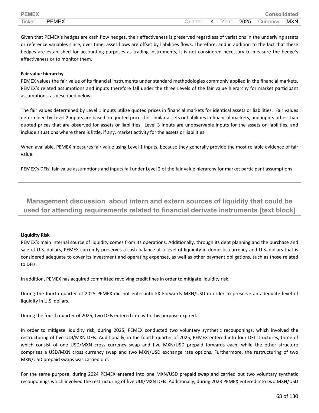PEMEX Consolidated Ticker: PEMEX Quarter: 4 Year: 2025 Currency: MXN 68 of 130 Given that PEMEX’s hedges are cash flow hedges, their effectiveness is preserved regardless of variations in the underlying assets or reference variables since, over time, asset flows are offset by liabilities flows. Therefore, and in addition to the fact that these hedges are established for accounting purposes as trading instruments, it is not considered necessary to measure the hedge’s effectiveness or to monitor them. Fair value hierarchy PEMEX values the fair value of its financial instruments under standard methodologies commonly applied in the financial markets. PEMEX’s related assumptions and inputs therefore fall under the three Levels of the fair value hierarchy for market participant assumptions, as described below. The fair values determined by Level 1 inputs utilize quoted prices in financial markets for identical assets or liabilities. Fair values determined by Level 2 inputs are based on quoted prices for similar assets or liabilities in financial markets, and inputs other than quoted prices that are observed for assets or liabilities. Level 3 inputs are unobservable inputs for the assets or liabilities, and include situations where there is little, if any, market activity for the assets or liabilities. When available, PEMEX measures fair value using Level 1 inputs, because they generally provide the most reliable evidence of fair value. PEMEX’s DFIs’ fair-value assumptions and inputs fall under Level 2 of the fair value hierarchy for market participant assumptions. Management discussion about intern and extern sources of liquidity that could be used for attending requirements related to financial derivate instruments [text block] Liquidity Risk PEMEX’s main internal source of liquidity comes from its operations. Additionally, through its debt planning and the purchase and sale of U.S. dollars, PEMEX currently preserves a cash balance at a level of liquidity in domestic currency and U.S. dollars that is considered adequate to cover its investment and operating expenses, as well as other payment obligations, such as those related to DFIs. In addition, PEMEX has acquired committed revolving credit lines in order to mitigate liquidity risk. During the fourth quarter of 2025 PEMEX did not enter into FX Forwards MXN/USD in order to preserve an adequate level of liquidity in U.S. dollars. During the fourth quarter of 2025, two DFIs entered into with this purpose expired. In order to mitigate liquidity risk, during 2025, PEMEX conducted two voluntary synthetic recouponings, which involved the restructuring of five UDI/MXN DFIs. Additionally, in the fourth quarter of 2025, PEMEX entered into four DFI structures, three of which consist of one USD/MXN cross currency swap and five MXN/USD prepaid forwards each, while the other structure comprises a USD/MXN cross currency swap and two MXN/USD exchange rate options. Furthermore, the restructuring of two MXN/USD prepaid swaps was carried out. For the same purpose, during 2024 PEMEX entered into one MXN/USD prepaid swap and carried out two voluntary synthetic recouponings which involved the restructuring of five UDI/MXN DFIs. Additionally, during 2023 PEMEX entered into two MXN/USD