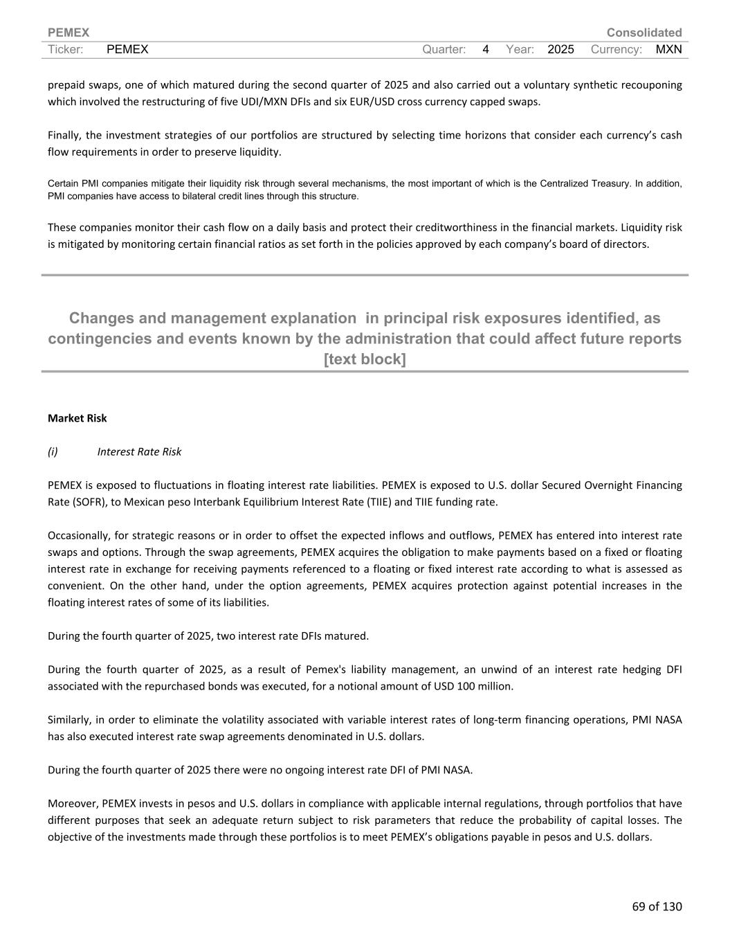 PEMEX Consolidated Ticker: PEMEX Quarter: 4 Year: 2025 Currency: MXN 69 of 130 prepaid swaps, one of which matured during the second quarter of 2025 and also carried out a voluntary synthetic recouponing which involved the restructuring of five UDI/MXN DFIs and six EUR/USD cross currency capped swaps. Finally, the investment strategies of our portfolios are structured by selecting time horizons that consider each currency’s cash flow requirements in order to preserve liquidity. Certain PMI companies mitigate their liquidity risk through several mechanisms, the most important of which is the Centralized Treasury. In addition, PMI companies have access to bilateral credit lines through this structure. These companies monitor their cash flow on a daily basis and protect their creditworthiness in the financial markets. Liquidity risk is mitigated by monitoring certain financial ratios as set forth in the policies approved by each company’s board of directors. Changes and management explanation in principal risk exposures identified, as contingencies and events known by the administration that could affect future reports [text block] Market Risk (i) Interest Rate Risk PEMEX is exposed to fluctuations in floating interest rate liabilities. PEMEX is exposed to U.S. dollar Secured Overnight Financing Rate (SOFR), to Mexican peso Interbank Equilibrium Interest Rate (TIIE) and TIIE funding rate. Occasionally, for strategic reasons or in order to offset the expected inflows and outflows, PEMEX has entered into interest rate swaps and options. Through the swap agreements, PEMEX acquires the obligation to make payments based on a fixed or floating interest rate in exchange for receiving payments referenced to a floating or fixed interest rate according to what is assessed as convenient. On the other hand, under the option agreements, PEMEX acquires protection against potential increases in the floating interest rates of some of its liabilities. During the fourth quarter of 2025, two interest rate DFIs matured. During the fourth quarter of 2025, as a result of Pemex's liability management, an unwind of an interest rate hedging DFI associated with the repurchased bonds was executed, for a notional amount of USD 100 million. Similarly, in order to eliminate the volatility associated with variable interest rates of long-term financing operations, PMI NASA has also executed interest rate swap agreements denominated in U.S. dollars. During the fourth quarter of 2025 there were no ongoing interest rate DFI of PMI NASA. Moreover, PEMEX invests in pesos and U.S. dollars in compliance with applicable internal regulations, through portfolios that have different purposes that seek an adequate return subject to risk parameters that reduce the probability of capital losses. The objective of the investments made through these portfolios is to meet PEMEX’s obligations payable in pesos and U.S. dollars.