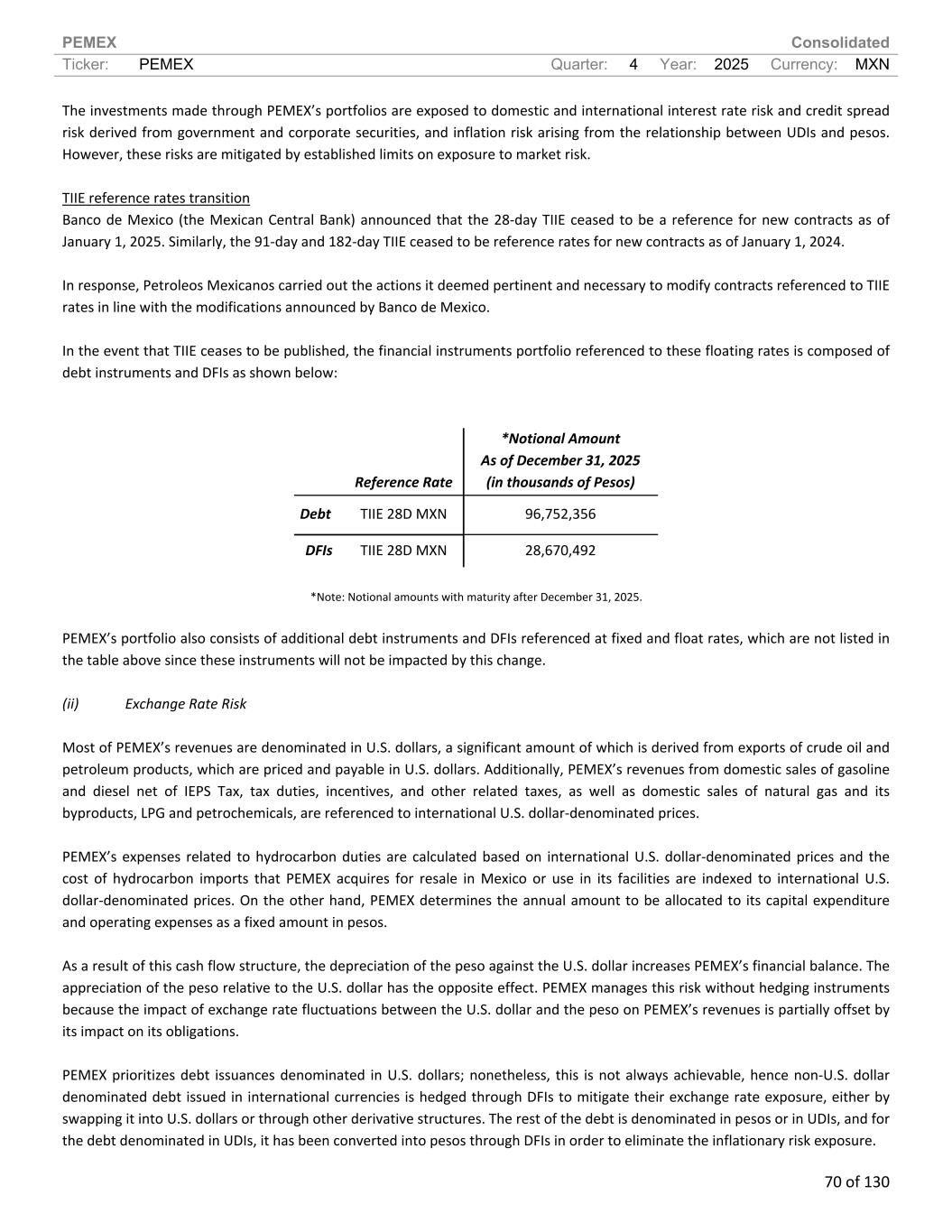 PEMEX Consolidated Ticker: PEMEX Quarter: 4 Year: 2025 Currency: MXN 70 of 130 The investments made through PEMEX’s portfolios are exposed to domestic and international interest rate risk and credit spread risk derived from government and corporate securities, and inflation risk arising from the relationship between UDIs and pesos. However, these risks are mitigated by established limits on exposure to market risk. TIIE reference rates transition Banco de Mexico (the Mexican Central Bank) announced that the 28-day TIIE ceased to be a reference for new contracts as of January 1, 2025. Similarly, the 91-day and 182-day TIIE ceased to be reference rates for new contracts as of January 1, 2024. In response, Petroleos Mexicanos carried out the actions it deemed pertinent and necessary to modify contracts referenced to TIIE rates in line with the modifications announced by Banco de Mexico. In the event that TIIE ceases to be published, the financial instruments portfolio referenced to these floating rates is composed of debt instruments and DFIs as shown below: Reference Rate *Notional Amount As of December 31, 2025 (in thousands of Pesos) Debt TIIE 28D MXN 96,752,356 DFIs TIIE 28D MXN 28,670,492 *Note: Notional amounts with maturity after December 31, 2025. PEMEX’s portfolio also consists of additional debt instruments and DFIs referenced at fixed and float rates, which are not listed in the table above since these instruments will not be impacted by this change. (ii) Exchange Rate Risk Most of PEMEX’s revenues are denominated in U.S. dollars, a significant amount of which is derived from exports of crude oil and petroleum products, which are priced and payable in U.S. dollars. Additionally, PEMEX’s revenues from domestic sales of gasoline and diesel net of IEPS Tax, tax duties, incentives, and other related taxes, as well as domestic sales of natural gas and its byproducts, LPG and petrochemicals, are referenced to international U.S. dollar-denominated prices. PEMEX’s expenses related to hydrocarbon duties are calculated based on international U.S. dollar-denominated prices and the cost of hydrocarbon imports that PEMEX acquires for resale in Mexico or use in its facilities are indexed to international U.S. dollar-denominated prices. On the other hand, PEMEX determines the annual amount to be allocated to its capital expenditure and operating expenses as a fixed amount in pesos. As a result of this cash flow structure, the depreciation of the peso against the U.S. dollar increases PEMEX’s financial balance. The appreciation of the peso relative to the U.S. dollar has the opposite effect. PEMEX manages this risk without hedging instruments because the impact of exchange rate fluctuations between the U.S. dollar and the peso on PEMEX’s revenues is partially offset by its impact on its obligations. PEMEX prioritizes debt issuances denominated in U.S. dollars; nonetheless, this is not always achievable, hence non-U.S. dollar denominated debt issued in international currencies is hedged through DFIs to mitigate their exchange rate exposure, either by swapping it into U.S. dollars or through other derivative structures. The rest of the debt is denominated in pesos or in UDIs, and for the debt denominated in UDIs, it has been converted into pesos through DFIs in order to eliminate the inflationary risk exposure.