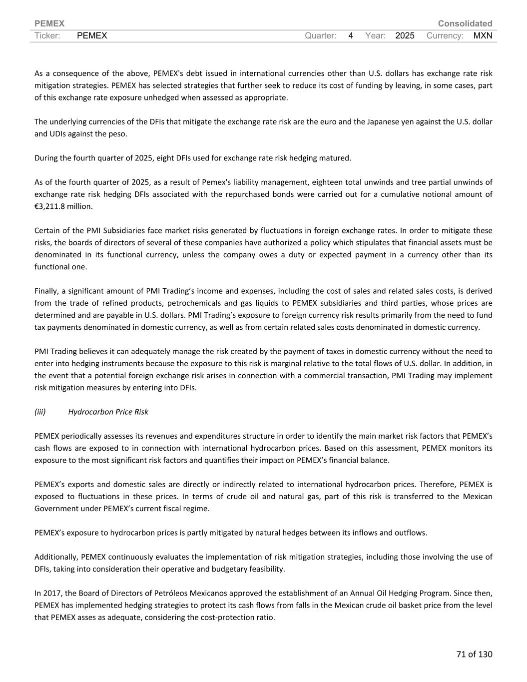 PEMEX Consolidated Ticker: PEMEX Quarter: 4 Year: 2025 Currency: MXN 71 of 130 As a consequence of the above, PEMEX's debt issued in international currencies other than U.S. dollars has exchange rate risk mitigation strategies. PEMEX has selected strategies that further seek to reduce its cost of funding by leaving, in some cases, part of this exchange rate exposure unhedged when assessed as appropriate. The underlying currencies of the DFIs that mitigate the exchange rate risk are the euro and the Japanese yen against the U.S. dollar and UDIs against the peso. During the fourth quarter of 2025, eight DFIs used for exchange rate risk hedging matured. As of the fourth quarter of 2025, as a result of Pemex's liability management, eighteen total unwinds and tree partial unwinds of exchange rate risk hedging DFIs associated with the repurchased bonds were carried out for a cumulative notional amount of €3,211.8 million. Certain of the PMI Subsidiaries face market risks generated by fluctuations in foreign exchange rates. In order to mitigate these risks, the boards of directors of several of these companies have authorized a policy which stipulates that financial assets must be denominated in its functional currency, unless the company owes a duty or expected payment in a currency other than its functional one. Finally, a significant amount of PMI Trading’s income and expenses, including the cost of sales and related sales costs, is derived from the trade of refined products, petrochemicals and gas liquids to PEMEX subsidiaries and third parties, whose prices are determined and are payable in U.S. dollars. PMI Trading’s exposure to foreign currency risk results primarily from the need to fund tax payments denominated in domestic currency, as well as from certain related sales costs denominated in domestic currency. PMI Trading believes it can adequately manage the risk created by the payment of taxes in domestic currency without the need to enter into hedging instruments because the exposure to this risk is marginal relative to the total flows of U.S. dollar. In addition, in the event that a potential foreign exchange risk arises in connection with a commercial transaction, PMI Trading may implement risk mitigation measures by entering into DFIs. (iii) Hydrocarbon Price Risk PEMEX periodically assesses its revenues and expenditures structure in order to identify the main market risk factors that PEMEX’s cash flows are exposed to in connection with international hydrocarbon prices. Based on this assessment, PEMEX monitors its exposure to the most significant risk factors and quantifies their impact on PEMEX’s financial balance. PEMEX’s exports and domestic sales are directly or indirectly related to international hydrocarbon prices. Therefore, PEMEX is exposed to fluctuations in these prices. In terms of crude oil and natural gas, part of this risk is transferred to the Mexican Government under PEMEX’s current fiscal regime. PEMEX’s exposure to hydrocarbon prices is partly mitigated by natural hedges between its inflows and outflows. Additionally, PEMEX continuously evaluates the implementation of risk mitigation strategies, including those involving the use of DFIs, taking into consideration their operative and budgetary feasibility. In 2017, the Board of Directors of Petróleos Mexicanos approved the establishment of an Annual Oil Hedging Program. Since then, PEMEX has implemented hedging strategies to protect its cash flows from falls in the Mexican crude oil basket price from the level that PEMEX asses as adequate, considering the cost-protection ratio.