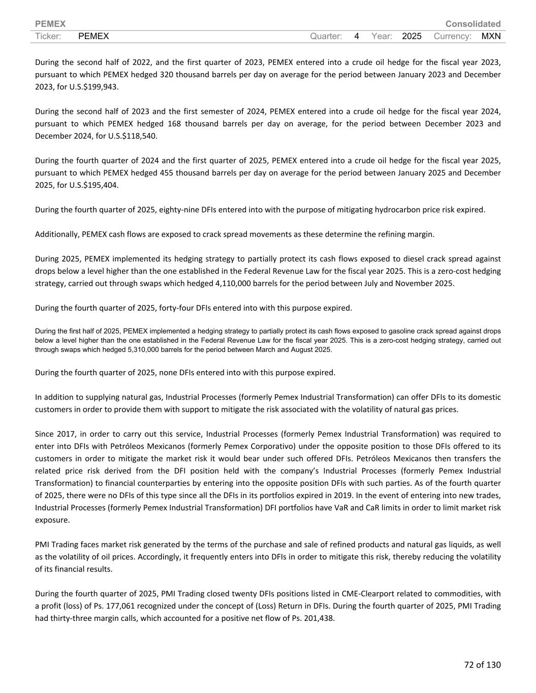 PEMEX Consolidated Ticker: PEMEX Quarter: 4 Year: 2025 Currency: MXN 72 of 130 During the second half of 2022, and the first quarter of 2023, PEMEX entered into a crude oil hedge for the fiscal year 2023, pursuant to which PEMEX hedged 320 thousand barrels per day on average for the period between January 2023 and December 2023, for U.S.$199,943. During the second half of 2023 and the first semester of 2024, PEMEX entered into a crude oil hedge for the fiscal year 2024, pursuant to which PEMEX hedged 168 thousand barrels per day on average, for the period between December 2023 and December 2024, for U.S.$118,540. During the fourth quarter of 2024 and the first quarter of 2025, PEMEX entered into a crude oil hedge for the fiscal year 2025, pursuant to which PEMEX hedged 455 thousand barrels per day on average for the period between January 2025 and December 2025, for U.S.$195,404. During the fourth quarter of 2025, eighty-nine DFIs entered into with the purpose of mitigating hydrocarbon price risk expired. Additionally, PEMEX cash flows are exposed to crack spread movements as these determine the refining margin. During 2025, PEMEX implemented its hedging strategy to partially protect its cash flows exposed to diesel crack spread against drops below a level higher than the one established in the Federal Revenue Law for the fiscal year 2025. This is a zero-cost hedging strategy, carried out through swaps which hedged 4,110,000 barrels for the period between July and November 2025. During the fourth quarter of 2025, forty-four DFIs entered into with this purpose expired. During the first half of 2025, PEMEX implemented a hedging strategy to partially protect its cash flows exposed to gasoline crack spread against drops below a level higher than the one established in the Federal Revenue Law for the fiscal year 2025. This is a zero-cost hedging strategy, carried out through swaps which hedged 5,310,000 barrels for the period between March and August 2025. During the fourth quarter of 2025, none DFIs entered into with this purpose expired. In addition to supplying natural gas, Industrial Processes (formerly Pemex Industrial Transformation) can offer DFIs to its domestic customers in order to provide them with support to mitigate the risk associated with the volatility of natural gas prices. Since 2017, in order to carry out this service, Industrial Processes (formerly Pemex Industrial Transformation) was required to enter into DFIs with Petróleos Mexicanos (formerly Pemex Corporativo) under the opposite position to those DFIs offered to its customers in order to mitigate the market risk it would bear under such offered DFIs. Petróleos Mexicanos then transfers the related price risk derived from the DFI position held with the company’s Industrial Processes (formerly Pemex Industrial Transformation) to financial counterparties by entering into the opposite position DFIs with such parties. As of the fourth quarter of 2025, there were no DFIs of this type since all the DFIs in its portfolios expired in 2019. In the event of entering into new trades, Industrial Processes (formerly Pemex Industrial Transformation) DFI portfolios have VaR and CaR limits in order to limit market risk exposure. PMI Trading faces market risk generated by the terms of the purchase and sale of refined products and natural gas liquids, as well as the volatility of oil prices. Accordingly, it frequently enters into DFIs in order to mitigate this risk, thereby reducing the volatility of its financial results. During the fourth quarter of 2025, PMI Trading closed twenty DFIs positions listed in CME-Clearport related to commodities, with a profit (loss) of Ps. 177,061 recognized under the concept of (Loss) Return in DFIs. During the fourth quarter of 2025, PMI Trading had thirty-three margin calls, which accounted for a positive net flow of Ps. 201,438.