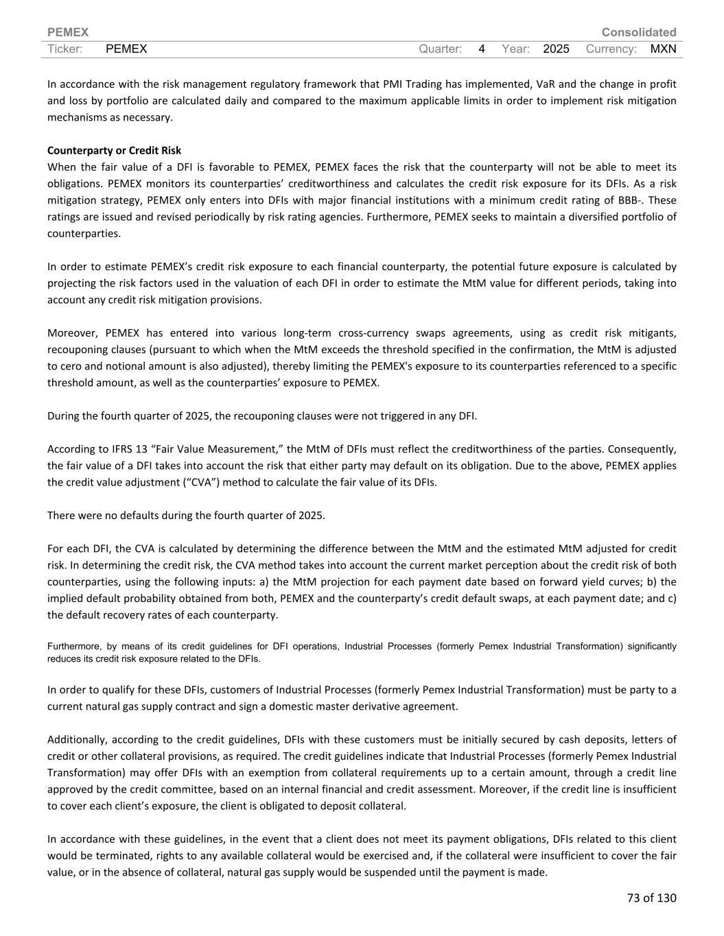 PEMEX Consolidated Ticker: PEMEX Quarter: 4 Year: 2025 Currency: MXN 73 of 130 In accordance with the risk management regulatory framework that PMI Trading has implemented, VaR and the change in profit and loss by portfolio are calculated daily and compared to the maximum applicable limits in order to implement risk mitigation mechanisms as necessary. Counterparty or Credit Risk When the fair value of a DFI is favorable to PEMEX, PEMEX faces the risk that the counterparty will not be able to meet its obligations. PEMEX monitors its counterparties’ creditworthiness and calculates the credit risk exposure for its DFIs. As a risk mitigation strategy, PEMEX only enters into DFIs with major financial institutions with a minimum credit rating of BBB-. These ratings are issued and revised periodically by risk rating agencies. Furthermore, PEMEX seeks to maintain a diversified portfolio of counterparties. In order to estimate PEMEX’s credit risk exposure to each financial counterparty, the potential future exposure is calculated by projecting the risk factors used in the valuation of each DFI in order to estimate the MtM value for different periods, taking into account any credit risk mitigation provisions. Moreover, PEMEX has entered into various long-term cross-currency swaps agreements, using as credit risk mitigants, recouponing clauses (pursuant to which when the MtM exceeds the threshold specified in the confirmation, the MtM is adjusted to cero and notional amount is also adjusted), thereby limiting the PEMEX's exposure to its counterparties referenced to a specific threshold amount, as well as the counterparties’ exposure to PEMEX. During the fourth quarter of 2025, the recouponing clauses were not triggered in any DFI. According to IFRS 13 “Fair Value Measurement,” the MtM of DFIs must reflect the creditworthiness of the parties. Consequently, the fair value of a DFI takes into account the risk that either party may default on its obligation. Due to the above, PEMEX applies the credit value adjustment (“CVA”) method to calculate the fair value of its DFIs. There were no defaults during the fourth quarter of 2025. For each DFI, the CVA is calculated by determining the difference between the MtM and the estimated MtM adjusted for credit risk. In determining the credit risk, the CVA method takes into account the current market perception about the credit risk of both counterparties, using the following inputs: a) the MtM projection for each payment date based on forward yield curves; b) the implied default probability obtained from both, PEMEX and the counterparty’s credit default swaps, at each payment date; and c) the default recovery rates of each counterparty. Furthermore, by means of its credit guidelines for DFI operations, Industrial Processes (formerly Pemex Industrial Transformation) significantly reduces its credit risk exposure related to the DFIs. In order to qualify for these DFIs, customers of Industrial Processes (formerly Pemex Industrial Transformation) must be party to a current natural gas supply contract and sign a domestic master derivative agreement. Additionally, according to the credit guidelines, DFIs with these customers must be initially secured by cash deposits, letters of credit or other collateral provisions, as required. The credit guidelines indicate that Industrial Processes (formerly Pemex Industrial Transformation) may offer DFIs with an exemption from collateral requirements up to a certain amount, through a credit line approved by the credit committee, based on an internal financial and credit assessment. Moreover, if the credit line is insufficient to cover each client’s exposure, the client is obligated to deposit collateral. In accordance with these guidelines, in the event that a client does not meet its payment obligations, DFIs related to this client would be terminated, rights to any available collateral would be exercised and, if the collateral were insufficient to cover the fair value, or in the absence of collateral, natural gas supply would be suspended until the payment is made.