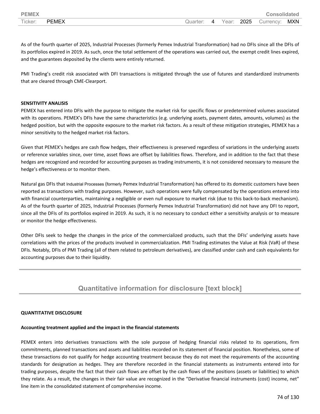 PEMEX Consolidated Ticker: PEMEX Quarter: 4 Year: 2025 Currency: MXN 74 of 130 As of the fourth quarter of 2025, Industrial Processes (formerly Pemex Industrial Transformation) had no DFIs since all the DFIs of its portfolios expired in 2019. As such, once the total settlement of the operations was carried out, the exempt credit lines expired, and the guarantees deposited by the clients were entirely returned. PMI Trading’s credit risk associated with DFI transactions is mitigated through the use of futures and standardized instruments that are cleared through CME-Clearport. SENSITIVITY ANALISIS PEMEX has entered into DFIs with the purpose to mitigate the market risk for specific flows or predetermined volumes associated with its operations. PEMEX’s DFIs have the same characteristics (e.g. underlying assets, payment dates, amounts, volumes) as the hedged position, but with the opposite exposure to the market risk factors. As a result of these mitigation strategies, PEMEX has a minor sensitivity to the hedged market risk factors. Given that PEMEX’s hedges are cash flow hedges, their effectiveness is preserved regardless of variations in the underlying assets or reference variables since, over time, asset flows are offset by liabilities flows. Therefore, and in addition to the fact that these hedges are recognized and recorded for accounting purposes as trading instruments, it is not considered necessary to measure the hedge’s effectiveness or to monitor them. Natural gas DFIs that Industrial Processes (formerly Pemex Industrial Transformation) has offered to its domestic customers have been reported as transactions with trading purposes. However, such operations were fully compensated by the operations entered into with financial counterparties, maintaining a negligible or even null exposure to market risk (due to this back-to-back mechanism). As of the fourth quarter of 2025, Industrial Processes (formerly Pemex Industrial Transformation) did not have any DFI to report, since all the DFIs of its portfolios expired in 2019. As such, it is no necessary to conduct either a sensitivity analysis or to measure or monitor the hedge effectiveness. Other DFIs seek to hedge the changes in the price of the commercialized products, such that the DFIs’ underlying assets have correlations with the prices of the products involved in commercialization. PMI Trading estimates the Value at Risk (VaR) of these DFIs. Notably, DFIs of PMI Trading (all of them related to petroleum derivatives), are classified under cash and cash equivalents for accounting purposes due to their liquidity. Quantitative information for disclosure [text block] QUANTITATIVE DISCLOSURE Accounting treatment applied and the impact in the financial statements PEMEX enters into derivatives transactions with the sole purpose of hedging financial risks related to its operations, firm commitments, planned transactions and assets and liabilities recorded on its statement of financial position. Nonetheless, some of these transactions do not qualify for hedge accounting treatment because they do not meet the requirements of the accounting standards for designation as hedges. They are therefore recorded in the financial statements as instruments entered into for trading purposes, despite the fact that their cash flows are offset by the cash flows of the positions (assets or liabilities) to which they relate. As a result, the changes in their fair value are recognized in the “Derivative financial instruments (cost) income, net” line item in the consolidated statement of comprehensive income.