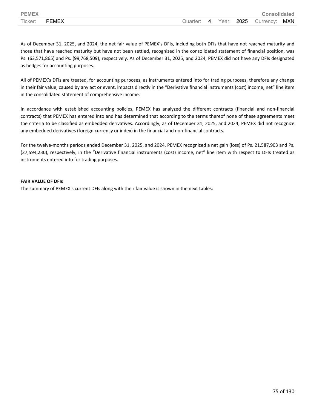 PEMEX Consolidated Ticker: PEMEX Quarter: 4 Year: 2025 Currency: MXN 75 of 130 As of December 31, 2025, and 2024, the net fair value of PEMEX’s DFIs, including both DFIs that have not reached maturity and those that have reached maturity but have not been settled, recognized in the consolidated statement of financial position, was Ps. (63,571,865) and Ps. (99,768,509), respectively. As of December 31, 2025, and 2024, PEMEX did not have any DFIs designated as hedges for accounting purposes. All of PEMEX’s DFIs are treated, for accounting purposes, as instruments entered into for trading purposes, therefore any change in their fair value, caused by any act or event, impacts directly in the “Derivative financial instruments (cost) income, net” line item in the consolidated statement of comprehensive income. In accordance with established accounting policies, PEMEX has analyzed the different contracts (financial and non-financial contracts) that PEMEX has entered into and has determined that according to the terms thereof none of these agreements meet the criteria to be classified as embedded derivatives. Accordingly, as of December 31, 2025, and 2024, PEMEX did not recognize any embedded derivatives (foreign currency or index) in the financial and non-financial contracts. For the twelve-months periods ended December 31, 2025, and 2024, PEMEX recognized a net gain (loss) of Ps. 21,587,903 and Ps. (27,594,230), respectively, in the “Derivative financial instruments (cost) income, net” line item with respect to DFIs treated as instruments entered into for trading purposes. FAIR VALUE OF DFIs The summary of PEMEX's current DFIs along with their fair value is shown in the next tables: