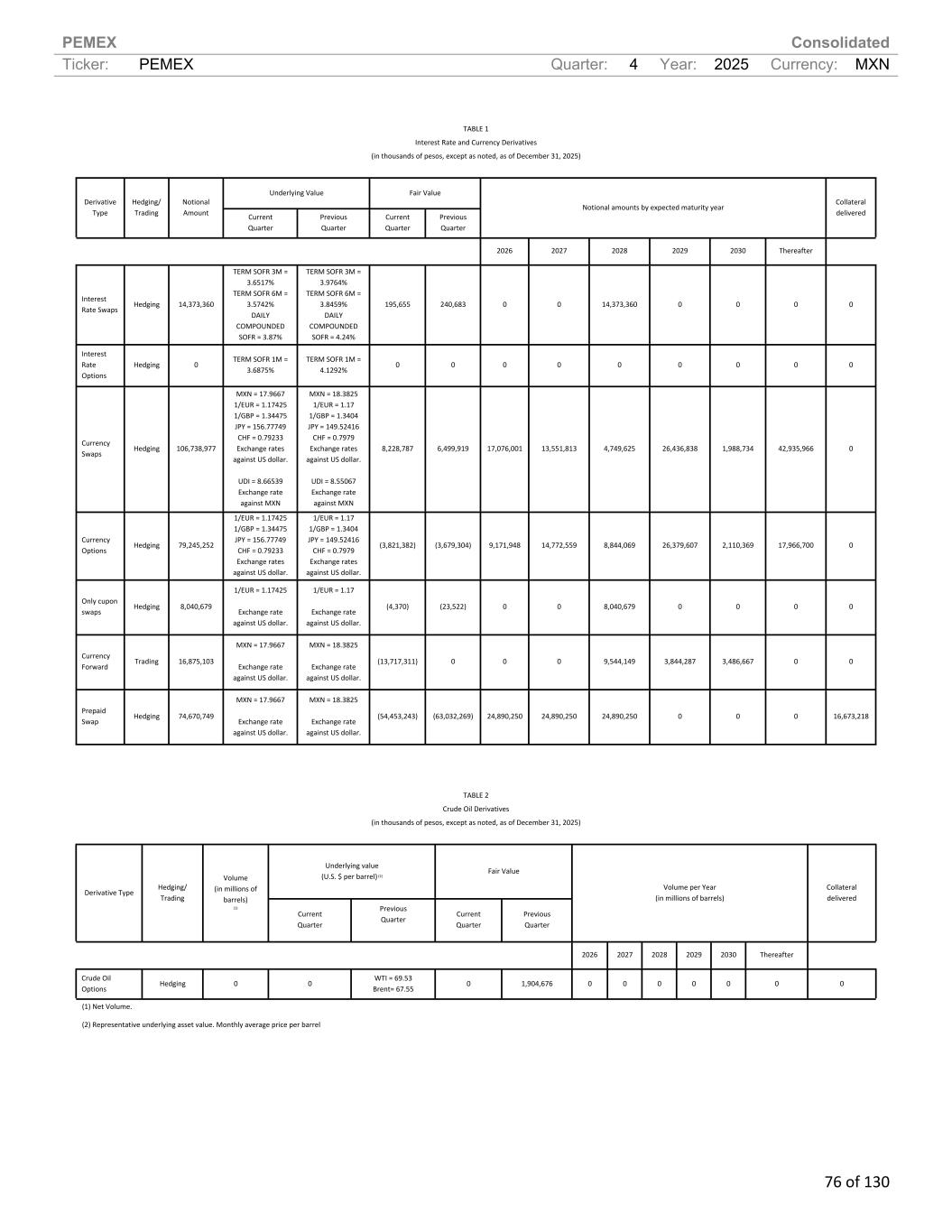 PEMEX Consolidated Ticker: PEMEX Quarter: 4 Year: 2025 Currency: MXN 76 of 130 TABLE 1 Interest Rate and Currency Derivatives (in thousands of pesos, except as noted, as of December 31, 2025) Underlying Value Fair Value Derivative Type Hedging/ Trading Notional Amount Current Quarter Previous Quarter Current Quarter Previous Quarter Notional amounts by expected maturity year Collateral delivered 2026 2027 2028 2029 2030 Thereafter Interest Rate Swaps Hedging 14,373,360 TERM SOFR 3M = 3.6517% TERM SOFR 6M = 3.5742% DAILY COMPOUNDED SOFR = 3.87% TERM SOFR 3M = 3.9764% TERM SOFR 6M = 3.8459% DAILY COMPOUNDED SOFR = 4.24% 195,655 240,683 0 0 14,373,360 0 0 0 0 Interest Rate Options Hedging 0 TERM SOFR 1M = 3.6875% TERM SOFR 1M = 4.1292% 0 0 0 0 0 0 0 0 0 Currency Swaps Hedging 106,738,977 MXN = 17.9667 1/EUR = 1.17425 1/GBP = 1.34475 JPY = 156.77749 CHF = 0.79233 Exchange rates against US dollar. UDI = 8.66539 Exchange rate against MXN MXN = 18.3825 1/EUR = 1.17 1/GBP = 1.3404 JPY = 149.52416 CHF = 0.7979 Exchange rates against US dollar. UDI = 8.55067 Exchange rate against MXN 8,228,787 6,499,919 17,076,001 13,551,813 4,749,625 26,436,838 1,988,734 42,935,966 0 Currency Options Hedging 79,245,252 1/EUR = 1.17425 1/GBP = 1.34475 JPY = 156.77749 CHF = 0.79233 Exchange rates against US dollar. 1/EUR = 1.17 1/GBP = 1.3404 JPY = 149.52416 CHF = 0.7979 Exchange rates against US dollar. (3,821,382) (3,679,304) 9,171,948 14,772,559 8,844,069 26,379,607 2,110,369 17,966,700 0 Only cupon swaps Hedging 8,040,679 1/EUR = 1.17425 Exchange rate against US dollar. 1/EUR = 1.17 Exchange rate against US dollar. (4,370) (23,522) 0 0 8,040,679 0 0 0 0 Currency Forward Trading 16,875,103 MXN = 17.9667 Exchange rate against US dollar. MXN = 18.3825 Exchange rate against US dollar. (13,717,311) 0 0 0 9,544,149 3,844,287 3,486,667 0 0 Prepaid Swap Hedging 74,670,749 MXN = 17.9667 Exchange rate against US dollar. MXN = 18.3825 Exchange rate against US dollar. (54,453,243) (63,032,269) 24,890,250 24,890,250 24,890,250 0 0 0 16,673,218 TABLE 2 Crude Oil Derivatives (in thousands of pesos, except as noted, as of December 31, 2025) Underlying value (U.S. $ per barrel) (2) Fair Value Derivative Type Hedging/ Trading Volume (in millions of barrels) (1) Current Quarter Previous Quarter Current Quarter Previous Quarter Volume per Year (in millions of barrels) Collateral delivered 2026 2027 2028 2029 2030 Thereafter Crude Oil Options Hedging 0 0 WTI = 69.53 Brent= 67.55 0 1,904,676 0 0 0 0 0 0 0 (1) Net Volume. (2) Representative underlying asset value. Monthly average price per barrel