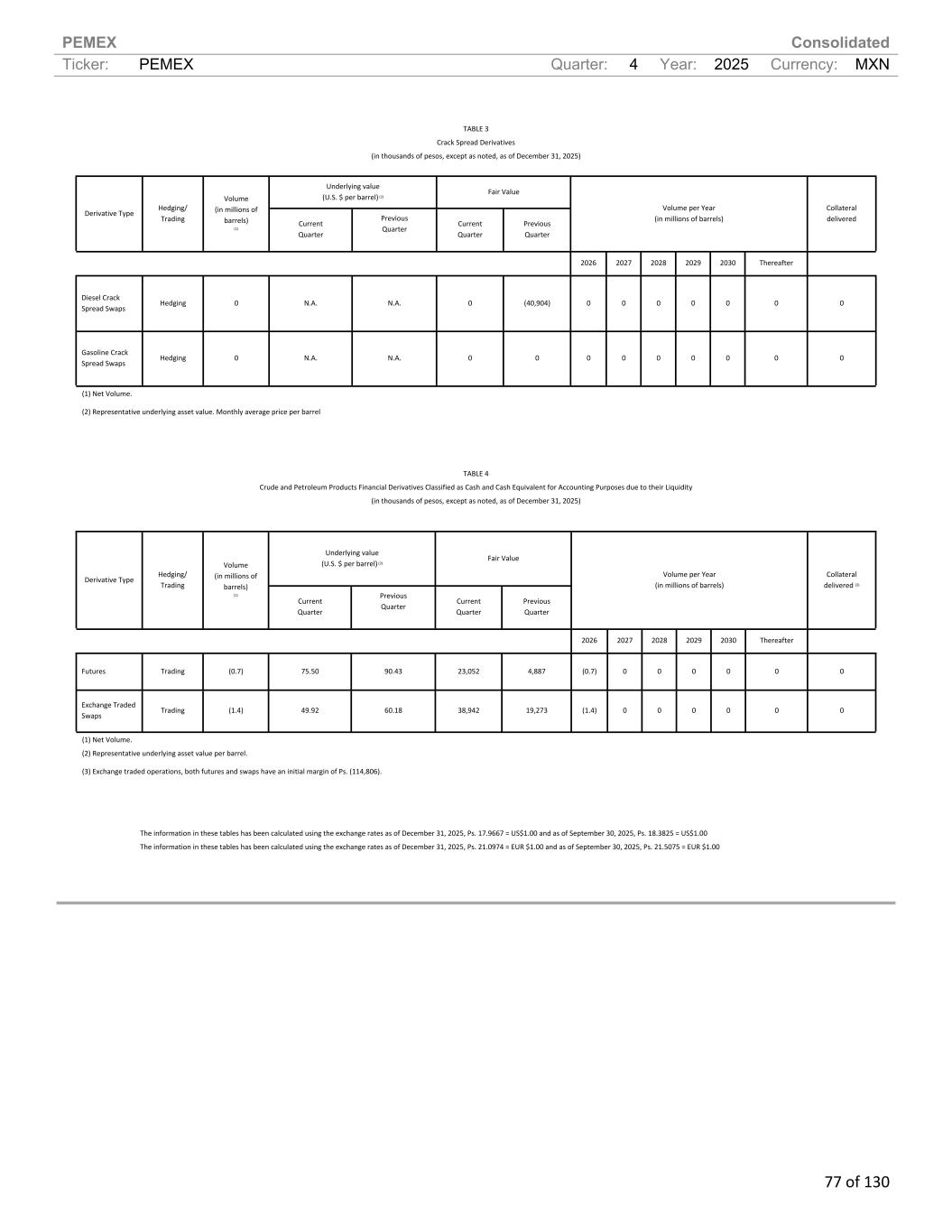 PEMEX Consolidated Ticker: PEMEX Quarter: 4 Year: 2025 Currency: MXN 77 of 130 TABLE 3 Crack Spread Derivatives (in thousands of pesos, except as noted, as of December 31, 2025) Underlying value (U.S. $ per barrel) (2) Fair Value Derivative Type Hedging/ Trading Volume (in millions of barrels) (1) Current Quarter Previous Quarter Current Quarter Previous Quarter Volume per Year (in millions of barrels) Collateral delivered 2026 2027 2028 2029 2030 Thereafter Diesel Crack Spread Swaps Hedging 0 N.A. N.A. 0 (40,904) 0 0 0 0 0 0 0 Gasoline Crack Spread Swaps Hedging 0 N.A. N.A. 0 0 0 0 0 0 0 0 0 (1) Net Volume. (2) Representative underlying asset value. Monthly average price per barrel TABLE 4 Crude and Petroleum Products Financial Derivatives Classified as Cash and Cash Equivalent for Accounting Purposes due to their Liquidity (in thousands of pesos, except as noted, as of December 31, 2025) Underlying value (U.S. $ per barrel) (2) Fair Value Derivative Type Hedging/ Trading Volume (in millions of barrels) (1) Current Quarter Previous Quarter Current Quarter Previous Quarter Volume per Year (in millions of barrels) Collateral delivered (3) 2026 2027 2028 2029 2030 Thereafter Futures Trading (0.7) 75.50 90.43 23,052 4,887 (0.7) 0 0 0 0 0 0 Exchange Traded Swaps Trading (1.4) 49.92 60.18 38,942 19,273 (1.4) 0 0 0 0 0 0 (1) Net Volume. (2) Representative underlying asset value per barrel. (3) Exchange traded operations, both futures and swaps have an initial margin of Ps. (114,806). The information in these tables has been calculated using the exchange rates as of December 31, 2025, Ps. 17.9667 = US$1.00 and as of September 30, 2025, Ps. 18.3825 = US$1.00 The information in these tables has been calculated using the exchange rates as of December 31, 2025, Ps. 21.0974 = EUR $1.00 and as of September 30, 2025, Ps. 21.5075 = EUR $1.00