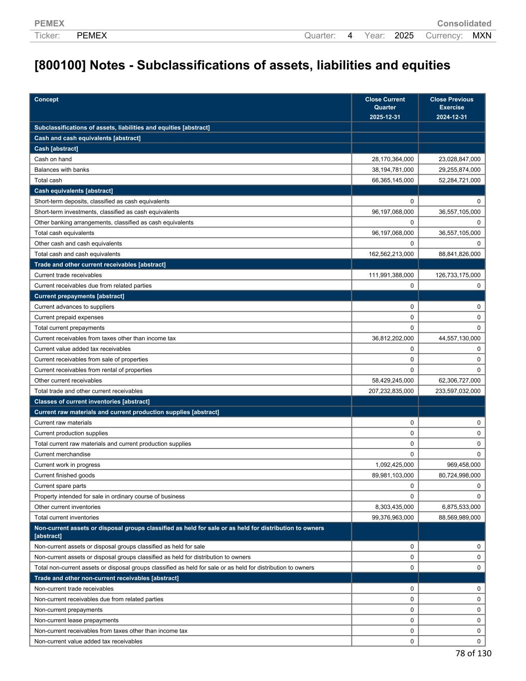PEMEX Consolidated Ticker: PEMEX Quarter: 4 Year: 2025 Currency: MXN 78 of 130 [800100] Notes - Subclassifications of assets, liabilities and equities Concept Close Current Quarter 2025-12-31 Close Previous Exercise 2024-12-31 Subclassifications of assets, liabilities and equities [abstract] Cash and cash equivalents [abstract] Cash [abstract] Cash on hand 28,170,364,000 23,028,847,000 Balances with banks 38,194,781,000 29,255,874,000 Total cash 66,365,145,000 52,284,721,000 Cash equivalents [abstract] Short-term deposits, classified as cash equivalents 0 0 Short-term investments, classified as cash equivalents 96,197,068,000 36,557,105,000 Other banking arrangements, classified as cash equivalents 0 0 Total cash equivalents 96,197,068,000 36,557,105,000 Other cash and cash equivalents 0 0 Total cash and cash equivalents 162,562,213,000 88,841,826,000 Trade and other current receivables [abstract] Current trade receivables 111,991,388,000 126,733,175,000 Current receivables due from related parties 0 0 Current prepayments [abstract] Current advances to suppliers 0 0 Current prepaid expenses 0 0 Total current prepayments 0 0 Current receivables from taxes other than income tax 36,812,202,000 44,557,130,000 Current value added tax receivables 0 0 Current receivables from sale of properties 0 0 Current receivables from rental of properties 0 0 Other current receivables 58,429,245,000 62,306,727,000 Total trade and other current receivables 207,232,835,000 233,597,032,000 Classes of current inventories [abstract] Current raw materials and current production supplies [abstract] Current raw materials 0 0 Current production supplies 0 0 Total current raw materials and current production supplies 0 0 Current merchandise 0 0 Current work in progress 1,092,425,000 969,458,000 Current finished goods 89,981,103,000 80,724,998,000 Current spare parts 0 0 Property intended for sale in ordinary course of business 0 0 Other current inventories 8,303,435,000 6,875,533,000 Total current inventories 99,376,963,000 88,569,989,000 Non-current assets or disposal groups classified as held for sale or as held for distribution to owners [abstract] Non-current assets or disposal groups classified as held for sale 0 0 Non-current assets or disposal groups classified as held for distribution to owners 0 0 Total non-current assets or disposal groups classified as held for sale or as held for distribution to owners 0 0 Trade and other non-current receivables [abstract] Non-current trade receivables 0 0 Non-current receivables due from related parties 0 0 Non-current prepayments 0 0 Non-current lease prepayments 0 0 Non-current receivables from taxes other than income tax 0 0 Non-current value added tax receivables 0 0