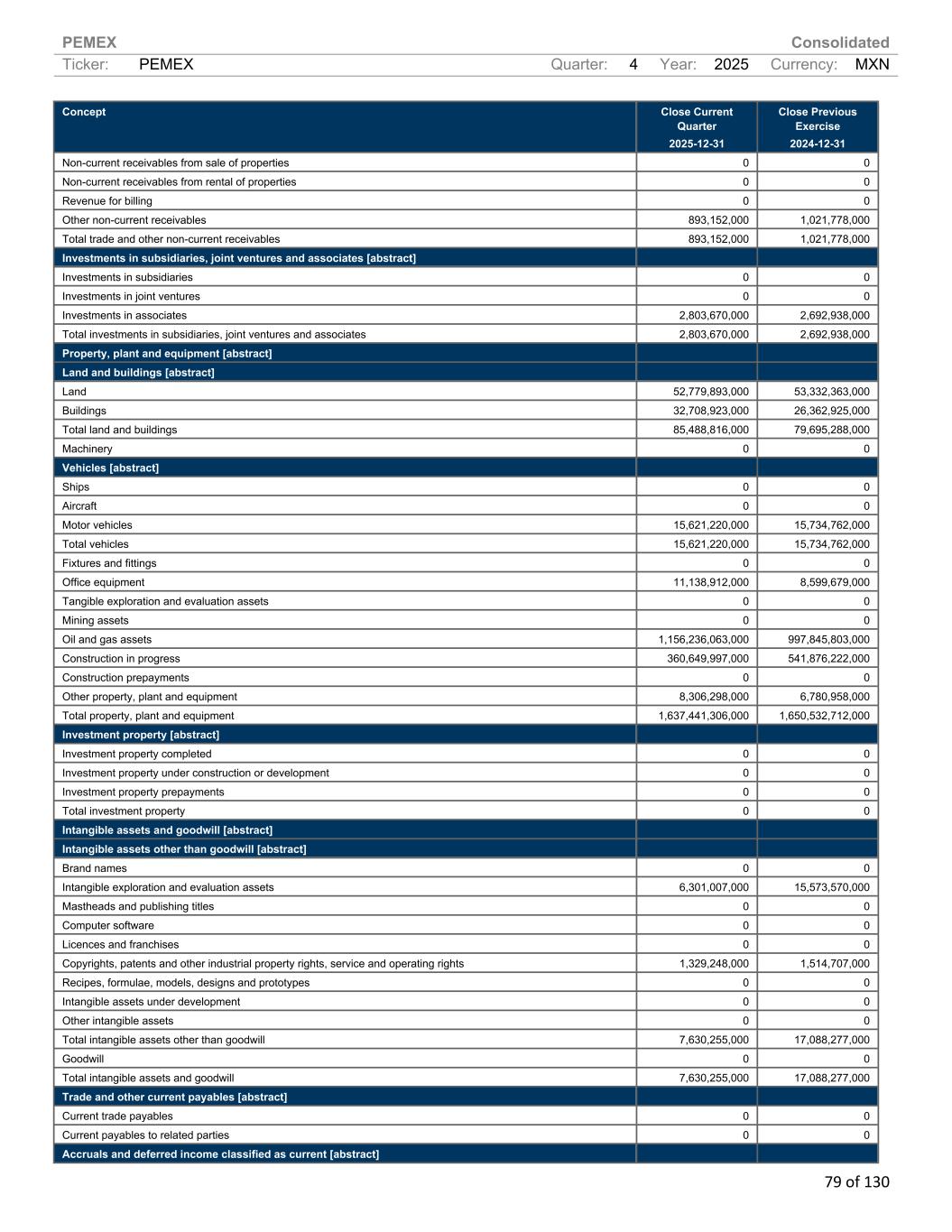 PEMEX Consolidated Ticker: PEMEX Quarter: 4 Year: 2025 Currency: MXN 79 of 130 Concept Close Current Quarter 2025-12-31 Close Previous Exercise 2024-12-31 Non-current receivables from sale of properties 0 0 Non-current receivables from rental of properties 0 0 Revenue for billing 0 0 Other non-current receivables 893,152,000 1,021,778,000 Total trade and other non-current receivables 893,152,000 1,021,778,000 Investments in subsidiaries, joint ventures and associates [abstract] Investments in subsidiaries 0 0 Investments in joint ventures 0 0 Investments in associates 2,803,670,000 2,692,938,000 Total investments in subsidiaries, joint ventures and associates 2,803,670,000 2,692,938,000 Property, plant and equipment [abstract] Land and buildings [abstract] Land 52,779,893,000 53,332,363,000 Buildings 32,708,923,000 26,362,925,000 Total land and buildings 85,488,816,000 79,695,288,000 Machinery 0 0 Vehicles [abstract] Ships 0 0 Aircraft 0 0 Motor vehicles 15,621,220,000 15,734,762,000 Total vehicles 15,621,220,000 15,734,762,000 Fixtures and fittings 0 0 Office equipment 11,138,912,000 8,599,679,000 Tangible exploration and evaluation assets 0 0 Mining assets 0 0 Oil and gas assets 1,156,236,063,000 997,845,803,000 Construction in progress 360,649,997,000 541,876,222,000 Construction prepayments 0 0 Other property, plant and equipment 8,306,298,000 6,780,958,000 Total property, plant and equipment 1,637,441,306,000 1,650,532,712,000 Investment property [abstract] Investment property completed 0 0 Investment property under construction or development 0 0 Investment property prepayments 0 0 Total investment property 0 0 Intangible assets and goodwill [abstract] Intangible assets other than goodwill [abstract] Brand names 0 0 Intangible exploration and evaluation assets 6,301,007,000 15,573,570,000 Mastheads and publishing titles 0 0 Computer software 0 0 Licences and franchises 0 0 Copyrights, patents and other industrial property rights, service and operating rights 1,329,248,000 1,514,707,000 Recipes, formulae, models, designs and prototypes 0 0 Intangible assets under development 0 0 Other intangible assets 0 0 Total intangible assets other than goodwill 7,630,255,000 17,088,277,000 Goodwill 0 0 Total intangible assets and goodwill 7,630,255,000 17,088,277,000 Trade and other current payables [abstract] Current trade payables 0 0 Current payables to related parties 0 0 Accruals and deferred income classified as current [abstract]