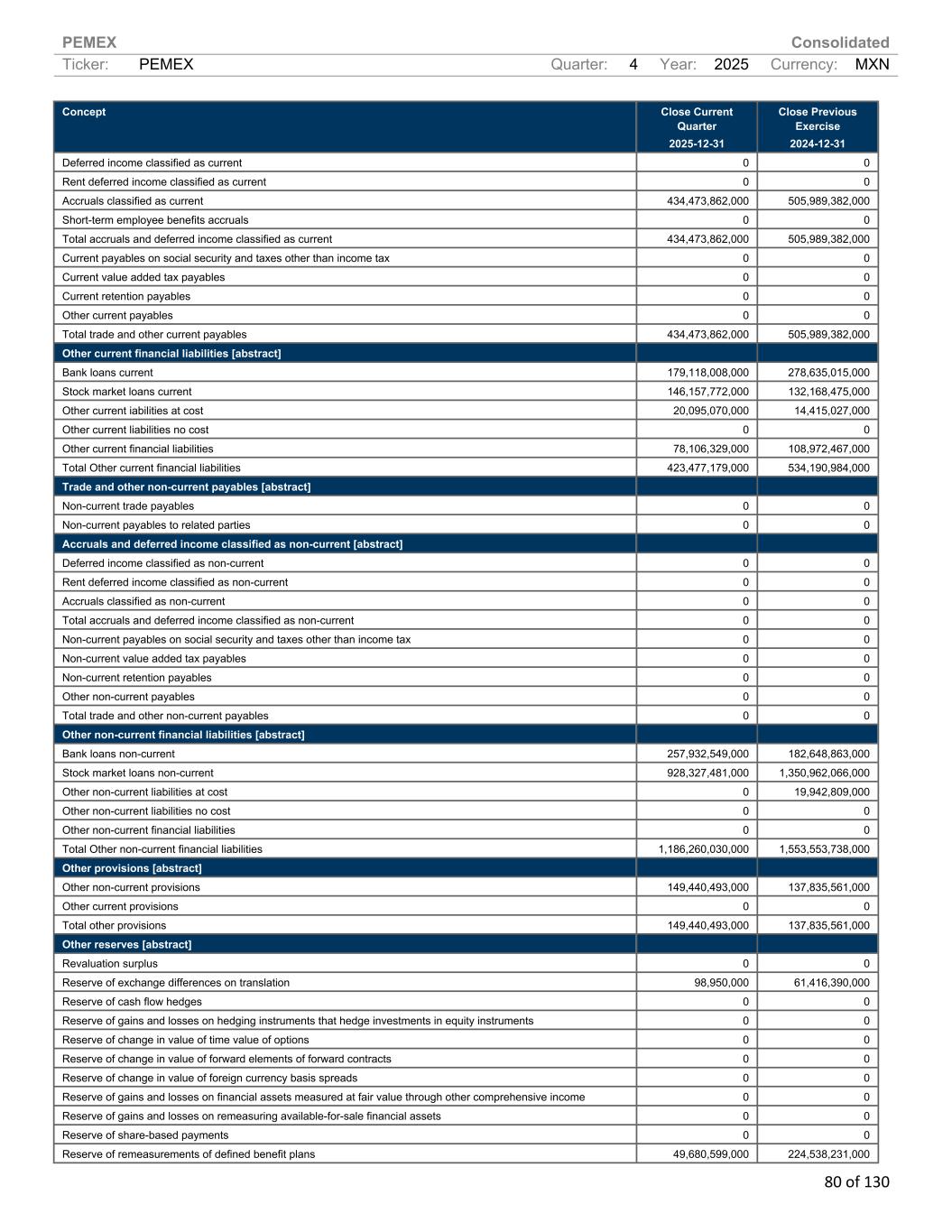 PEMEX Consolidated Ticker: PEMEX Quarter: 4 Year: 2025 Currency: MXN 80 of 130 Concept Close Current Quarter 2025-12-31 Close Previous Exercise 2024-12-31 Deferred income classified as current 0 0 Rent deferred income classified as current 0 0 Accruals classified as current 434,473,862,000 505,989,382,000 Short-term employee benefits accruals 0 0 Total accruals and deferred income classified as current 434,473,862,000 505,989,382,000 Current payables on social security and taxes other than income tax 0 0 Current value added tax payables 0 0 Current retention payables 0 0 Other current payables 0 0 Total trade and other current payables 434,473,862,000 505,989,382,000 Other current financial liabilities [abstract] Bank loans current 179,118,008,000 278,635,015,000 Stock market loans current 146,157,772,000 132,168,475,000 Other current iabilities at cost 20,095,070,000 14,415,027,000 Other current liabilities no cost 0 0 Other current financial liabilities 78,106,329,000 108,972,467,000 Total Other current financial liabilities 423,477,179,000 534,190,984,000 Trade and other non-current payables [abstract] Non-current trade payables 0 0 Non-current payables to related parties 0 0 Accruals and deferred income classified as non-current [abstract] Deferred income classified as non-current 0 0 Rent deferred income classified as non-current 0 0 Accruals classified as non-current 0 0 Total accruals and deferred income classified as non-current 0 0 Non-current payables on social security and taxes other than income tax 0 0 Non-current value added tax payables 0 0 Non-current retention payables 0 0 Other non-current payables 0 0 Total trade and other non-current payables 0 0 Other non-current financial liabilities [abstract] Bank loans non-current 257,932,549,000 182,648,863,000 Stock market loans non-current 928,327,481,000 1,350,962,066,000 Other non-current liabilities at cost 0 19,942,809,000 Other non-current liabilities no cost 0 0 Other non-current financial liabilities 0 0 Total Other non-current financial liabilities 1,186,260,030,000 1,553,553,738,000 Other provisions [abstract] Other non-current provisions 149,440,493,000 137,835,561,000 Other current provisions 0 0 Total other provisions 149,440,493,000 137,835,561,000 Other reserves [abstract] Revaluation surplus 0 0 Reserve of exchange differences on translation 98,950,000 61,416,390,000 Reserve of cash flow hedges 0 0 Reserve of gains and losses on hedging instruments that hedge investments in equity instruments 0 0 Reserve of change in value of time value of options 0 0 Reserve of change in value of forward elements of forward contracts 0 0 Reserve of change in value of foreign currency basis spreads 0 0 Reserve of gains and losses on financial assets measured at fair value through other comprehensive income 0 0 Reserve of gains and losses on remeasuring available-for-sale financial assets 0 0 Reserve of share-based payments 0 0 Reserve of remeasurements of defined benefit plans 49,680,599,000 224,538,231,000