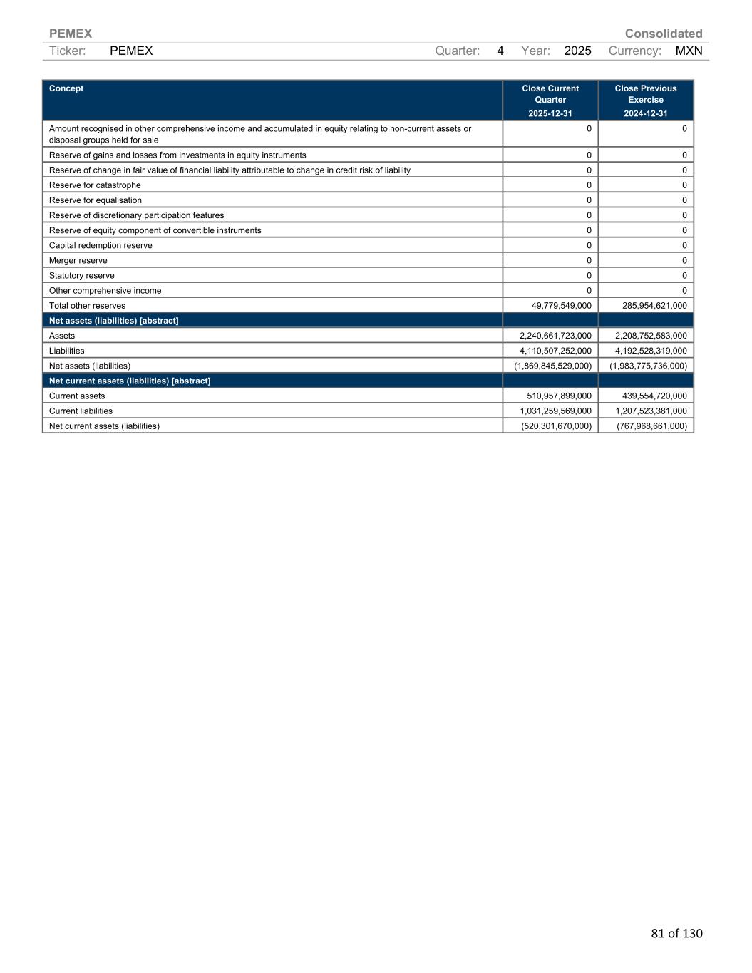 PEMEX Consolidated Ticker: PEMEX Quarter: 4 Year: 2025 Currency: MXN 81 of 130 Concept Close Current Quarter 2025-12-31 Close Previous Exercise 2024-12-31 Amount recognised in other comprehensive income and accumulated in equity relating to non-current assets or disposal groups held for sale 0 0 Reserve of gains and losses from investments in equity instruments 0 0 Reserve of change in fair value of financial liability attributable to change in credit risk of liability 0 0 Reserve for catastrophe 0 0 Reserve for equalisation 0 0 Reserve of discretionary participation features 0 0 Reserve of equity component of convertible instruments 0 0 Capital redemption reserve 0 0 Merger reserve 0 0 Statutory reserve 0 0 Other comprehensive income 0 0 Total other reserves 49,779,549,000 285,954,621,000 Net assets (liabilities) [abstract] Assets 2,240,661,723,000 2,208,752,583,000 Liabilities 4,110,507,252,000 4,192,528,319,000 Net assets (liabilities) (1,869,845,529,000) (1,983,775,736,000) Net current assets (liabilities) [abstract] Current assets 510,957,899,000 439,554,720,000 Current liabilities 1,031,259,569,000 1,207,523,381,000 Net current assets (liabilities) (520,301,670,000) (767,968,661,000)