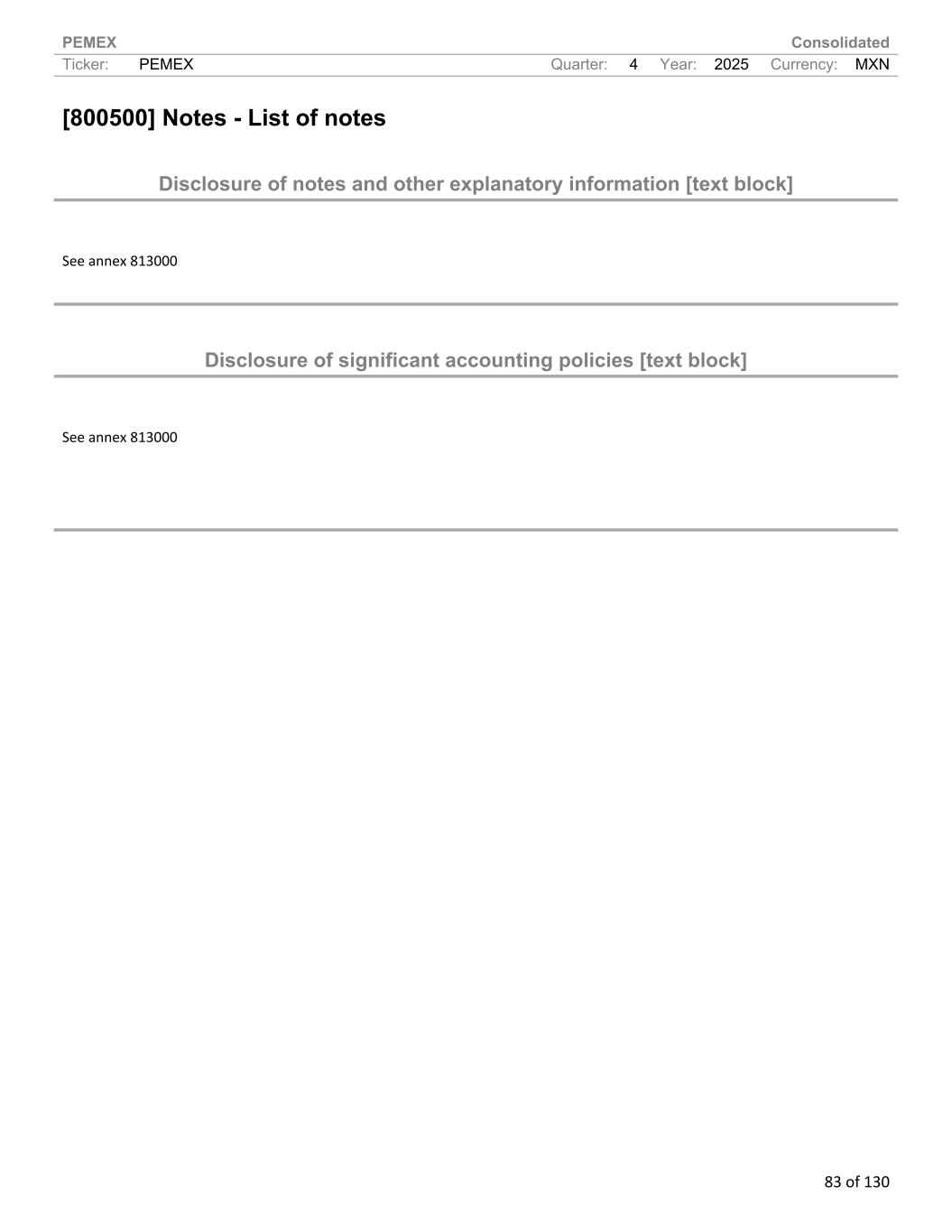PEMEX Consolidated Ticker: PEMEX Quarter: 4 Year: 2025 Currency: MXN 83 of 130 [800500] Notes - List of notes Disclosure of notes and other explanatory information [text block] See annex 813000 Disclosure of significant accounting policies [text block] See annex 813000