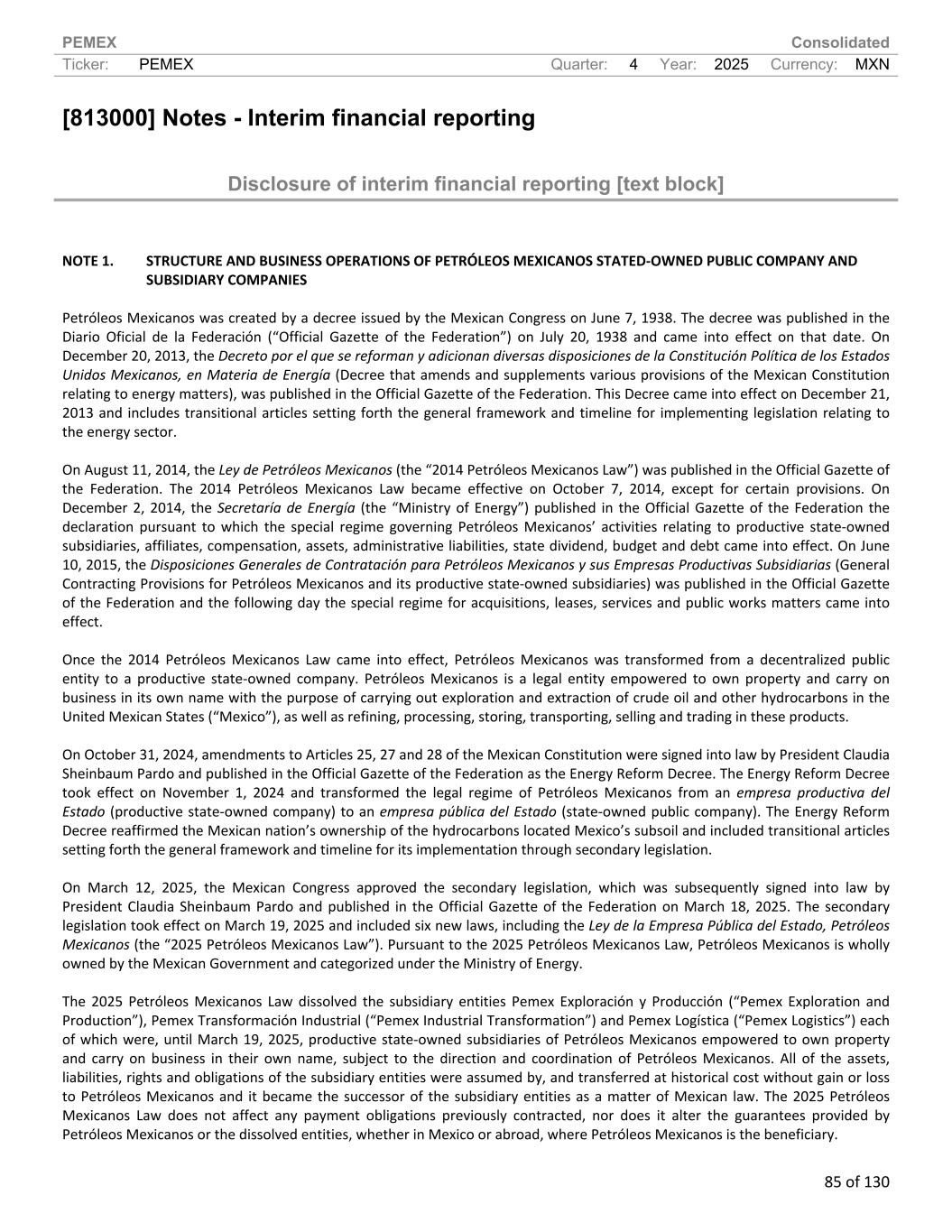PEMEX Consolidated Ticker: PEMEX Quarter: 4 Year: 2025 Currency: MXN 85 of 130 [813000] Notes - Interim financial reporting Disclosure of interim financial reporting [text block] NOTE 1. STRUCTURE AND BUSINESS OPERATIONS OF PETRÓLEOS MEXICANOS STATED-OWNED PUBLIC COMPANY AND SUBSIDIARY COMPANIES Petróleos Mexicanos was created by a decree issued by the Mexican Congress on June 7, 1938. The decree was published in the Diario Oficial de la Federación (“Official Gazette of the Federation”) on July 20, 1938 and came into effect on that date. On December 20, 2013, the Decreto por el que se reforman y adicionan diversas disposiciones de la Constitución Política de los Estados Unidos Mexicanos, en Materia de Energía (Decree that amends and supplements various provisions of the Mexican Constitution relating to energy matters), was published in the Official Gazette of the Federation. This Decree came into effect on December 21, 2013 and includes transitional articles setting forth the general framework and timeline for implementing legislation relating to the energy sector. On August 11, 2014, the Ley de Petróleos Mexicanos (the “2014 Petróleos Mexicanos Law”) was published in the Official Gazette of the Federation. The 2014 Petróleos Mexicanos Law became effective on October 7, 2014, except for certain provisions. On December 2, 2014, the Secretaría de Energía (the “Ministry of Energy”) published in the Official Gazette of the Federation the declaration pursuant to which the special regime governing Petróleos Mexicanos’ activities relating to productive state-owned subsidiaries, affiliates, compensation, assets, administrative liabilities, state dividend, budget and debt came into effect. On June 10, 2015, the Disposiciones Generales de Contratación para Petróleos Mexicanos y sus Empresas Productivas Subsidiarias (General Contracting Provisions for Petróleos Mexicanos and its productive state-owned subsidiaries) was published in the Official Gazette of the Federation and the following day the special regime for acquisitions, leases, services and public works matters came into effect. Once the 2014 Petróleos Mexicanos Law came into effect, Petróleos Mexicanos was transformed from a decentralized public entity to a productive state-owned company. Petróleos Mexicanos is a legal entity empowered to own property and carry on business in its own name with the purpose of carrying out exploration and extraction of crude oil and other hydrocarbons in the United Mexican States (“Mexico”), as well as refining, processing, storing, transporting, selling and trading in these products. On October 31, 2024, amendments to Articles 25, 27 and 28 of the Mexican Constitution were signed into law by President Claudia Sheinbaum Pardo and published in the Official Gazette of the Federation as the Energy Reform Decree. The Energy Reform Decree took effect on November 1, 2024 and transformed the legal regime of Petróleos Mexicanos from an empresa productiva del Estado (productive state-owned company) to an empresa pública del Estado (state-owned public company). The Energy Reform Decree reaffirmed the Mexican nation’s ownership of the hydrocarbons located Mexico’s subsoil and included transitional articles setting forth the general framework and timeline for its implementation through secondary legislation. On March 12, 2025, the Mexican Congress approved the secondary legislation, which was subsequently signed into law by President Claudia Sheinbaum Pardo and published in the Official Gazette of the Federation on March 18, 2025. The secondary legislation took effect on March 19, 2025 and included six new laws, including the Ley de la Empresa Pública del Estado, Petróleos Mexicanos (the “2025 Petróleos Mexicanos Law”). Pursuant to the 2025 Petróleos Mexicanos Law, Petróleos Mexicanos is wholly owned by the Mexican Government and categorized under the Ministry of Energy. The 2025 Petróleos Mexicanos Law dissolved the subsidiary entities Pemex Exploración y Producción (“Pemex Exploration and Production”), Pemex Transformación Industrial (“Pemex Industrial Transformation”) and Pemex Logística (“Pemex Logistics”) each of which were, until March 19, 2025, productive state-owned subsidiaries of Petróleos Mexicanos empowered to own property and carry on business in their own name, subject to the direction and coordination of Petróleos Mexicanos. All of the assets, liabilities, rights and obligations of the subsidiary entities were assumed by, and transferred at historical cost without gain or loss to Petróleos Mexicanos and it became the successor of the subsidiary entities as a matter of Mexican law. The 2025 Petróleos Mexicanos Law does not affect any payment obligations previously contracted, nor does it alter the guarantees provided by Petróleos Mexicanos or the dissolved entities, whether in Mexico or abroad, where Petróleos Mexicanos is the beneficiary.