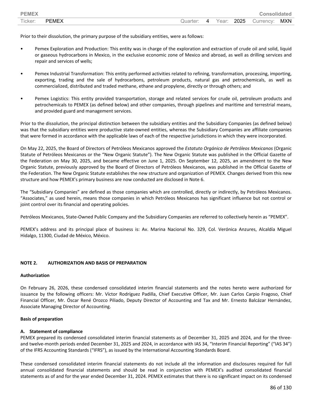 PEMEX Consolidated Ticker: PEMEX Quarter: 4 Year: 2025 Currency: MXN 86 of 130 Prior to their dissolution, the primary purpose of the subsidiary entities, were as follows: • Pemex Exploration and Production: This entity was in charge of the exploration and extraction of crude oil and solid, liquid or gaseous hydrocarbons in Mexico, in the exclusive economic zone of Mexico and abroad, as well as drilling services and repair and services of wells; • Pemex Industrial Transformation: This entity performed activities related to refining, transformation, processing, importing, exporting, trading and the sale of hydrocarbons, petroleum products, natural gas and petrochemicals, as well as commercialized, distributed and traded methane, ethane and propylene, directly or through others; and • Pemex Logistics: This entity provided transportation, storage and related services for crude oil, petroleum products and petrochemicals to PEMEX (as defined below) and other companies, through pipelines and maritime and terrestrial means, and provided guard and management services. Prior to the dissolution, the principal distinction between the subsidiary entities and the Subsidiary Companies (as defined below) was that the subsidiary entities were productive state-owned entities, whereas the Subsidiary Companies are affiliate companies that were formed in accordance with the applicable laws of each of the respective jurisdictions in which they were incorporated. On May 22, 2025, the Board of Directors of Petróleos Mexicanos approved the Estatuto Orgánico de Petróleos Mexicanos (Organic Statute of Petróleos Mexicanos or the “New Organic Statute”). The New Organic Statute was published in the Official Gazette of the Federation on May 30, 2025, and became effective on June 1, 2025. On September 12, 2025, an amendment to the New Organic Statute, previously approved by the Board of Directors of Petróleos Mexicanos, was published in the Official Gazette of the Federation. The New Organic Statute establishes the new structure and organization of PEMEX. Changes derived from this new structure and how PEMEX’s primary business are now conducted are disclosed in Note 6. The “Subsidiary Companies” are defined as those companies which are controlled, directly or indirectly, by Petróleos Mexicanos. “Associates,” as used herein, means those companies in which Petróleos Mexicanos has significant influence but not control or joint control over its financial and operating policies. Petróleos Mexicanos, State-Owned Public Company and the Subsidiary Companies are referred to collectively herein as “PEMEX”. PEMEX’s address and its principal place of business is: Av. Marina Nacional No. 329, Col. Verónica Anzures, Alcaldía Miguel Hidalgo, 11300, Ciudad de México, México. NOTE 2. AUTHORIZATION AND BASIS OF PREPARATION Authorization On February 26, 2026, these condensed consolidated interim financial statements and the notes hereto were authorized for issuance by the following officers: Mr. Víctor Rodríguez Padilla, Chief Executive Officer, Mr. Juan Carlos Carpio Fragoso, Chief Financial Officer, Mr. Óscar René Orozco Piliado, Deputy Director of Accounting and Tax and Mr. Ernesto Balcázar Hernández, Associate Managing Director of Accounting. Basis of preparation A. Statement of compliance PEMEX prepared its condensed consolidated interim financial statements as of December 31, 2025 and 2024, and for the three- and twelve-month periods ended December 31, 2025 and 2024, in accordance with IAS 34, “Interim Financial Reporting” (“IAS 34”) of the IFRS Accounting Standards (“IFRS”), as issued by the International Accounting Standards Board. These condensed consolidated interim financial statements do not include all the information and disclosures required for full annual consolidated financial statements and should be read in conjunction with PEMEX’s audited consolidated financial statements as of and for the year ended December 31, 2024. PEMEX estimates that there is no significant impact on its condensed