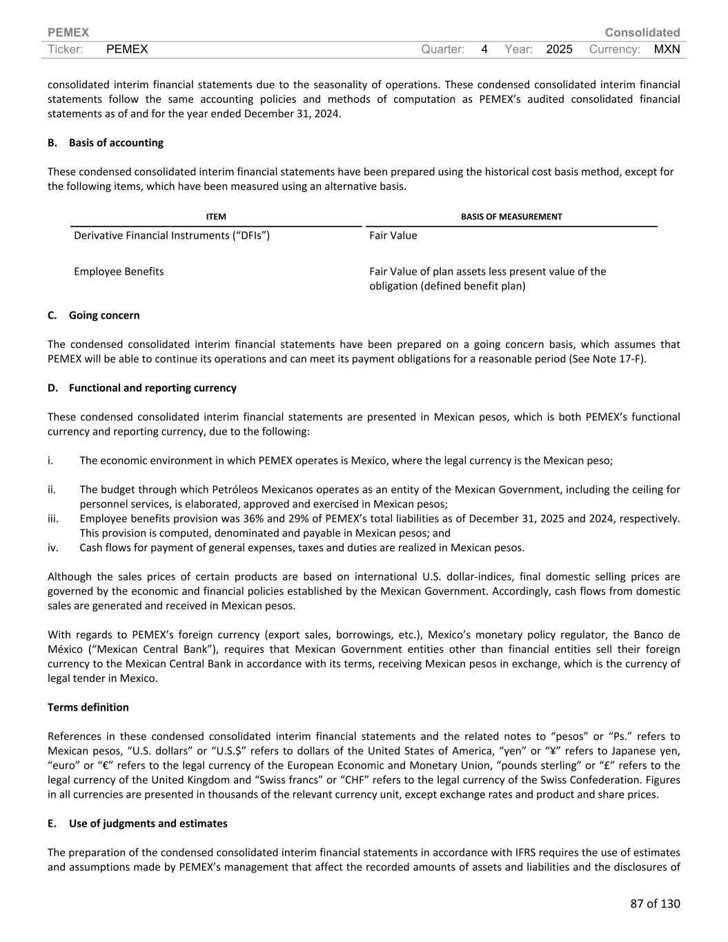 PEMEX Consolidated Ticker: PEMEX Quarter: 4 Year: 2025 Currency: MXN 87 of 130 consolidated interim financial statements due to the seasonality of operations. These condensed consolidated interim financial statements follow the same accounting policies and methods of computation as PEMEX’s audited consolidated financial statements as of and for the year ended December 31, 2024. B. Basis of accounting These condensed consolidated interim financial statements have been prepared using the historical cost basis method, except for the following items, which have been measured using an alternative basis. ITEM BASIS OF MEASUREMENT Derivative Financial Instruments (“DFIs”) Fair Value Employee Benefits Fair Value of plan assets less present value of the obligation (defined benefit plan) C. Going concern The condensed consolidated interim financial statements have been prepared on a going concern basis, which assumes that PEMEX will be able to continue its operations and can meet its payment obligations for a reasonable period (See Note 17-F). D. Functional and reporting currency These condensed consolidated interim financial statements are presented in Mexican pesos, which is both PEMEX’s functional currency and reporting currency, due to the following: i. The economic environment in which PEMEX operates is Mexico, where the legal currency is the Mexican peso; ii. The budget through which Petróleos Mexicanos operates as an entity of the Mexican Government, including the ceiling for personnel services, is elaborated, approved and exercised in Mexican pesos; iii. Employee benefits provision was 36% and 29% of PEMEX’s total liabilities as of December 31, 2025 and 2024, respectively. This provision is computed, denominated and payable in Mexican pesos; and iv. Cash flows for payment of general expenses, taxes and duties are realized in Mexican pesos. Although the sales prices of certain products are based on international U.S. dollar-indices, final domestic selling prices are governed by the economic and financial policies established by the Mexican Government. Accordingly, cash flows from domestic sales are generated and received in Mexican pesos. With regards to PEMEX’s foreign currency (export sales, borrowings, etc.), Mexico’s monetary policy regulator, the Banco de México (“Mexican Central Bank”), requires that Mexican Government entities other than financial entities sell their foreign currency to the Mexican Central Bank in accordance with its terms, receiving Mexican pesos in exchange, which is the currency of legal tender in Mexico. Terms definition References in these condensed consolidated interim financial statements and the related notes to “pesos” or “Ps.” refers to Mexican pesos, “U.S. dollars” or “U.S.$” refers to dollars of the United States of America, “yen” or “¥” refers to Japanese yen, “euro” or “€” refers to the legal currency of the European Economic and Monetary Union, “pounds sterling” or “£” refers to the legal currency of the United Kingdom and “Swiss francs” or “CHF” refers to the legal currency of the Swiss Confederation. Figures in all currencies are presented in thousands of the relevant currency unit, except exchange rates and product and share prices. E. Use of judgments and estimates The preparation of the condensed consolidated interim financial statements in accordance with IFRS requires the use of estimates and assumptions made by PEMEX’s management that affect the recorded amounts of assets and liabilities and the disclosures of