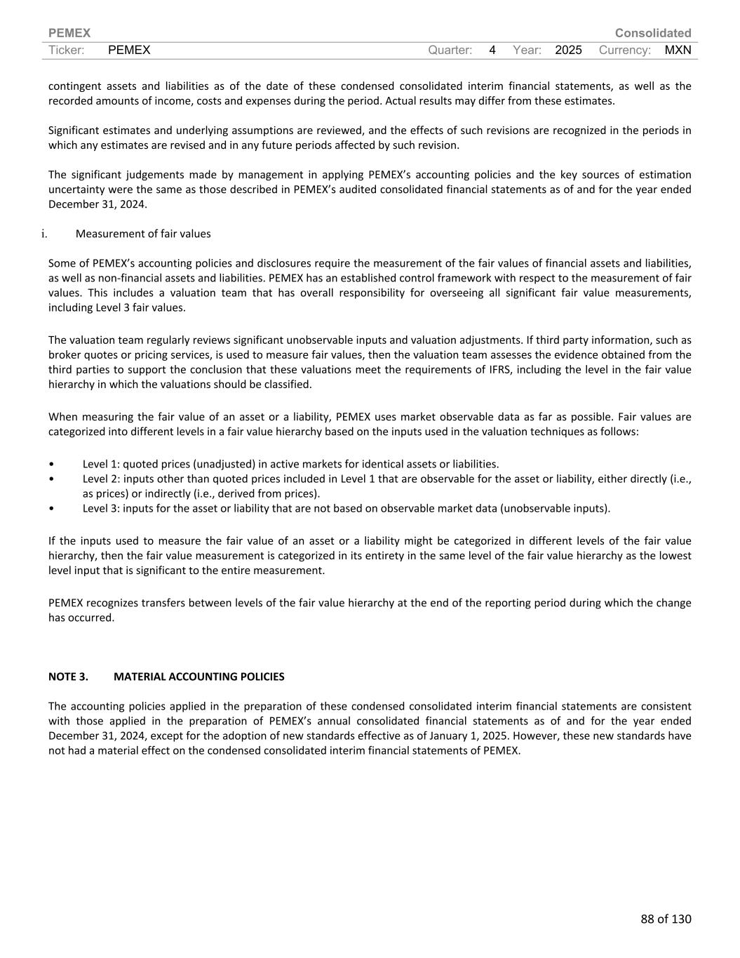 PEMEX Consolidated Ticker: PEMEX Quarter: 4 Year: 2025 Currency: MXN 88 of 130 contingent assets and liabilities as of the date of these condensed consolidated interim financial statements, as well as the recorded amounts of income, costs and expenses during the period. Actual results may differ from these estimates. Significant estimates and underlying assumptions are reviewed, and the effects of such revisions are recognized in the periods in which any estimates are revised and in any future periods affected by such revision. The significant judgements made by management in applying PEMEX’s accounting policies and the key sources of estimation uncertainty were the same as those described in PEMEX’s audited consolidated financial statements as of and for the year ended December 31, 2024. i. Measurement of fair values Some of PEMEX’s accounting policies and disclosures require the measurement of the fair values of financial assets and liabilities, as well as non-financial assets and liabilities. PEMEX has an established control framework with respect to the measurement of fair values. This includes a valuation team that has overall responsibility for overseeing all significant fair value measurements, including Level 3 fair values. The valuation team regularly reviews significant unobservable inputs and valuation adjustments. If third party information, such as broker quotes or pricing services, is used to measure fair values, then the valuation team assesses the evidence obtained from the third parties to support the conclusion that these valuations meet the requirements of IFRS, including the level in the fair value hierarchy in which the valuations should be classified. When measuring the fair value of an asset or a liability, PEMEX uses market observable data as far as possible. Fair values are categorized into different levels in a fair value hierarchy based on the inputs used in the valuation techniques as follows: • Level 1: quoted prices (unadjusted) in active markets for identical assets or liabilities. • Level 2: inputs other than quoted prices included in Level 1 that are observable for the asset or liability, either directly (i.e., as prices) or indirectly (i.e., derived from prices). • Level 3: inputs for the asset or liability that are not based on observable market data (unobservable inputs). If the inputs used to measure the fair value of an asset or a liability might be categorized in different levels of the fair value hierarchy, then the fair value measurement is categorized in its entirety in the same level of the fair value hierarchy as the lowest level input that is significant to the entire measurement. PEMEX recognizes transfers between levels of the fair value hierarchy at the end of the reporting period during which the change has occurred. NOTE 3. MATERIAL ACCOUNTING POLICIES The accounting policies applied in the preparation of these condensed consolidated interim financial statements are consistent with those applied in the preparation of PEMEX’s annual consolidated financial statements as of and for the year ended December 31, 2024, except for the adoption of new standards effective as of January 1, 2025. However, these new standards have not had a material effect on the condensed consolidated interim financial statements of PEMEX.