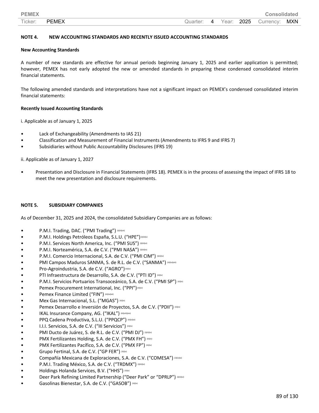 PEMEX Consolidated Ticker: PEMEX Quarter: 4 Year: 2025 Currency: MXN 89 of 130 NOTE 4. NEW ACCOUNTING STANDARDS AND RECENTLY ISSUED ACCOUNTING STANDARDS New Accounting Standards A number of new standards are effective for annual periods beginning January 1, 2025 and earlier application is permitted; however, PEMEX has not early adopted the new or amended standards in preparing these condensed consolidated interim financial statements. The following amended standards and interpretations have not a significant impact on PEMEX’s condensed consolidated interim financial statements: Recently Issued Accounting Standards i. Applicable as of January 1, 2025 • Lack of Exchangeability (Amendments to IAS 21) • Classification and Measurement of Financial Instruments (Amendments to IFRS 9 and IFRS 7) • Subsidiaries without Public Accountability Disclosures (IFRS 19) ii. Applicable as of January 1, 2027 • Presentation and Disclosure in Financial Statements (IFRS 18). PEMEX is in the process of assessing the impact of IFRS 18 to meet the new presentation and disclosure requirements. NOTE 5. SUBSIDIARY COMPANIES As of December 31, 2025 and 2024, the consolidated Subsidiary Companies are as follows: • P.M.I. Trading, DAC. (“PMI Trading”) (i)(iii)(vii) • P.M.I. Holdings Petróleos España, S.L.U. (“HPE”) (i)(iii)(v) • P.M.I. Services North America, Inc. (“PMI SUS”) (i)(iii)(vi) • P.M.I. Norteamérica, S.A. de C.V. (“PMI NASA”) (i)(iii)(iv) • P.M.I. Comercio Internacional, S.A. de C.V. (“PMI CIM”) (i)(ii)(iv) • PMI Campos Maduros SANMA, S. de R.L. de C.V. (“SANMA”) (iii)(iv)(xiii) • Pro-Agroindustria, S.A. de C.V. (“AGRO”) (iii)(iv) • PTI Infraestructura de Desarrollo, S.A. de C.V. (“PTI ID”) (iii)(iv) • P.M.I. Servicios Portuarios Transoceánico, S.A. de C.V. (“PMI SP”) (iii)(iv) • Pemex Procurement International, Inc. (“PPI”) (iii)(vi) • Pemex Finance Limited (“FIN”) (iii)(ix)(xii) • Mex Gas Internacional, S.L. (“MGAS”) (iii)(iv) • Pemex Desarrollo e Inversión de Proyectos, S.A. de C.V. (“PDII”) (iii)(iv) • IKAL Insurance Company, AG. (“IKAL”) (iii)(viii)(xiv) • PPQ Cadena Productiva, S.L.U. (“PPQCP”) (iii)(v)(xi) • I.I.I. Servicios, S.A. de C.V. (“III Servicios”) (iii)(iv) • PMI Ducto de Juárez, S. de R.L. de C.V. (“PMI DJ”) (i)(iii)(iv) • PMX Fertilizantes Holding, S.A. de C.V. (“PMX FH”) (iii)(iv) • PMX Fertilizantes Pacífico, S.A. de C.V. (“PMX FP”) (iii)(iv) • Grupo Fertinal, S.A. de C.V. (“GP FER”) (iii)(iv) • Compañía Mexicana de Exploraciones, S.A. de C.V. (“COMESA”) (ii)(iv)(xi) • P.M.I. Trading México, S.A. de C.V. (“TRDMX”) (i)(iii)(iv) • Holdings Holanda Services, B.V. (“HHS”) (iii)(x) • Deer Park Refining Limited Partnership (“Deer Park” or “DPRLP”) (i)(iii)(vi) • Gasolinas Bienestar, S.A. de C.V. (“GASOB”) (iii)(iv)