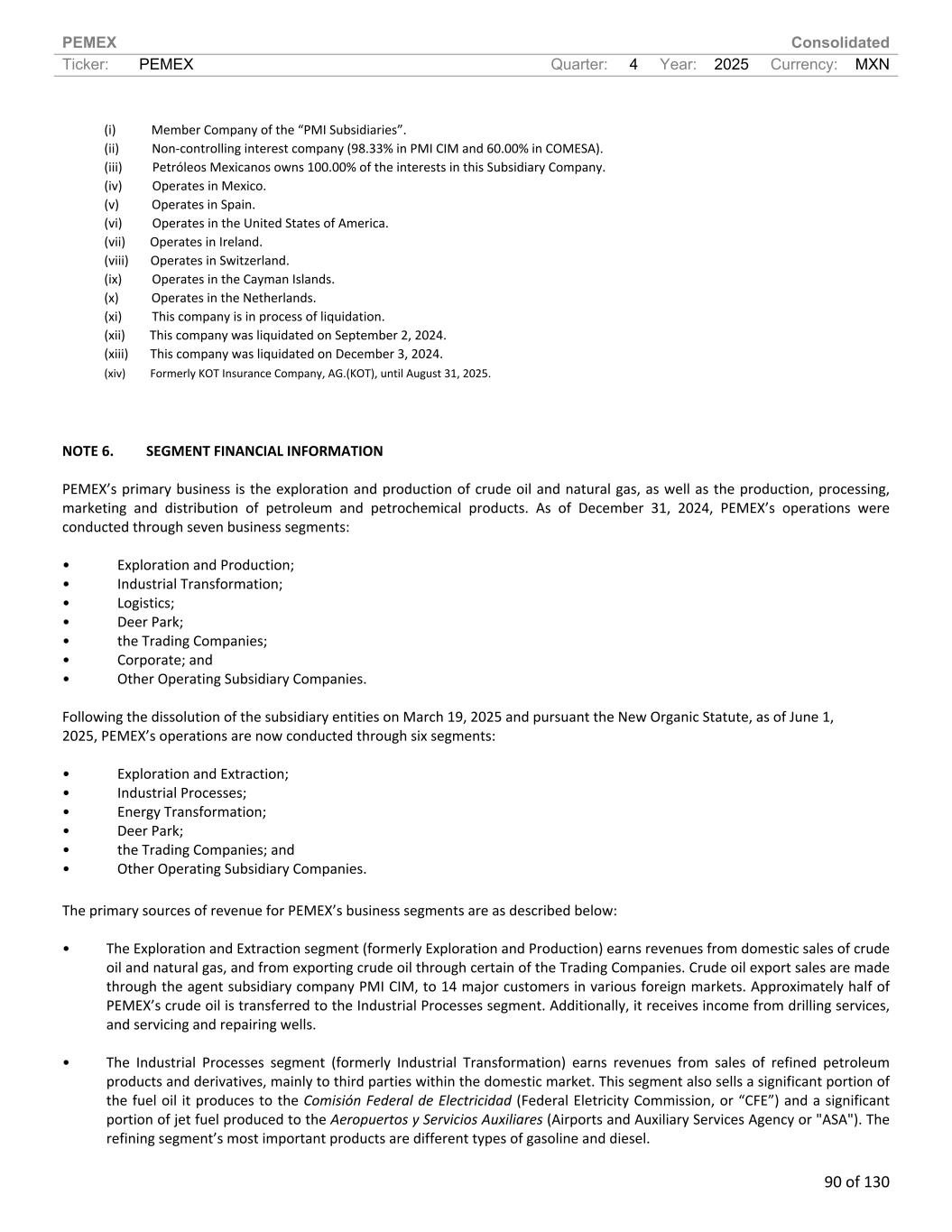 PEMEX Consolidated Ticker: PEMEX Quarter: 4 Year: 2025 Currency: MXN 90 of 130 (i) Member Company of the “PMI Subsidiaries”. (ii) Non-controlling interest company (98.33% in PMI CIM and 60.00% in COMESA). (iii) Petróleos Mexicanos owns 100.00% of the interests in this Subsidiary Company. (iv) Operates in Mexico. (v) Operates in Spain. (vi) Operates in the United States of America. (vii) Operates in Ireland. (viii) Operates in Switzerland. (ix) Operates in the Cayman Islands. (x) Operates in the Netherlands. (xi) This company is in process of liquidation. (xii) This company was liquidated on September 2, 2024. (xiii) This company was liquidated on December 3, 2024. (xiv) Formerly KOT Insurance Company, AG.(KOT), until August 31, 2025. NOTE 6. SEGMENT FINANCIAL INFORMATION PEMEX’s primary business is the exploration and production of crude oil and natural gas, as well as the production, processing, marketing and distribution of petroleum and petrochemical products. As of December 31, 2024, PEMEX’s operations were conducted through seven business segments: • Exploration and Production; • Industrial Transformation; • Logistics; • Deer Park; • the Trading Companies; • Corporate; and • Other Operating Subsidiary Companies. Following the dissolution of the subsidiary entities on March 19, 2025 and pursuant the New Organic Statute, as of June 1, 2025, PEMEX’s operations are now conducted through six segments: • Exploration and Extraction; • Industrial Processes; • Energy Transformation; • Deer Park; • the Trading Companies; and • Other Operating Subsidiary Companies. The primary sources of revenue for PEMEX’s business segments are as described below: • The Exploration and Extraction segment (formerly Exploration and Production) earns revenues from domestic sales of crude oil and natural gas, and from exporting crude oil through certain of the Trading Companies. Crude oil export sales are made through the agent subsidiary company PMI CIM, to 14 major customers in various foreign markets. Approximately half of PEMEX’s crude oil is transferred to the Industrial Processes segment. Additionally, it receives income from drilling services, and servicing and repairing wells. • The Industrial Processes segment (formerly Industrial Transformation) earns revenues from sales of refined petroleum products and derivatives, mainly to third parties within the domestic market. This segment also sells a significant portion of the fuel oil it produces to the Comisión Federal de Electricidad (Federal Eletricity Commission, or “CFE”) and a significant portion of jet fuel produced to the Aeropuertos y Servicios Auxiliares (Airports and Auxiliary Services Agency or "ASA"). The refining segment’s most important products are different types of gasoline and diesel.