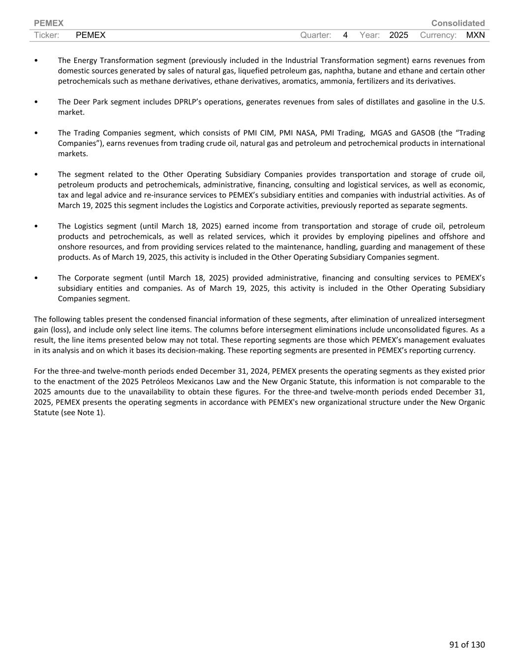 PEMEX Consolidated Ticker: PEMEX Quarter: 4 Year: 2025 Currency: MXN 91 of 130 • The Energy Transformation segment (previously included in the Industrial Transformation segment) earns revenues from domestic sources generated by sales of natural gas, liquefied petroleum gas, naphtha, butane and ethane and certain other petrochemicals such as methane derivatives, ethane derivatives, aromatics, ammonia, fertilizers and its derivatives. • The Deer Park segment includes DPRLP’s operations, generates revenues from sales of distillates and gasoline in the U.S. market. • The Trading Companies segment, which consists of PMI CIM, PMI NASA, PMI Trading, MGAS and GASOB (the “Trading Companies”), earns revenues from trading crude oil, natural gas and petroleum and petrochemical products in international markets. • The segment related to the Other Operating Subsidiary Companies provides transportation and storage of crude oil, petroleum products and petrochemicals, administrative, financing, consulting and logistical services, as well as economic, tax and legal advice and re-insurance services to PEMEX’s subsidiary entities and companies with industrial activities. As of March 19, 2025 this segment includes the Logistics and Corporate activities, previously reported as separate segments. • The Logistics segment (until March 18, 2025) earned income from transportation and storage of crude oil, petroleum products and petrochemicals, as well as related services, which it provides by employing pipelines and offshore and onshore resources, and from providing services related to the maintenance, handling, guarding and management of these products. As of March 19, 2025, this activity is included in the Other Operating Subsidiary Companies segment. • The Corporate segment (until March 18, 2025) provided administrative, financing and consulting services to PEMEX’s subsidiary entities and companies. As of March 19, 2025, this activity is included in the Other Operating Subsidiary Companies segment. The following tables present the condensed financial information of these segments, after elimination of unrealized intersegment gain (loss), and include only select line items. The columns before intersegment eliminations include unconsolidated figures. As a result, the line items presented below may not total. These reporting segments are those which PEMEX’s management evaluates in its analysis and on which it bases its decision-making. These reporting segments are presented in PEMEX’s reporting currency. For the three-and twelve-month periods ended December 31, 2024, PEMEX presents the operating segments as they existed prior to the enactment of the 2025 Petróleos Mexicanos Law and the New Organic Statute, this information is not comparable to the 2025 amounts due to the unavailability to obtain these figures. For the three-and twelve-month periods ended December 31, 2025, PEMEX presents the operating segments in accordance with PEMEX's new organizational structure under the New Organic Statute (see Note 1).