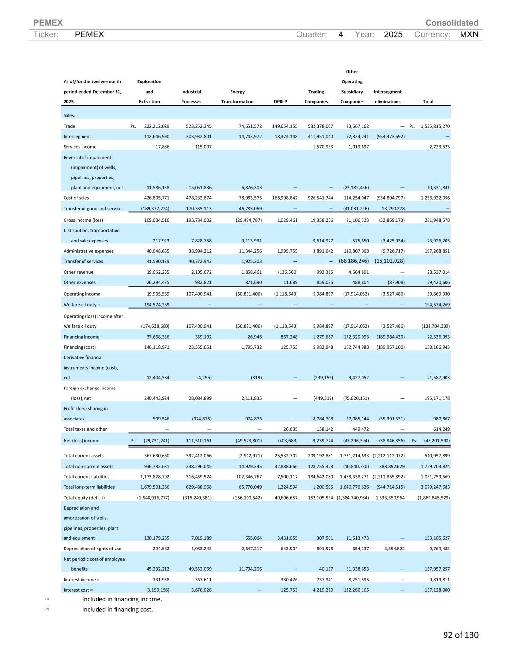 PEMEX Consolidated Ticker: PEMEX Quarter: 4 Year: 2025 Currency: MXN 92 of 130 As of/for the twelve-month period ended December 31, 2025 Exploration and Extraction Industrial Processes Energy Transformation DPRLP Trading Companies Other Operating Subsidiary Companies Intersegment eliminations Total Sales: Trade Ps. 222,212,029 523,252,345 74,651,572 149,654,155 532,378,007 23,667,162 — Ps. 1,525,815,270 Intersegment 112,646,990 303,932,801 14,743,972 18,374,148 411,951,040 92,824,741 (954,473,692) — Services income 17,886 115,007 — — 1,570,933 1,019,697 — 2,723,523 Reversal of impairment (impairment) of wells, pipelines, properties, plant and equipment, net 11,586,158 15,051,836 6,876,303 — — (23,182,456) — 10,331,841 Cost of sales 426,805,771 478,232,874 78,983,575 166,998,842 926,541,744 114,254,047 (934,894,797) 1,256,922,056 Transfer of good and services (189,377,224) 170,335,113 46,783,059 — — (41,031,226) 13,290,278 — Gross income (loss) 109,034,516 193,784,002 (29,494,787) 1,029,461 19,358,236 21,106,323 (32,869,173) 281,948,578 Distribution, transportation and sale expenses 217,923 7,828,758 9,113,931 — 9,614,977 575,650 (3,425,034) 23,926,205 Administrative expenses 40,048,635 38,904,212 11,344,256 1,999,755 3,891,642 110,807,068 (9,726,717) 197,268,851 Transfer of services 41,590,129 40,772,942 1,925,203 — — (68,186,246) (16,102,028) — Other revenue 19,052,235 2,105,672 1,858,461 (136,560) 992,315 4,664,891 — 28,537,014 Other expenses 26,294,475 982,821 871,690 11,689 859,035 488,804 (87,908) 29,420,606 Operating income 19,935,589 107,400,941 (50,891,406) (1,118,543) 5,984,897 (17,914,062) (3,527,486) 59,869,930 Welfare oil duty (3) 194,574,269 — — — — — — 194,574,269 Operating (loss) income after Welfare oil duty (174,638,680) 107,400,941 (50,891,406) (1,118,543) 5,984,897 (17,914,062) (3,527,486) (134,704,339) Financing income 37,668,356 359,102 26,946 867,248 1,279,687 172,320,093 (189,984,439) 22,536,993 Financing (cost) 146,118,971 23,355,651 1,795,732 125,753 5,982,948 162,744,988 (189,957,100) 150,166,943 Derivative financial instruments income (cost), net 12,404,584 (4,255) (319) — (239,159) 9,427,052 — 21,587,903 Foreign exchange income (loss), net 240,443,924 28,084,899 2,111,835 — (449,319) (75,020,161) — 195,171,178 Profit (loss) sharing in associates 509,546 (974,875) 974,875 — 8,784,708 27,085,144 (35,391,531) 987,867 Total taxes and other — — — 26,635 138,142 449,472 — 614,249 Net (loss) income Ps. (29,731,241) 111,510,161 (49,573,801) (403,683) 9,239,724 (47,296,394) (38,946,356) Ps. (45,201,590) Total current assets 367,630,660 392,412,066 (2,912,971) 25,532,702 209,192,881 1,731,214,633 (2,212,112,072) 510,957,899 Total non-current assets 936,782,631 238,296,045 14,929,245 32,888,666 128,755,328 (10,840,720) 388,892,629 1,729,703,824 Total current liabilities 1,173,828,702 316,459,524 102,346,767 7,500,117 184,642,080 1,458,338,271 (2,211,855,892) 1,031,259,569 Total long-term liabilities 1,679,501,366 629,488,968 65,770,049 1,224,594 1,200,595 1,646,776,626 (944,714,515) 3,079,247,683 Total equity (deficit) (1,548,916,777) (315,240,381) (156,100,542) 49,696,657 152,105,534 (1,384,740,984) 1,333,350,964 (1,869,845,529) Depreciation and amortization of wells, pipelines, properties, plant and equipment 130,179,285 7,019,189 655,064 3,431,055 307,561 11,513,473 — 153,105,627 Depreciation of rights of use 294,582 1,083,243 2,647,217 643,904 891,578 654,137 3,554,822 9,769,483 Net periodic cost of employee benefits 45,232,212 49,552,069 11,794,206 — 40,117 51,338,653 — 157,957,257 Interest income (1) 131,938 367,611 — 330,426 737,941 8,251,895 — 9,819,811 Interest cost (2) (3,159,156) 3,676,028 — 125,753 4,219,210 132,266,165 — 137,128,000 (1) Included in financing income. (2) Included in financing cost.