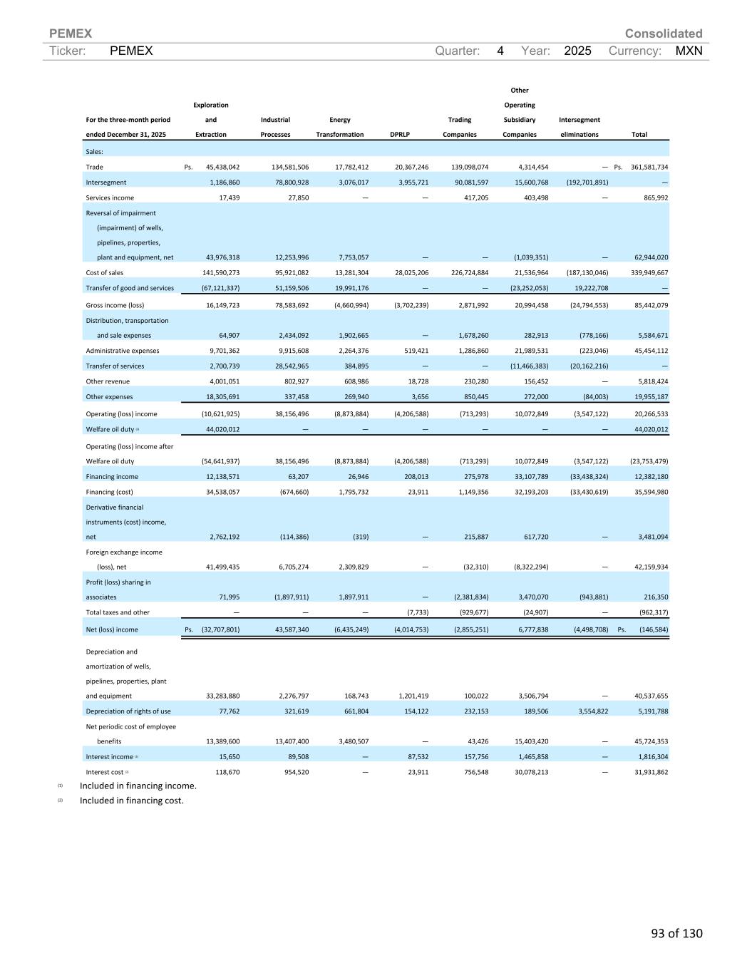 PEMEX Consolidated Ticker: PEMEX Quarter: 4 Year: 2025 Currency: MXN 93 of 130 For the three-month period ended December 31, 2025 Exploration and Extraction Industrial Processes Energy Transformation DPRLP Trading Companies Other Operating Subsidiary Companies Intersegment eliminations Total Sales: Trade Ps. 45,438,042 134,581,506 17,782,412 20,367,246 139,098,074 4,314,454 — Ps. 361,581,734 Intersegment 1,186,860 78,800,928 3,076,017 3,955,721 90,081,597 15,600,768 (192,701,891) — Services income 17,439 27,850 — — 417,205 403,498 — 865,992 Reversal of impairment (impairment) of wells, pipelines, properties, plant and equipment, net 43,976,318 12,253,996 7,753,057 — — (1,039,351) — 62,944,020 Cost of sales 141,590,273 95,921,082 13,281,304 28,025,206 226,724,884 21,536,964 (187,130,046) 339,949,667 Transfer of good and services (67,121,337) 51,159,506 19,991,176 — — (23,252,053) 19,222,708 — Gross income (loss) 16,149,723 78,583,692 (4,660,994) (3,702,239) 2,871,992 20,994,458 (24,794,553) 85,442,079 Distribution, transportation and sale expenses 64,907 2,434,092 1,902,665 — 1,678,260 282,913 (778,166) 5,584,671 Administrative expenses 9,701,362 9,915,608 2,264,376 519,421 1,286,860 21,989,531 (223,046) 45,454,112 Transfer of services 2,700,739 28,542,965 384,895 — — (11,466,383) (20,162,216) — Other revenue 4,001,051 802,927 608,986 18,728 230,280 156,452 — 5,818,424 Other expenses 18,305,691 337,458 269,940 3,656 850,445 272,000 (84,003) 19,955,187 Operating (loss) income (10,621,925) 38,156,496 (8,873,884) (4,206,588) (713,293) 10,072,849 (3,547,122) 20,266,533 Welfare oil duty (3) 44,020,012 — — — — — — 44,020,012 Operating (loss) income after Welfare oil duty (54,641,937) 38,156,496 (8,873,884) (4,206,588) (713,293) 10,072,849 (3,547,122) (23,753,479) Financing income 12,138,571 63,207 26,946 208,013 275,978 33,107,789 (33,438,324) 12,382,180 Financing (cost) 34,538,057 (674,660) 1,795,732 23,911 1,149,356 32,193,203 (33,430,619) 35,594,980 Derivative financial instruments (cost) income, net 2,762,192 (114,386) (319) — 215,887 617,720 — 3,481,094 Foreign exchange income (loss), net 41,499,435 6,705,274 2,309,829 — (32,310) (8,322,294) — 42,159,934 Profit (loss) sharing in associates 71,995 (1,897,911) 1,897,911 — (2,381,834) 3,470,070 (943,881) 216,350 Total taxes and other — — — (7,733) (929,677) (24,907) — (962,317) Net (loss) income Ps. (32,707,801) 43,587,340 (6,435,249) (4,014,753) (2,855,251) 6,777,838 (4,498,708) Ps. (146,584) Depreciation and amortization of wells, pipelines, properties, plant and equipment 33,283,880 2,276,797 168,743 1,201,419 100,022 3,506,794 — 40,537,655 Depreciation of rights of use 77,762 321,619 661,804 154,122 232,153 189,506 3,554,822 5,191,788 Net periodic cost of employee benefits 13,389,600 13,407,400 3,480,507 — 43,426 15,403,420 — 45,724,353 Interest income (1) 15,650 89,508 — 87,532 157,756 1,465,858 — 1,816,304 Interest cost (2) 118,670 954,520 — 23,911 756,548 30,078,213 — 31,931,862 (1) Included in financing income. (2) Included in financing cost.