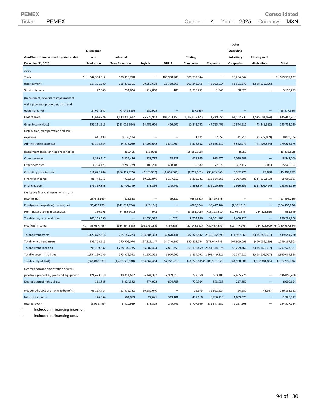 PEMEX Consolidated Ticker: PEMEX Quarter: 4 Year: 2025 Currency: MXN 94 of 130 As of/for the twelve-month period ended December 31, 2024 Exploration and Production Industrial Transformation Logistics DPRLP Trading Companies Corporate Other Operating Subsidiary Companies Intersegment eliminations Total Sales: Trade Ps. 347,550,312 628,918,718 — 165,980,709 506,782,844 — 20,284,544 — P1,669,517,127 Intersegment 517,221,080 355,276,301 90,057,618 15,758,565 509,246,055 48,982,014 51,691,573 (1,588,233,206) — Services income 27,348 731,624 414,098 485 1,950,251 1,045 30,928 — 3,155,779 (Impairment) reversal of impairment of wells, pipelines, properties, plant and equipment, net 24,027,347 (78,049,865) 582,923 — (37,985) — — — (53,477,580) Cost of sales 533,614,774 1,119,899,412 76,270,963 181,283,153 1,007,097,423 1,249,656 61,132,730 (1,545,084,824) 1,435,463,287 Gross income (loss) 355,211,313 (213,022,634) 14,783,676 456,606 10,843,742 47,733,403 10,874,315 (43,148,382) 183,732,039 Distribution, transportation and sale expenses 641,499 9,130,174 — — 31,101 7,859 41,210 (1,772,009) 8,079,834 Administrative expenses 47,302,354 54,975,089 17,799,642 1,841,704 3,528,532 86,635,110 8,532,279 (41,408,534) 179,206,176 Impairment losses on trade receivables — 866,405 (158,008) — (16,155,808) — 8,853 — (15,438,558) Other revenue 8,599,117 5,427,426 828,787 18,921 679,985 983,270 2,010,503 — 18,548,009 Other expenses 4,794,173 9,283,729 483,210 498,188 65,887 77,670 337,412 5,083 15,545,352 Operating (loss) income 311,072,404 (280,117,795) (2,828,397) (1,864,365) (8,257,601) (38,003,966) 3,982,770 27,078 (15,989,872) Financing income 81,442,953 915,653 19,927,846 1,177,512 1,296,321 226,654,666 2,087,505 (317,832,573) 15,669,883 Financing cost 171,319,838 57,706,799 378,866 245,442 7,868,834 236,220,806 2,966,859 (317,805,494) 158,901,950 Derivative financial instruments (cost) income, net (25,445,169) 215,388 — 99,580 (664,381) (1,799,648) — — (27,594,230) Foreign exchange (loss) income, net (95,489,278) (242,811,794) (425,181) — (800,834) 39,427,764 (4,352,913) — (304,452,236) Profit (loss) sharing in associates 360,996 (4,688,971) 943 — (3,151,006) (716,122,380) (10,061,543) 734,623,610 961,649 Total duties, taxes and other 189,239,536 — 42,551,529 (1,827) 2,702,256 54,351,481 1,438,223 — 290,281,198 Net (loss) income Ps. (88,617,468) (584,194,318) (26,255,184) (830,888) (22,148,591) (780,415,851) (12,749,263) 734,623,609 Ps. (780,587,954) Total current assets 1,122,872,816 225,147,273 294,804,303 32,870,141 287,375,832 2,040,342,693 111,987,963 (3,675,846,301) 439,554,720 Total non-current assets 938,768,113 590,508,074 127,928,147 34,744,185 130,862,284 (171,049,739) 567,969,098 (450,532,299) 1,769,197,863 Total current liabilities 696,209,532 1,728,102,735 86,307,404 7,891,750 255,198,459 2,051,344,378 58,229,460 (3,675,760,337) 1,207,523,381 Total long-term liabilities 1,934,280,036 575,378,552 71,857,552 1,950,666 1,814,052 1,801,449,926 56,777,221 (1,458,503,067) 2,985,004,938 Total equity (deficit) (568,848,639) (1,487,825,940) 264,567,494 57,771,910 161,225,605 (1,983,501,350) 564,950,380 1,007,884,804 (1,983,775,736) Depreciation and amortization of wells, pipelines, properties, plant and equipment 124,473,818 10,011,687 6,144,377 2,959,516 272,350 583,189 2,405,271 — 146,850,208 Depreciation of rights of use 313,825 3,224,322 374,922 604,758 720,984 573,733 217,650 — 6,030,194 Net periodic cost of employee benefits 41,263,714 57,475,722 10,682,640 — 25,675 36,622,124 64,180 48,557 146,182,612 Interest income (1) 174,334 561,859 22,641 313,481 497,110 8,786,413 1,609,679 — 11,965,517 Interest cost (2) (3,921,496) 3,310,989 378,805 245,442 5,707,946 136,377,980 2,217,568 — 144,317,234 (1) Included in financing income. (2) Included in financing cost.