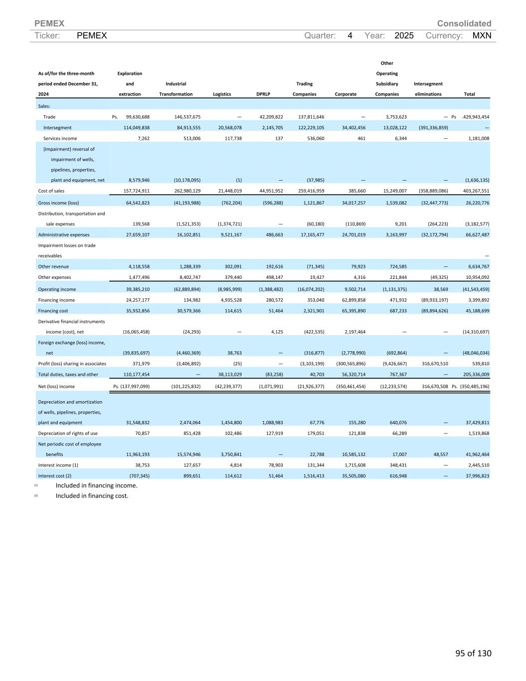 PEMEX Consolidated Ticker: PEMEX Quarter: 4 Year: 2025 Currency: MXN 95 of 130 As of/for the three-month period ended December 31, 2024 Exploration and extraction Industrial Transformation Logistics DPRLP Trading Companies Corporate Other Operating Subsidiary Companies Intersegment eliminations Total Sales: Trade Ps. 99,630,688 146,537,675 — 42,209,822 137,811,646 — 3,753,623 — Ps .429,943,454 Intersegment 114,049,838 84,913,555 20,568,078 2,145,705 122,229,105 34,402,456 13,028,122 (391,336,859) — Services income 7,262 513,006 117,738 137 536,060 461 6,344 — 1,181,008 (Impairment) reversal of impairment of wells, pipelines, properties, plant and equipment, net 8,579,946 (10,178,095) (1) — (37,985) — — — (1,636,135) Cost of sales 157,724,911 262,980,129 21,448,019 44,951,952 259,416,959 385,660 15,249,007 (358,889,086) 403,267,551 Gross income (loss) 64,542,823 (41,193,988) (762,204) (596,288) 1,121,867 34,017,257 1,539,082 (32,447,773) 26,220,776 Distribution, transportation and sale expenses 139,568 (1,521,353) (1,374,721) — (60,180) (110,869) 9,201 (264,223) (3,182,577) Administrative expenses 27,659,107 16,102,851 9,521,167 486,663 17,165,477 24,701,019 3,163,997 (32,172,794) 66,627,487 Impairment losses on trade receivables — Other revenue 4,118,558 1,288,339 302,091 192,616 (71,345) 79,923 724,585 — 6,634,767 Other expenses 1,477,496 8,402,747 379,440 498,147 19,427 4,316 221,844 (49,325) 10,954,092 Operating income 39,385,210 (62,889,894) (8,985,999) (1,388,482) (16,074,202) 9,502,714 (1,131,375) 38,569 (41,543,459) Financing income 24,257,177 134,982 4,935,528 280,572 353,040 62,899,858 471,932 (89,933,197) 3,399,892 Financing cost 35,932,856 30,579,366 114,615 51,464 2,321,901 65,395,890 687,233 (89,894,626) 45,188,699 Derivative financial instruments income (cost), net (16,065,458) (24,293) — 4,125 (422,535) 2,197,464 — — (14,310,697) Foreign exchange (loss) income, net (39,835,697) (4,460,369) 38,763 — (316,877) (2,778,990) (692,864) — (48,046,034) Profit (loss) sharing in associates 371,979 (3,406,892) (25) — (3,103,199) (300,565,896) (9,426,667) 316,670,510 539,810 Total duties, taxes and other 110,177,454 — 38,113,029 (83,258) 40,703 56,320,714 767,367 — 205,336,009 Net (loss) income Ps. (137,997,099) (101,225,832) (42,239,377) (1,071,991) (21,926,377) (350,461,454) (12,233,574) 316,670,508 Ps. (350,485,196) Depreciation and amortization of wells, pipelines, properties, plant and equipment 31,548,832 2,474,064 1,454,800 1,088,983 67,776 155,280 640,076 — 37,429,811 Depreciation of rights of use 70,857 851,428 102,486 127,919 179,051 121,838 66,289 — 1,519,868 Net periodic cost of employee benefits 11,963,193 15,574,946 3,750,841 — 22,788 10,585,132 17,007 48,557 41,962,464 Interest income (1) 38,753 127,657 4,814 78,903 131,344 1,715,608 348,431 — 2,445,510 Interest cost (2) (707,345) 899,651 114,612 51,464 1,516,413 35,505,080 616,948 — 37,996,823 (1) Included in financing income. (2) Included in financing cost.