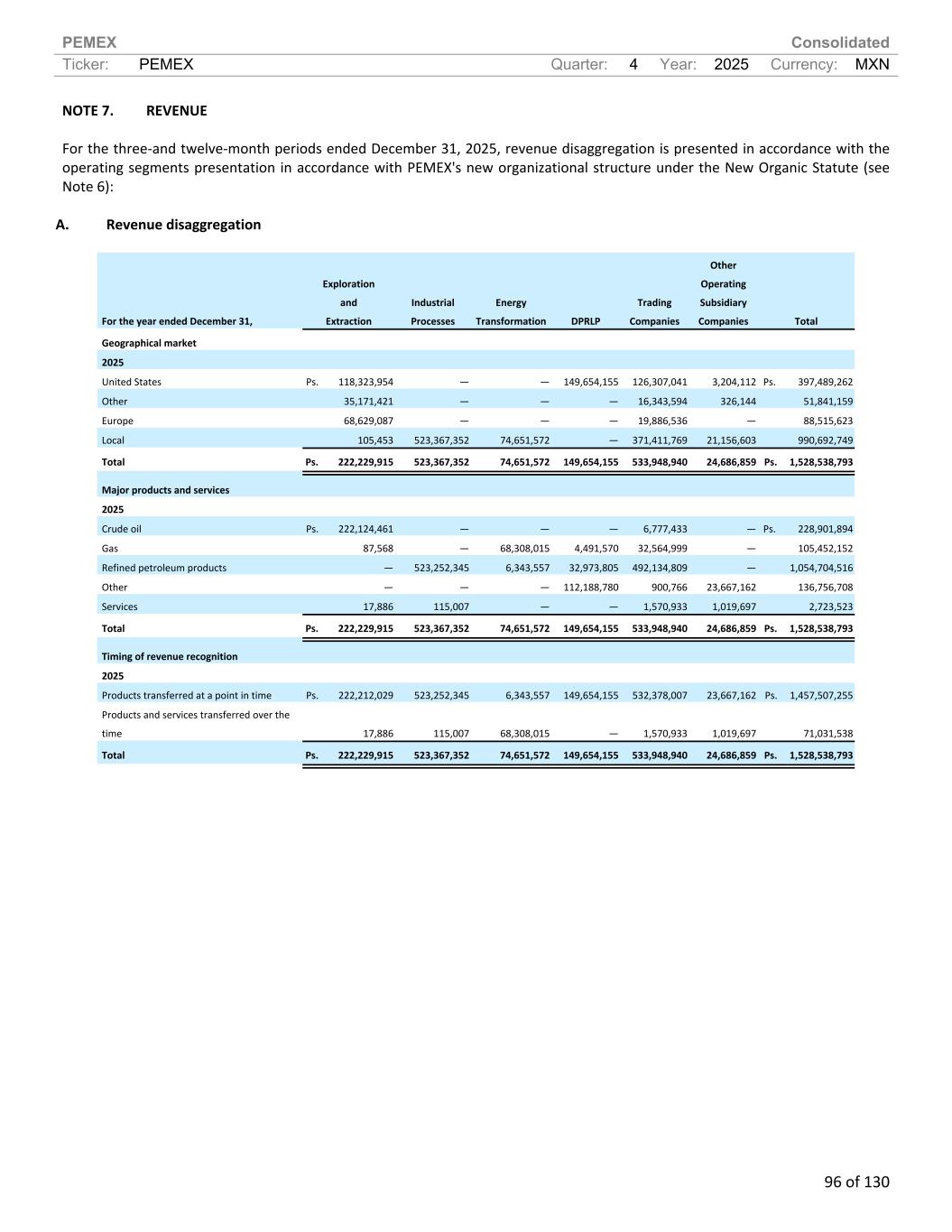 PEMEX Consolidated Ticker: PEMEX Quarter: 4 Year: 2025 Currency: MXN 96 of 130 NOTE 7. REVENUE For the three-and twelve-month periods ended December 31, 2025, revenue disaggregation is presented in accordance with the operating segments presentation in accordance with PEMEX's new organizational structure under the New Organic Statute (see Note 6): A. Revenue disaggregation For the year ended December 31, Exploration and Extraction Industrial Processes Energy Transformation DPRLP Trading Companies Other Operating Subsidiary Companies Total Geographical market 2025 United States Ps. 118,323,954 — — 149,654,155 126,307,041 3,204,112 Ps. 397,489,262 Other 35,171,421 — — — 16,343,594 326,144 51,841,159 Europe 68,629,087 — — — 19,886,536 — 88,515,623 Local 105,453 523,367,352 74,651,572 — 371,411,769 21,156,603 990,692,749 Total Ps. 222,229,915 523,367,352 74,651,572 149,654,155 533,948,940 24,686,859 Ps. 1,528,538,793 Major products and services 2025 Crude oil Ps. 222,124,461 — — — 6,777,433 — Ps. 228,901,894 Gas 87,568 — 68,308,015 4,491,570 32,564,999 — 105,452,152 Refined petroleum products — 523,252,345 6,343,557 32,973,805 492,134,809 — 1,054,704,516 Other — — — 112,188,780 900,766 23,667,162 136,756,708 Services 17,886 115,007 — — 1,570,933 1,019,697 2,723,523 Total Ps. 222,229,915 523,367,352 74,651,572 149,654,155 533,948,940 24,686,859 Ps. 1,528,538,793 Timing of revenue recognition 2025 Products transferred at a point in time Ps. 222,212,029 523,252,345 6,343,557 149,654,155 532,378,007 23,667,162 Ps. 1,457,507,255 Products and services transferred over the time 17,886 115,007 68,308,015 — 1,570,933 1,019,697 71,031,538 Total Ps. 222,229,915 523,367,352 74,651,572 149,654,155 533,948,940 24,686,859 Ps. 1,528,538,793