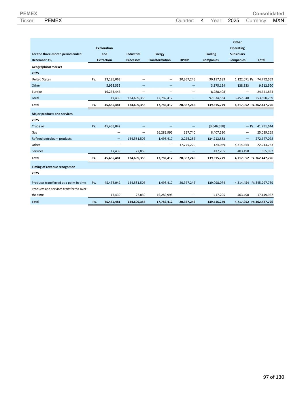 PEMEX Consolidated Ticker: PEMEX Quarter: 4 Year: 2025 Currency: MXN 97 of 130 For the three-month period ended December 31, Exploration and Extraction Industrial Processes Energy Transformation DPRLP Trading Companies Other Operating Subsidiary Companies Total Geographical market 2025 United States Ps. 23,186,063 — — 20,367,246 30,117,183 1,122,071 Ps. 74,792,563 Other 5,998,533 — — — 3,175,154 138,833 9,312,520 Europe 16,253,446 — — — 8,288,408 — 24,541,854 Local 17,439 134,609,356 17,782,412 — 97,934,534 3,457,048 253,800,789 Total Ps. 45,455,481 134,609,356 17,782,412 20,367,246 139,515,279 4,717,952 Ps. 362,447,726 Major products and services 2025 Crude oil Ps. 45,438,042 — — — (3,646,398) — Ps. 41,791,644 Gas — — 16,283,995 337,740 8,407,530 — 25,029,265 Refined petroleum products — 134,581,506 1,498,417 2,254,286 134,212,883 — 272,547,092 Other — — — 17,775,220 124,059 4,314,454 22,213,733 Services 17,439 27,850 — — 417,205 403,498 865,992 Total Ps. 45,455,481 134,609,356 17,782,412 20,367,246 139,515,279 4,717,952 Ps. 362,447,726 Timing of revenue recognition 2025 Products transferred at a point in time Ps. 45,438,042 134,581,506 1,498,417 20,367,246 139,098,074 4,314,454 Ps.345,297,739 Products and services transferred over the time 17,439 27,850 16,283,995 — 417,205 403,498 17,149,987 Total Ps. 45,455,481 134,609,356 17,782,412 20,367,246 139,515,279 4,717,952 Ps.362,447,726