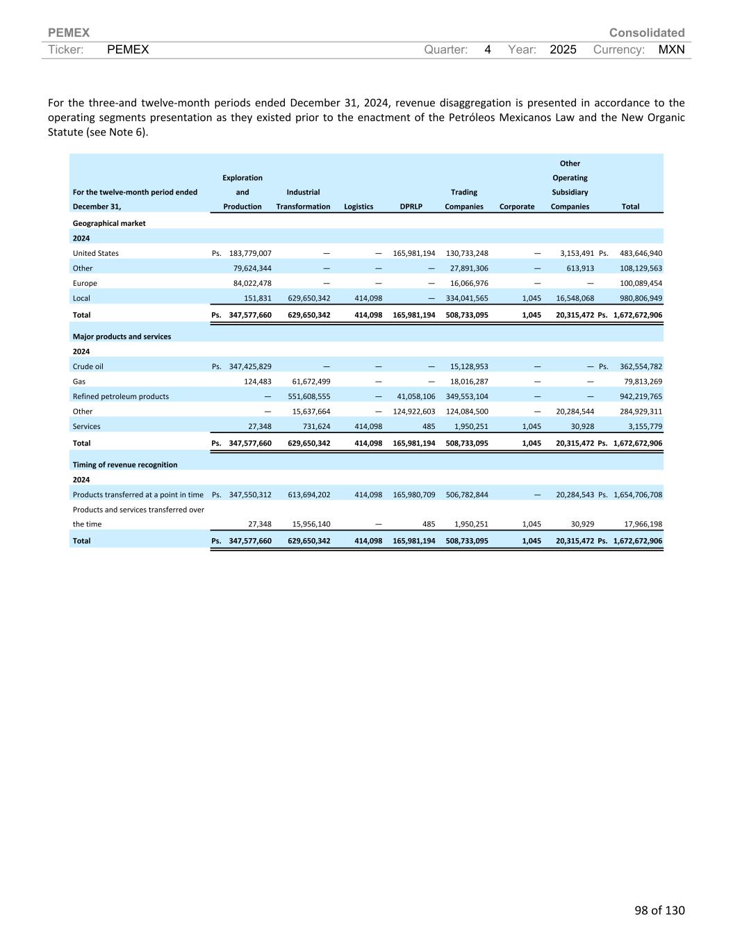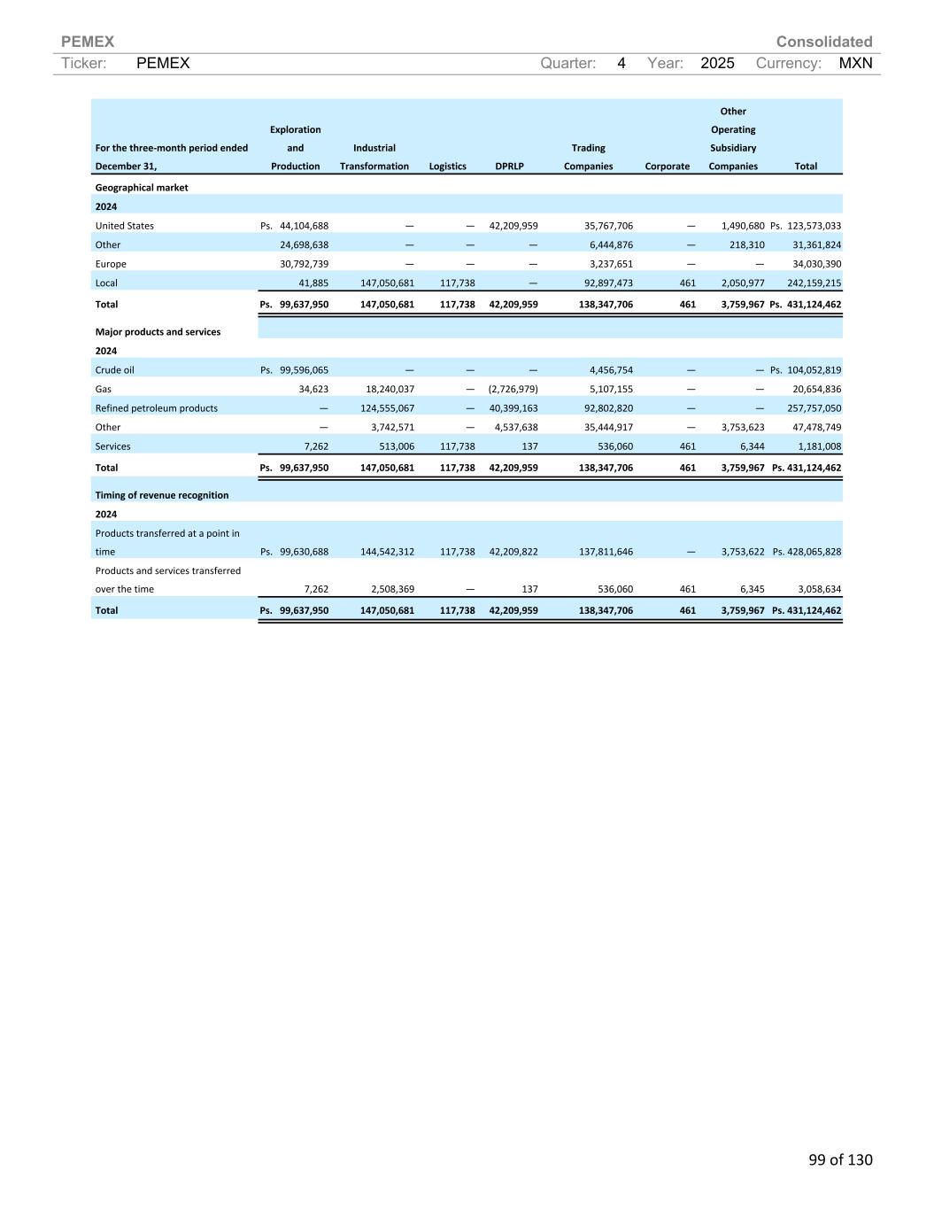 PEMEX Consolidated Ticker: PEMEX Quarter: 4 Year: 2025 Currency: MXN 99 of 130 For the three-month period ended December 31, Exploration and Production Industrial Transformation Logistics DPRLP Trading Companies Corporate Other Operating Subsidiary Companies Total Geographical market 2024 United States Ps. 44,104,688 — — 42,209,959 35,767,706 — 1,490,680 Ps. 123,573,033 Other 24,698,638 — — — 6,444,876 — 218,310 31,361,824 Europe 30,792,739 — — — 3,237,651 — — 34,030,390 Local 41,885 147,050,681 117,738 — 92,897,473 461 2,050,977 242,159,215 Total Ps. 99,637,950 147,050,681 117,738 42,209,959 138,347,706 461 3,759,967 Ps. 431,124,462 Major products and services 2024 Crude oil Ps. 99,596,065 — — — 4,456,754 — — Ps. 104,052,819 Gas 34,623 18,240,037 — (2,726,979) 5,107,155 — — 20,654,836 Refined petroleum products — 124,555,067 — 40,399,163 92,802,820 — — 257,757,050 Other — 3,742,571 — 4,537,638 35,444,917 — 3,753,623 47,478,749 Services 7,262 513,006 117,738 137 536,060 461 6,344 1,181,008 Total Ps. 99,637,950 147,050,681 117,738 42,209,959 138,347,706 461 3,759,967 Ps. 431,124,462 Timing of revenue recognition 2024 Products transferred at a point in time Ps. 99,630,688 144,542,312 117,738 42,209,822 137,811,646 — 3,753,622 Ps. 428,065,828 Products and services transferred over the time 7,262 2,508,369 — 137 536,060 461 6,345 3,058,634 Total Ps. 99,637,950 147,050,681 117,738 42,209,959 138,347,706 461 3,759,967 Ps. 431,124,462