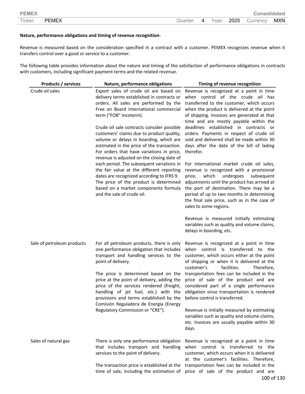 PEMEX Consolidated Ticker: PEMEX Quarter: 4 Year: 2025 Currency: MXN 100 of 130 Nature, performance obligations and timing of revenue recognition- Revenue is measured based on the consideration specified in a contract with a customer. PEMEX recognizes revenue when it transfers control over a good or service to a customer. The following table provides information about the nature and timing of the satisfaction of performance obligations in contracts with customers, including significant payment terms and the related revenue. Products / services Nature, performance obligations Timing of revenue recognition Crude oil sales Export sales of crude oil are based on delivery terms established in contracts or orders. All sales are performed by the Free on Board International commercial term (“FOB” Incoterm). Crude oil sale contracts consider possible customers’ claims due to product quality, volume or delays in boarding, which are estimated in the price of the transaction. For orders that have variations in price, revenue is adjusted on the closing date of each period. The subsequent variations in the fair value at the different reporting dates are recognized according to IFRS 9. The price of the product is determined based on a market components formula and the sale of crude oil. Revenue is recognized at a point in time when control of the crude oil has transferred to the customer, which occurs when the product is delivered at the point of shipping. Invoices are generated at that time and are mostly payable within the deadlines established in contracts or orders. Payments in respect of crude oil sold and delivered shall be made within 30 days after the date of the bill of lading therefor. For international market crude oil sales, revenue is recognized with a provisional price, which undergoes subsequent adjustments until the product has arrived at the port of destination. There may be a period of up to two months in determining the final sale price, such as in the case of sales to some regions. Revenue is measured initially estimating variables such as quality and volume claims, delays in boarding, etc. Sale of petroleum products For all petroleum products, there is only one performance obligation that includes transport and handling services to the point of delivery. The price is determined based on the price at the point of delivery, adding the price of the services rendered (freight, handling of jet fuel, etc.) with the provisions and terms established by the Comisión Reguladora de Energía (Energy Regulatory Commission or “CRE”). Revenue is recognized at a point in time when control is transferred to the customer, which occurs either at the point of shipping or when it is delivered at the customer’s facilities. Therefore, transportation fees can be included in the price of sale of the product and are considered part of a single performance obligation since transportation is rendered before control is transferred. Revenue is initially measured by estimating variables such as quality and volume claims, etc. Invoices are usually payable within 30 days. Sales of natural gas There is only one performance obligation that includes transport and handling services to the point of delivery. The transaction price is established at the time of sale, including the estimation of Revenue is recognized at a point in time when control is transferred to the customer, which occurs when it is delivered at the customer’s facilities. Therefore, transportation fees can be included in the price of sale of the product and are
