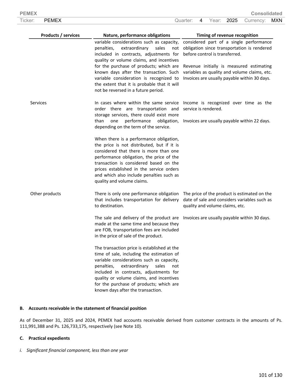 PEMEX Consolidated Ticker: PEMEX Quarter: 4 Year: 2025 Currency: MXN 101 of 130 Products / services Nature, performance obligations Timing of revenue recognition variable considerations such as capacity, penalties, extraordinary sales not included in contracts, adjustments for quality or volume claims, and incentives for the purchase of products; which are known days after the transaction. Such variable consideration is recognized to the extent that it is probable that it will not be reversed in a future period. considered part of a single performance obligation since transportation is rendered before control is transferred. Revenue initially is measured estimating variables as quality and volume claims, etc. Invoices are usually payable within 30 days. Services In cases where within the same service order there are transportation and storage services, there could exist more than one performance obligation, depending on the term of the service. When there is a performance obligation, the price is not distributed, but if it is considered that there is more than one performance obligation, the price of the transaction is considered based on the prices established in the service orders and which also include penalties such as quality and volume claims. Income is recognized over time as the service is rendered. Invoices are usually payable within 22 days. Other products There is only one performance obligation that includes transportation for delivery to destination. The sale and delivery of the product are made at the same time and because they are FOB, transportation fees are included in the price of sale of the product. The transaction price is established at the time of sale, including the estimation of variable considerations such as capacity, penalties, extraordinary sales not included in contracts, adjustments for quality or volume claims, and incentives for the purchase of products; which are known days after the transaction. The price of the product is estimated on the date of sale and considers variables such as quality and volume claims, etc. Invoices are usually payable within 30 days. B. Accounts receivable in the statement of financial position As of December 31, 2025 and 2024, PEMEX had accounts receivable derived from customer contracts in the amounts of Ps. 111,991,388 and Ps. 126,733,175, respectively (see Note 10). C. Practical expedients i. Significant financial component, less than one year