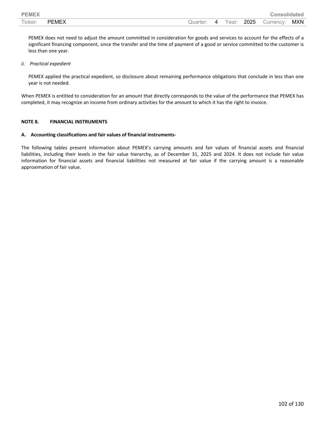 PEMEX Consolidated Ticker: PEMEX Quarter: 4 Year: 2025 Currency: MXN 102 of 130 PEMEX does not need to adjust the amount committed in consideration for goods and services to account for the effects of a significant financing component, since the transfer and the time of payment of a good or service committed to the customer is less than one year. ii. Practical expedient PEMEX applied the practical expedient, so disclosure about remaining performance obligations that conclude in less than one year is not needed. When PEMEX is entitled to consideration for an amount that directly corresponds to the value of the performance that PEMEX has completed, it may recognize an income from ordinary activities for the amount to which it has the right to invoice. NOTE 8. FINANCIAL INSTRUMENTS A. Accounting classifications and fair values of financial instruments- The following tables present information about PEMEX’s carrying amounts and fair values of financial assets and financial liabilities, including their levels in the fair value hierarchy, as of December 31, 2025 and 2024. It does not include fair value information for financial assets and financial liabilities not measured at fair value if the carrying amount is a reasonable approximation of fair value.