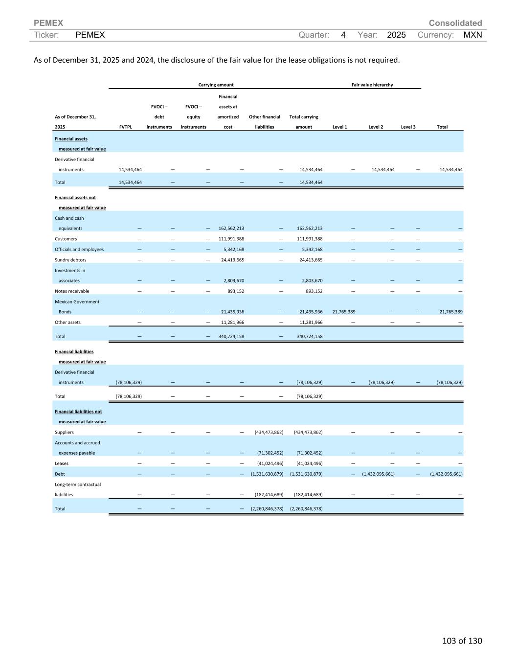 PEMEX Consolidated Ticker: PEMEX Quarter: 4 Year: 2025 Currency: MXN 103 of 130 As of December 31, 2025 and 2024, the disclosure of the fair value for the lease obligations is not required. Carrying amount Fair value hierarchy As of December 31, 2025 FVTPL FVOCI – debt instruments FVOCI – equity instruments Financial assets at amortized cost Other financial liabilities Total carrying amount Level 1 Level 2 Level 3 Total Financial assets measured at fair value Derivative financial instruments 14,534,464 — — — — 14,534,464 — 14,534,464 — 14,534,464 Total 14,534,464 — — — — 14,534,464 Financial assets not measured at fair value Cash and cash equivalents — — — 162,562,213 — 162,562,213 — — — — Customers — — — 111,991,388 — 111,991,388 — — — — Officials and employees — — — 5,342,168 — 5,342,168 — — — — Sundry debtors — — — 24,413,665 — 24,413,665 — — — — Investments in associates — — — 2,803,670 — 2,803,670 — — — — Notes receivable — — — 893,152 — 893,152 — — — — Mexican Government Bonds — — — 21,435,936 — 21,435,936 21,765,389 — — 21,765,389 Other assets — — — 11,281,966 — 11,281,966 — — — — Total — — — 340,724,158 — 340,724,158 Financial liabilities measured at fair value Derivative financial instruments (78,106,329) — — — — (78,106,329) — (78,106,329) — (78,106,329) Total (78,106,329) — — — — (78,106,329) Financial liabilities not measured at fair value Suppliers — — — — (434,473,862) (434,473,862) — — — — Accounts and accrued expenses payable — — — — (71,302,452) (71,302,452) — — — — Leases — — — — (41,024,496) (41,024,496) — — — — Debt — — — — (1,531,630,879) (1,531,630,879) — (1,432,095,661) — (1,432,095,661) Long-term contractual liabilities — — — — (182,414,689) (182,414,689) — — — — Total — — — — (2,260,846,378) (2,260,846,378)
