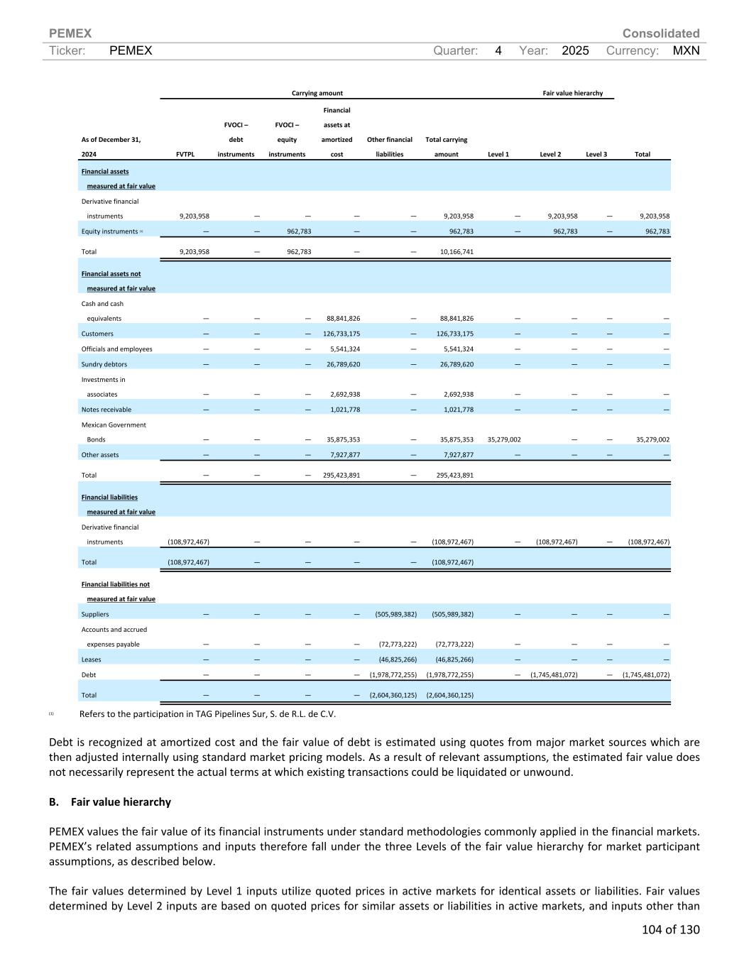 PEMEX Consolidated Ticker: PEMEX Quarter: 4 Year: 2025 Currency: MXN 104 of 130 Carrying amount Fair value hierarchy As of December 31, 2024 FVTPL FVOCI – debt instruments FVOCI – equity instruments Financial assets at amortized cost Other financial liabilities Total carrying amount Level 1 Level 2 Level 3 Total Financial assets measured at fair value Derivative financial instruments 9,203,958 — — — — 9,203,958 — 9,203,958 — 9,203,958 Equity instruments (1) — — 962,783 — — 962,783 — 962,783 — 962,783 Total 9,203,958 — 962,783 — — 10,166,741 Financial assets not measured at fair value Cash and cash equivalents — — — 88,841,826 — 88,841,826 — — — — Customers — — — 126,733,175 — 126,733,175 — — — — Officials and employees — — — 5,541,324 — 5,541,324 — — — — Sundry debtors — — — 26,789,620 — 26,789,620 — — — — Investments in associates — — — 2,692,938 — 2,692,938 — — — — Notes receivable — — — 1,021,778 — 1,021,778 — — — — Mexican Government Bonds — — — 35,875,353 — 35,875,353 35,279,002 — — 35,279,002 Other assets — — — 7,927,877 — 7,927,877 — — — — Total — — — 295,423,891 — 295,423,891 Financial liabilities measured at fair value Derivative financial instruments (108,972,467) — — — — (108,972,467) — (108,972,467) — (108,972,467) Total (108,972,467) — — — — (108,972,467) Financial liabilities not measured at fair value Suppliers — — — — (505,989,382) (505,989,382) — — — — Accounts and accrued expenses payable — — — — (72,773,222) (72,773,222) — — — — Leases — — — — (46,825,266) (46,825,266) — — — — Debt — — — — (1,978,772,255) (1,978,772,255) — (1,745,481,072) — (1,745,481,072) Total — — — — (2,604,360,125) (2,604,360,125) (1) Refers to the participation in TAG Pipelines Sur, S. de R.L. de C.V. Debt is recognized at amortized cost and the fair value of debt is estimated using quotes from major market sources which are then adjusted internally using standard market pricing models. As a result of relevant assumptions, the estimated fair value does not necessarily represent the actual terms at which existing transactions could be liquidated or unwound. B. Fair value hierarchy PEMEX values the fair value of its financial instruments under standard methodologies commonly applied in the financial markets. PEMEX’s related assumptions and inputs therefore fall under the three Levels of the fair value hierarchy for market participant assumptions, as described below. The fair values determined by Level 1 inputs utilize quoted prices in active markets for identical assets or liabilities. Fair values determined by Level 2 inputs are based on quoted prices for similar assets or liabilities in active markets, and inputs other than
