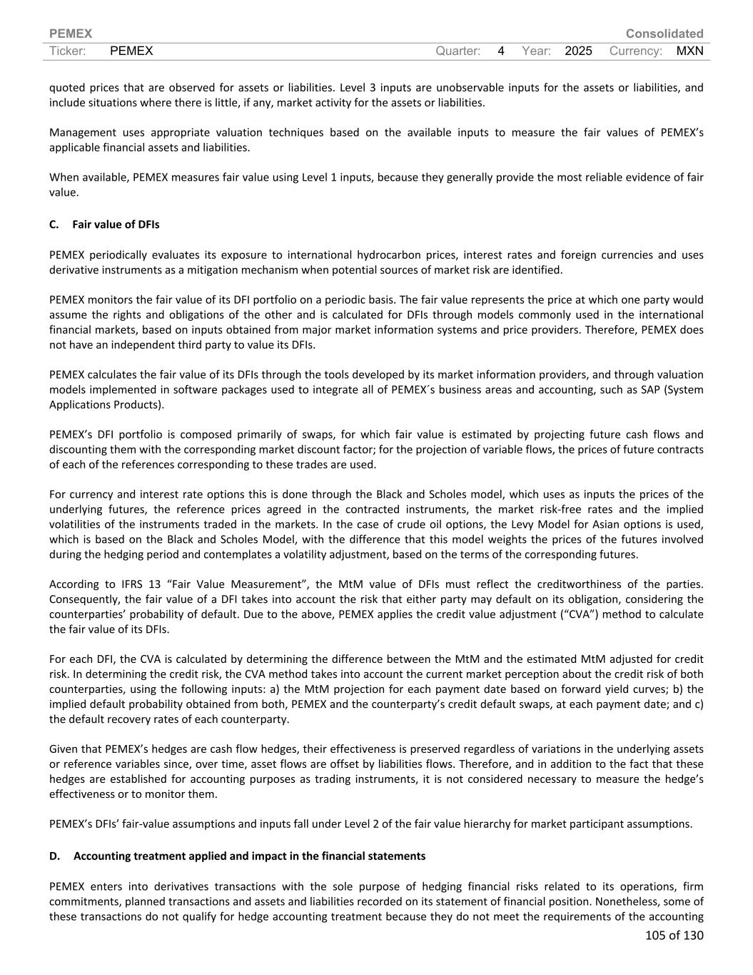 PEMEX Consolidated Ticker: PEMEX Quarter: 4 Year: 2025 Currency: MXN 105 of 130 quoted prices that are observed for assets or liabilities. Level 3 inputs are unobservable inputs for the assets or liabilities, and include situations where there is little, if any, market activity for the assets or liabilities. Management uses appropriate valuation techniques based on the available inputs to measure the fair values of PEMEX’s applicable financial assets and liabilities. When available, PEMEX measures fair value using Level 1 inputs, because they generally provide the most reliable evidence of fair value. C. Fair value of DFIs PEMEX periodically evaluates its exposure to international hydrocarbon prices, interest rates and foreign currencies and uses derivative instruments as a mitigation mechanism when potential sources of market risk are identified. PEMEX monitors the fair value of its DFI portfolio on a periodic basis. The fair value represents the price at which one party would assume the rights and obligations of the other and is calculated for DFIs through models commonly used in the international financial markets, based on inputs obtained from major market information systems and price providers. Therefore, PEMEX does not have an independent third party to value its DFIs. PEMEX calculates the fair value of its DFIs through the tools developed by its market information providers, and through valuation models implemented in software packages used to integrate all of PEMEX´s business areas and accounting, such as SAP (System Applications Products). PEMEX’s DFI portfolio is composed primarily of swaps, for which fair value is estimated by projecting future cash flows and discounting them with the corresponding market discount factor; for the projection of variable flows, the prices of future contracts of each of the references corresponding to these trades are used. For currency and interest rate options this is done through the Black and Scholes model, which uses as inputs the prices of the underlying futures, the reference prices agreed in the contracted instruments, the market risk-free rates and the implied volatilities of the instruments traded in the markets. In the case of crude oil options, the Levy Model for Asian options is used, which is based on the Black and Scholes Model, with the difference that this model weights the prices of the futures involved during the hedging period and contemplates a volatility adjustment, based on the terms of the corresponding futures. According to IFRS 13 “Fair Value Measurement”, the MtM value of DFIs must reflect the creditworthiness of the parties. Consequently, the fair value of a DFI takes into account the risk that either party may default on its obligation, considering the counterparties’ probability of default. Due to the above, PEMEX applies the credit value adjustment (“CVA”) method to calculate the fair value of its DFIs. For each DFI, the CVA is calculated by determining the difference between the MtM and the estimated MtM adjusted for credit risk. In determining the credit risk, the CVA method takes into account the current market perception about the credit risk of both counterparties, using the following inputs: a) the MtM projection for each payment date based on forward yield curves; b) the implied default probability obtained from both, PEMEX and the counterparty’s credit default swaps, at each payment date; and c) the default recovery rates of each counterparty. Given that PEMEX’s hedges are cash flow hedges, their effectiveness is preserved regardless of variations in the underlying assets or reference variables since, over time, asset flows are offset by liabilities flows. Therefore, and in addition to the fact that these hedges are established for accounting purposes as trading instruments, it is not considered necessary to measure the hedge’s effectiveness or to monitor them. PEMEX’s DFIs’ fair-value assumptions and inputs fall under Level 2 of the fair value hierarchy for market participant assumptions. D. Accounting treatment applied and impact in the financial statements PEMEX enters into derivatives transactions with the sole purpose of hedging financial risks related to its operations, firm commitments, planned transactions and assets and liabilities recorded on its statement of financial position. Nonetheless, some of these transactions do not qualify for hedge accounting treatment because they do not meet the requirements of the accounting