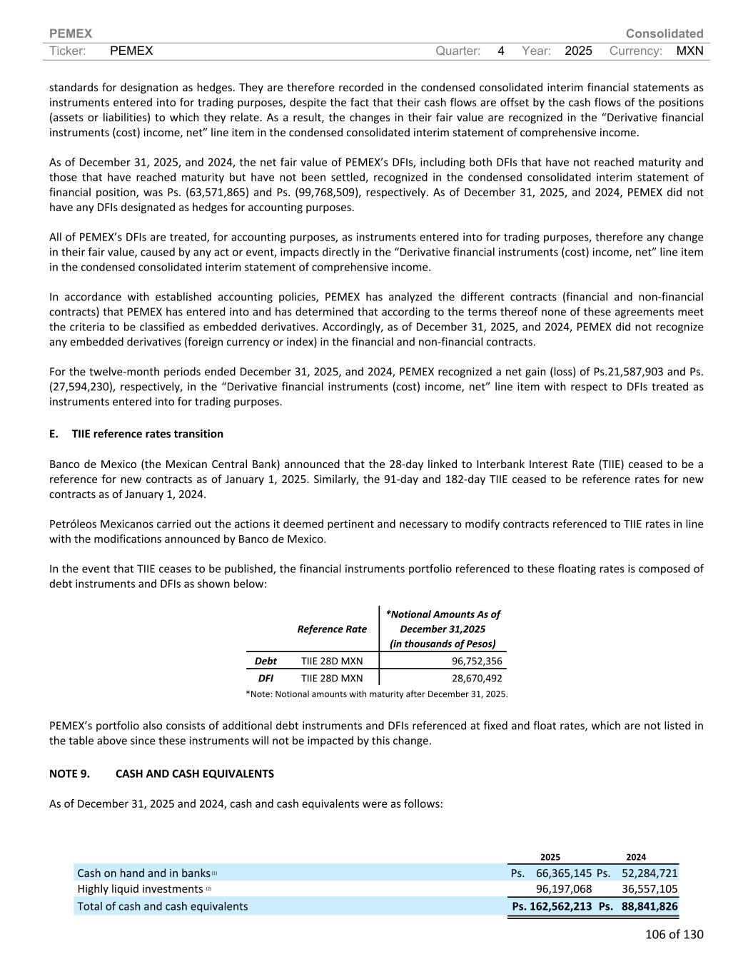 PEMEX Consolidated Ticker: PEMEX Quarter: 4 Year: 2025 Currency: MXN 106 of 130 standards for designation as hedges. They are therefore recorded in the condensed consolidated interim financial statements as instruments entered into for trading purposes, despite the fact that their cash flows are offset by the cash flows of the positions (assets or liabilities) to which they relate. As a result, the changes in their fair value are recognized in the “Derivative financial instruments (cost) income, net” line item in the condensed consolidated interim statement of comprehensive income. As of December 31, 2025, and 2024, the net fair value of PEMEX’s DFIs, including both DFIs that have not reached maturity and those that have reached maturity but have not been settled, recognized in the condensed consolidated interim statement of financial position, was Ps. (63,571,865) and Ps. (99,768,509), respectively. As of December 31, 2025, and 2024, PEMEX did not have any DFIs designated as hedges for accounting purposes. All of PEMEX’s DFIs are treated, for accounting purposes, as instruments entered into for trading purposes, therefore any change in their fair value, caused by any act or event, impacts directly in the “Derivative financial instruments (cost) income, net” line item in the condensed consolidated interim statement of comprehensive income. In accordance with established accounting policies, PEMEX has analyzed the different contracts (financial and non-financial contracts) that PEMEX has entered into and has determined that according to the terms thereof none of these agreements meet the criteria to be classified as embedded derivatives. Accordingly, as of December 31, 2025, and 2024, PEMEX did not recognize any embedded derivatives (foreign currency or index) in the financial and non-financial contracts. For the twelve-month periods ended December 31, 2025, and 2024, PEMEX recognized a net gain (loss) of Ps.21,587,903 and Ps. (27,594,230), respectively, in the “Derivative financial instruments (cost) income, net” line item with respect to DFIs treated as instruments entered into for trading purposes. E. TIIE reference rates transition Banco de Mexico (the Mexican Central Bank) announced that the 28-day linked to Interbank Interest Rate (TIIE) ceased to be a reference for new contracts as of January 1, 2025. Similarly, the 91-day and 182-day TIIE ceased to be reference rates for new contracts as of January 1, 2024. Petróleos Mexicanos carried out the actions it deemed pertinent and necessary to modify contracts referenced to TIIE rates in line with the modifications announced by Banco de Mexico. In the event that TIIE ceases to be published, the financial instruments portfolio referenced to these floating rates is composed of debt instruments and DFIs as shown below: Reference Rate *Notional Amounts As of December 31,2025 (in thousands of Pesos) Debt TIIE 28D MXN 96,752,356 DFI TIIE 28D MXN 28,670,492 *Note: Notional amounts with maturity after December 31, 2025. PEMEX’s portfolio also consists of additional debt instruments and DFIs referenced at fixed and float rates, which are not listed in the table above since these instruments will not be impacted by this change. NOTE 9. CASH AND CASH EQUIVALENTS As of December 31, 2025 and 2024, cash and cash equivalents were as follows: 2025 2024 Cash on hand and in banks (1) Ps. 66,365,145 Ps. 52,284,721 Highly liquid investments (2) 96,197,068 36,557,105 Total of cash and cash equivalents Ps. 162,562,213 Ps. 88,841,826