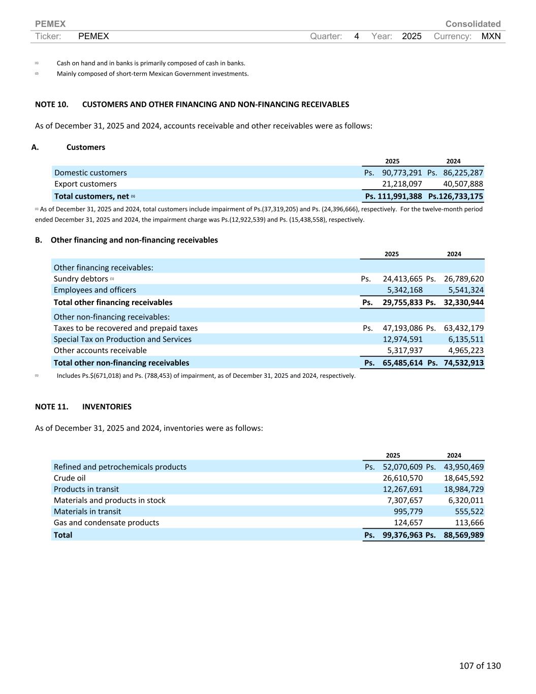 PEMEX Consolidated Ticker: PEMEX Quarter: 4 Year: 2025 Currency: MXN 107 of 130 (1) Cash on hand and in banks is primarily composed of cash in banks. (2) Mainly composed of short-term Mexican Government investments. NOTE 10. CUSTOMERS AND OTHER FINANCING AND NON-FINANCING RECEIVABLES As of December 31, 2025 and 2024, accounts receivable and other receivables were as follows: A. Customers 2025 2024 Domestic customers Ps. 90,773,291 Ps. 86,225,287 Export customers 21,218,097 40,507,888 Total customers, net (1) Ps. 111,991,388 Ps.126,733,175 (1) As of December 31, 2025 and 2024, total customers include impairment of Ps.(37,319,205) and Ps. (24,396,666), respectively. For the twelve-month period ended December 31, 2025 and 2024, the impairment charge was Ps.(12,922,539) and Ps. (15,438,558), respectively. B. Other financing and non-financing receivables 2025 2024 Other financing receivables: Sundry debtors (1) Ps. 24,413,665 Ps. 26,789,620 Employees and officers 5,342,168 5,541,324 Total other financing receivables Ps. 29,755,833 Ps. 32,330,944 Other non-financing receivables: Taxes to be recovered and prepaid taxes Ps. 47,193,086 Ps. 63,432,179 Special Tax on Production and Services 12,974,591 6,135,511 Other accounts receivable 5,317,937 4,965,223 Total other non-financing receivables Ps. 65,485,614 Ps. 74,532,913 (1) Includes Ps.$(671,018) and Ps. (788,453) of impairment, as of December 31, 2025 and 2024, respectively. NOTE 11. INVENTORIES As of December 31, 2025 and 2024, inventories were as follows: 2025 2024 Refined and petrochemicals products Ps. 52,070,609 Ps. 43,950,469 Crude oil 26,610,570 18,645,592 Products in transit 12,267,691 18,984,729 Materials and products in stock 7,307,657 6,320,011 Materials in transit 995,779 555,522 Gas and condensate products 124,657 113,666 Total Ps. 99,376,963 Ps. 88,569,989