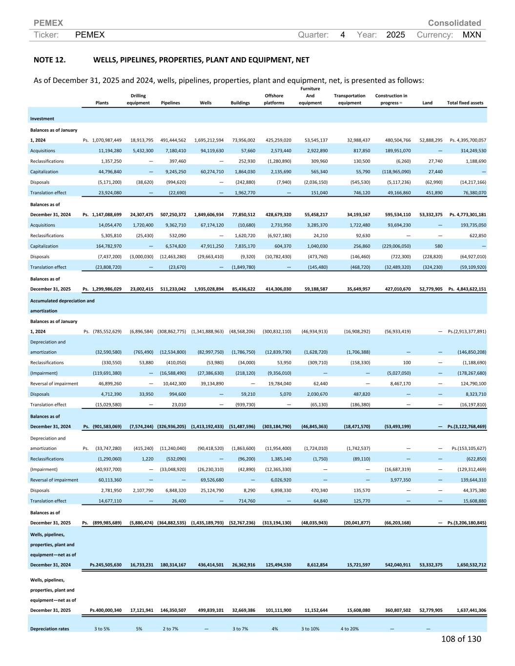 PEMEX Consolidated Ticker: PEMEX Quarter: 4 Year: 2025 Currency: MXN 108 of 130 NOTE 12. WELLS, PIPELINES, PROPERTIES, PLANT AND EQUIPMENT, NET As of December 31, 2025 and 2024, wells, pipelines, properties, plant and equipment, net, is presented as follows: Plants Drilling equipment Pipelines Wells Buildings Offshore platforms Furniture And equipment Transportation equipment Construction in progress (1) Land Total fixed assets Investment Balances as of January 1, 2024 Ps. 1,070,987,449 18,913,795 491,444,562 1,695,212,594 73,956,002 425,259,020 53,545,137 32,988,437 480,504,766 52,888,295 Ps. 4,395,700,057 Acquisitions 11,194,280 5,432,300 7,180,410 94,119,630 57,660 2,573,440 2,922,890 817,850 189,951,070 — 314,249,530 Reclassifications 1,357,250 — 397,460 — 252,930 (1,280,890) 309,960 130,500 (6,260) 27,740 1,188,690 Capitalization 44,796,840 — 9,245,250 60,274,710 1,864,030 2,135,690 565,340 55,790 (118,965,090) 27,440 — Disposals (5,171,200) (38,620) (994,620) — (242,880) (7,940) (2,036,150) (545,530) (5,117,236) (62,990) (14,217,166) Translation effect 23,924,080 — (22,690) — 1,962,770 — 151,040 746,120 49,166,860 451,890 76,380,070 Balances as of December 31, 2024 Ps. 1,147,088,699 24,307,475 507,250,372 1,849,606,934 77,850,512 428,679,320 55,458,217 34,193,167 595,534,110 53,332,375 Ps. 4,773,301,181 Acquisitions 14,054,470 1,720,400 9,362,710 67,174,120 (10,680) 2,731,950 3,285,370 1,722,480 93,694,230 — 193,735,050 Reclassifications 5,305,810 (25,430) 532,090 — 1,620,720 (6,927,180) 24,210 92,630 — — 622,850 Capitalization 164,782,970 — 6,574,820 47,911,250 7,835,170 604,370 1,040,030 256,860 (229,006,050) 580 — Disposals (7,437,200) (3,000,030) (12,463,280) (29,663,410) (9,320) (10,782,430) (473,760) (146,460) (722,300) (228,820) (64,927,010) Translation effect (23,808,720) — (23,670) — (1,849,780) — (145,480) (468,720) (32,489,320) (324,230) (59,109,920) Balances as of December 31, 2025 Ps. 1,299,986,029 23,002,415 511,233,042 1,935,028,894 85,436,622 414,306,030 59,188,587 35,649,957 427,010,670 52,779,905 Ps. 4,843,622,151 Accumulated depreciation and amortization Balances as of January 1, 2024 Ps. (785,552,629) (6,896,584) (308,862,775) (1,341,888,963) (48,568,206) (300,832,110) (46,934,913) (16,908,292) (56,933,419) — Ps.(2,913,377,891) Depreciation and amortization (32,590,580) (765,490) (12,534,800) (82,997,750) (1,786,750) (12,839,730) (1,628,720) (1,706,388) — — (146,850,208) Reclassifications (330,550) 53,880 (410,050) (53,980) (34,000) 53,950 (309,710) (158,330) 100 — (1,188,690) (Impairment) (119,691,380) — (16,588,490) (27,386,630) (218,120) (9,356,010) — — (5,027,050) — (178,267,680) Reversal of impairment 46,899,260 — 10,442,300 39,134,890 — 19,784,040 62,440 — 8,467,170 — 124,790,100 Disposals 4,712,390 33,950 994,600 — 59,210 5,070 2,030,670 487,820 — — 8,323,710 Translation effect (15,029,580) — 23,010 — (939,730) — (65,130) (186,380) — — (16,197,810) Balances as of December 31, 2024 Ps. (901,583,069) (7,574,244) (326,936,205) (1,413,192,433) (51,487,596) (303,184,790) (46,845,363) (18,471,570) (53,493,199) — Ps.(3,122,768,469) Depreciation and amortization Ps. (33,747,280) (415,240) (11,240,040) (90,418,520) (1,863,600) (11,954,400) (1,724,010) (1,742,537) — — Ps.(153,105,627) Reclassifications (1,290,060) 1,220 (532,090) — (96,200) 1,385,140 (1,750) (89,110) — — (622,850) (Impairment) (40,937,700) — (33,048,920) (26,230,310) (42,890) (12,365,330) — — (16,687,319) — (129,312,469) Reversal of impairment 60,113,360 — — 69,526,680 — 6,026,920 — — 3,977,350 — 139,644,310 Disposals 2,781,950 2,107,790 6,848,320 25,124,790 8,290 6,898,330 470,340 135,570 — — 44,375,380 Translation effect 14,677,110 — 26,400 — 714,760 — 64,840 125,770 — — 15,608,880 Balances as of December 31, 2025 Ps. (899,985,689) (5,880,474) (364,882,535) (1,435,189,793) (52,767,236) (313,194,130) (48,035,943) (20,041,877) (66,203,168) — Ps.(3,206,180,845) Wells, pipelines, properties, plant and equipment—net as of December 31, 2024 Ps.245,505,630 16,733,231 180,314,167 436,414,501 26,362,916 125,494,530 8,612,854 15,721,597 542,040,911 53,332,375 1,650,532,712 Wells, pipelines, properties, plant and equipment—net as of December 31, 2025 Ps.400,000,340 17,121,941 146,350,507 499,839,101 32,669,386 101,111,900 11,152,644 15,608,080 360,807,502 52,779,905 1,637,441,306 Depreciation rates 3 to 5% 5% 2 to 7% — 3 to 7% 4% 3 to 10% 4 to 20% — —