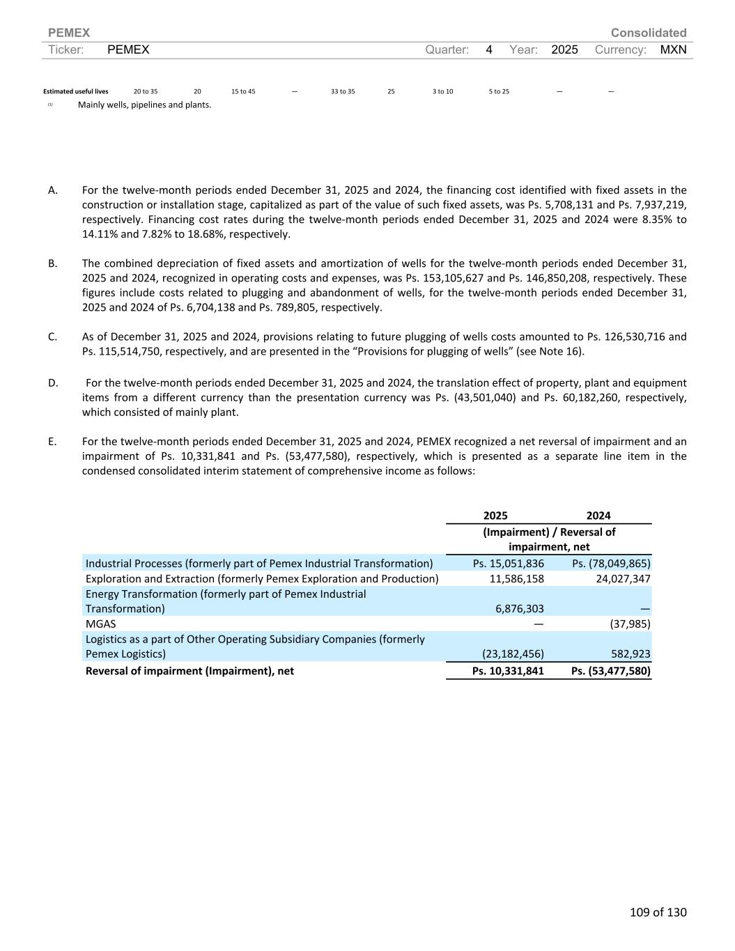 PEMEX Consolidated Ticker: PEMEX Quarter: 4 Year: 2025 Currency: MXN 109 of 130 Estimated useful lives 20 to 35 20 15 to 45 — 33 to 35 25 3 to 10 5 to 25 — — (1) Mainly wells, pipelines and plants. A. For the twelve-month periods ended December 31, 2025 and 2024, the financing cost identified with fixed assets in the construction or installation stage, capitalized as part of the value of such fixed assets, was Ps. 5,708,131 and Ps. 7,937,219, respectively. Financing cost rates during the twelve-month periods ended December 31, 2025 and 2024 were 8.35% to 14.11% and 7.82% to 18.68%, respectively. B. The combined depreciation of fixed assets and amortization of wells for the twelve-month periods ended December 31, 2025 and 2024, recognized in operating costs and expenses, was Ps. 153,105,627 and Ps. 146,850,208, respectively. These figures include costs related to plugging and abandonment of wells, for the twelve-month periods ended December 31, 2025 and 2024 of Ps. 6,704,138 and Ps. 789,805, respectively. C. As of December 31, 2025 and 2024, provisions relating to future plugging of wells costs amounted to Ps. 126,530,716 and Ps. 115,514,750, respectively, and are presented in the “Provisions for plugging of wells” (see Note 16). D. For the twelve-month periods ended December 31, 2025 and 2024, the translation effect of property, plant and equipment items from a different currency than the presentation currency was Ps. (43,501,040) and Ps. 60,182,260, respectively, which consisted of mainly plant. E. For the twelve-month periods ended December 31, 2025 and 2024, PEMEX recognized a net reversal of impairment and an impairment of Ps. 10,331,841 and Ps. (53,477,580), respectively, which is presented as a separate line item in the condensed consolidated interim statement of comprehensive income as follows: 2025 2024 (Impairment) / Reversal of impairment, net Industrial Processes (formerly part of Pemex Industrial Transformation) Ps. 15,051,836 Ps. (78,049,865) Exploration and Extraction (formerly Pemex Exploration and Production) 11,586,158 24,027,347 Energy Transformation (formerly part of Pemex Industrial Transformation) 6,876,303 — MGAS — (37,985) Logistics as a part of Other Operating Subsidiary Companies (formerly Pemex Logistics) (23,182,456) 582,923 Reversal of impairment (Impairment), net Ps. 10,331,841 Ps. (53,477,580)