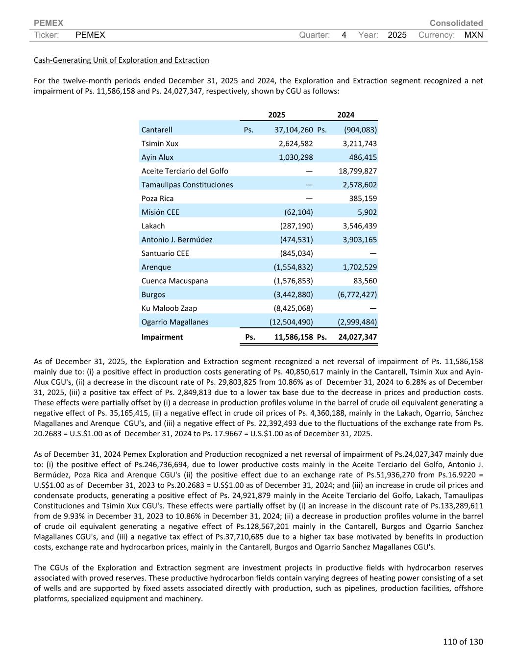 PEMEX Consolidated Ticker: PEMEX Quarter: 4 Year: 2025 Currency: MXN 110 of 130 Cash-Generating Unit of Exploration and Extraction For the twelve-month periods ended December 31, 2025 and 2024, the Exploration and Extraction segment recognized a net impairment of Ps. 11,586,158 and Ps. 24,027,347, respectively, shown by CGU as follows: 2025 2024 Cantarell Ps. 37,104,260 Ps. (904,083) Tsimin Xux 2,624,582 3,211,743 Ayin Alux 1,030,298 486,415 Aceite Terciario del Golfo — 18,799,827 Tamaulipas Constituciones — 2,578,602 Poza Rica — 385,159 Misión CEE (62,104) 5,902 Lakach (287,190) 3,546,439 Antonio J. Bermúdez (474,531) 3,903,165 Santuario CEE (845,034) — Arenque (1,554,832) 1,702,529 Cuenca Macuspana (1,576,853) 83,560 Burgos (3,442,880) (6,772,427) Ku Maloob Zaap (8,425,068) — Ogarrio Magallanes (12,504,490) (2,999,484) Impairment Ps. 11,586,158 Ps. 24,027,347 As of December 31, 2025, the Exploration and Extraction segment recognized a net reversal of impairment of Ps. 11,586,158 mainly due to: (i) a positive effect in production costs generating of Ps. 40,850,617 mainly in the Cantarell, Tsimin Xux and Ayin- Alux CGU's, (ii) a decrease in the discount rate of Ps. 29,803,825 from 10.86% as of December 31, 2024 to 6.28% as of December 31, 2025, (iii) a positive tax effect of Ps. 2,849,813 due to a lower tax base due to the decrease in prices and production costs. These effects were partially offset by (i) a decrease in production profiles volume in the barrel of crude oil equivalent generating a negative effect of Ps. 35,165,415, (ii) a negative effect in crude oil prices of Ps. 4,360,188, mainly in the Lakach, Ogarrio, Sánchez Magallanes and Arenque CGU's, and (iii) a negative effect of Ps. 22,392,493 due to the fluctuations of the exchange rate from Ps. 20.2683 = U.S.$1.00 as of December 31, 2024 to Ps. 17.9667 = U.S.$1.00 as of December 31, 2025. As of December 31, 2024 Pemex Exploration and Production recognized a net reversal of impairment of Ps.24,027,347 mainly due to: (i) the positive effect of Ps.246,736,694, due to lower productive costs mainly in the Aceite Terciario del Golfo, Antonio J. Bermúdez, Poza Rica and Arenque CGU's (ii) the positive effect due to an exchange rate of Ps.51,936,270 from Ps.16.9220 = U.S$1.00 as of December 31, 2023 to Ps.20.2683 = U.S$1.00 as of December 31, 2024; and (iii) an increase in crude oil prices and condensate products, generating a positive effect of Ps. 24,921,879 mainly in the Aceite Terciario del Golfo, Lakach, Tamaulipas Constituciones and Tsimin Xux CGU's. These effects were partially offset by (i) an increase in the discount rate of Ps.133,289,611 from de 9.93% in December 31, 2023 to 10.86% in December 31, 2024; (ii) a decrease in production profiles volume in the barrel of crude oil equivalent generating a negative effect of Ps.128,567,201 mainly in the Cantarell, Burgos and Ogarrio Sanchez Magallanes CGU's, and (iii) a negative tax effect of Ps.37,710,685 due to a higher tax base motivated by benefits in production costs, exchange rate and hydrocarbon prices, mainly in the Cantarell, Burgos and Ogarrio Sanchez Magallanes CGU's. The CGUs of the Exploration and Extraction segment are investment projects in productive fields with hydrocarbon reserves associated with proved reserves. These productive hydrocarbon fields contain varying degrees of heating power consisting of a set of wells and are supported by fixed assets associated directly with production, such as pipelines, production facilities, offshore platforms, specialized equipment and machinery.